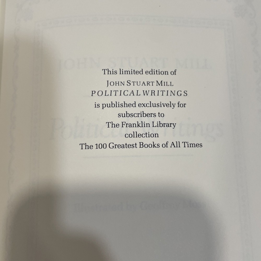 Political Writing By John Stuart Mill-1982 The Franklin Library. EUC Hardcover book with silk book marker.