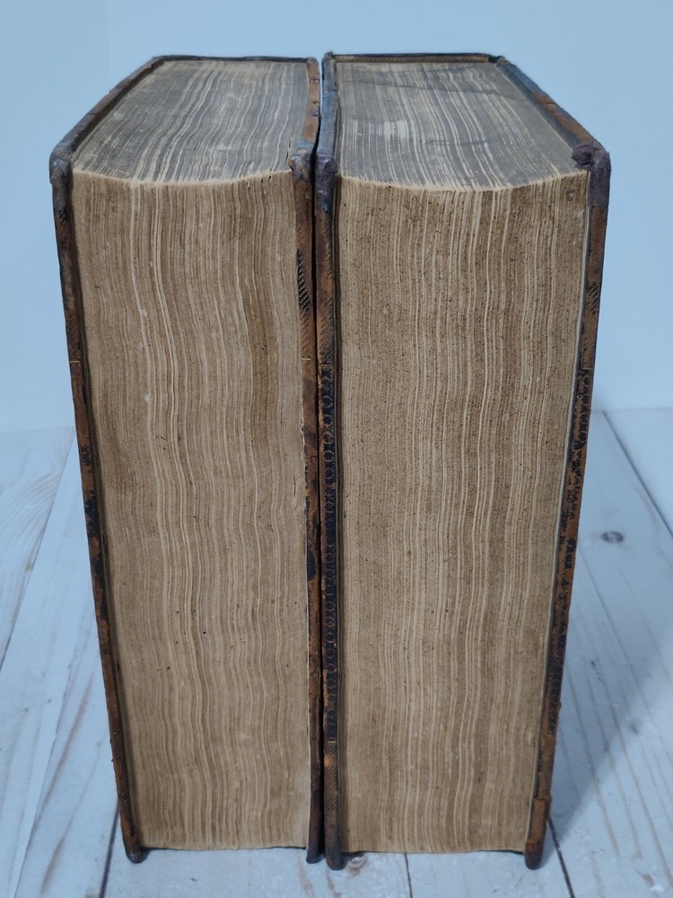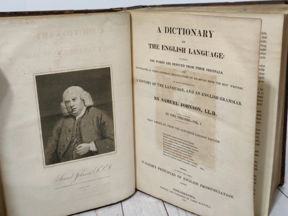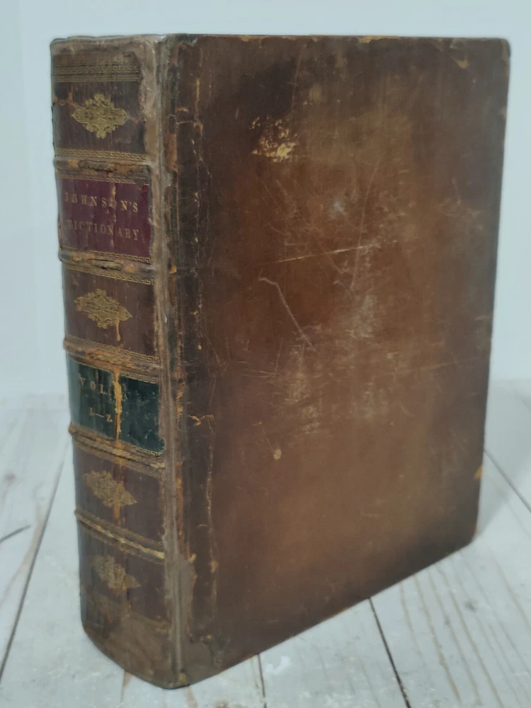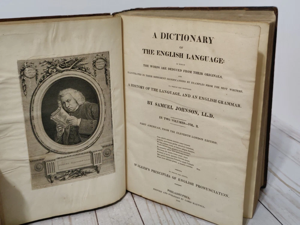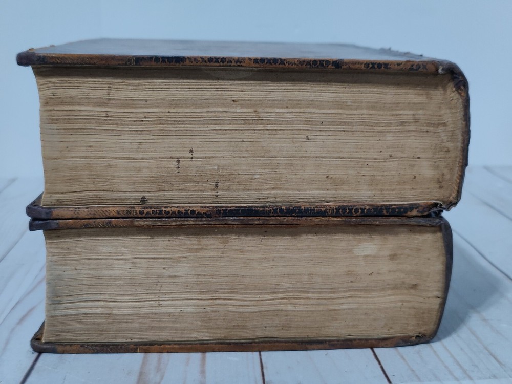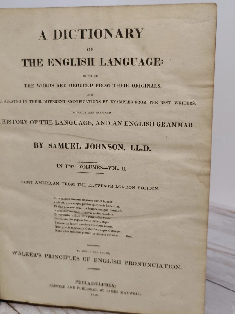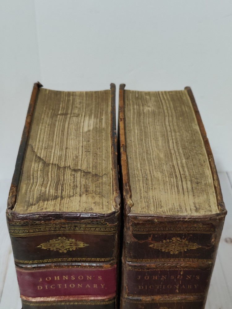 Johnson’s Dictionary of the English Language 1819 Volume 1 & 2 First American Edition. True collectors item. Appx 11x9x3.5". A dictionary of the English language in which the words are deduced from the originals, illustrated in their different significations by examples from the best writers. To which are prefixed a history of the language, and an English grammar. By Samuel Johnson, L.L.D. In two volumes. First American, from the eleventh London edition. To which are added, Walker's principles of English pronunciations. Philadelphia, printed and published by James Maxwell, 1819. Used, 200+ years old. Pretty good condition for age. Bindings seem to be strong and in tact. Noticeable wear, moisture staining, some stiff/warped pages. Leather has cracks, chipping, and scuffs/marks. Foxing throughout. All pages and words are legible, with some light fading in areas. 24 photos provided to show condition. Prior to purchasing, Please take the time to review the photos, zoom in, ask questions, and let me know if you would like any additional photos. These are sold as is. Will be shipped USPS Priority Mail with Signature Confirmation for Delivery.