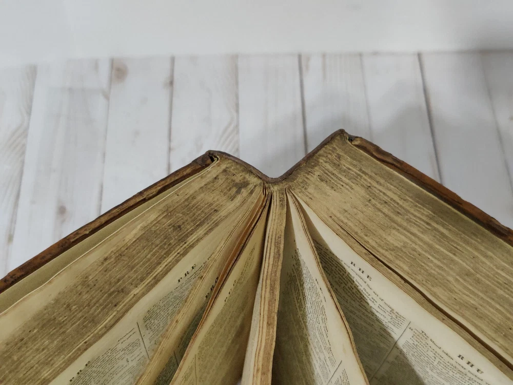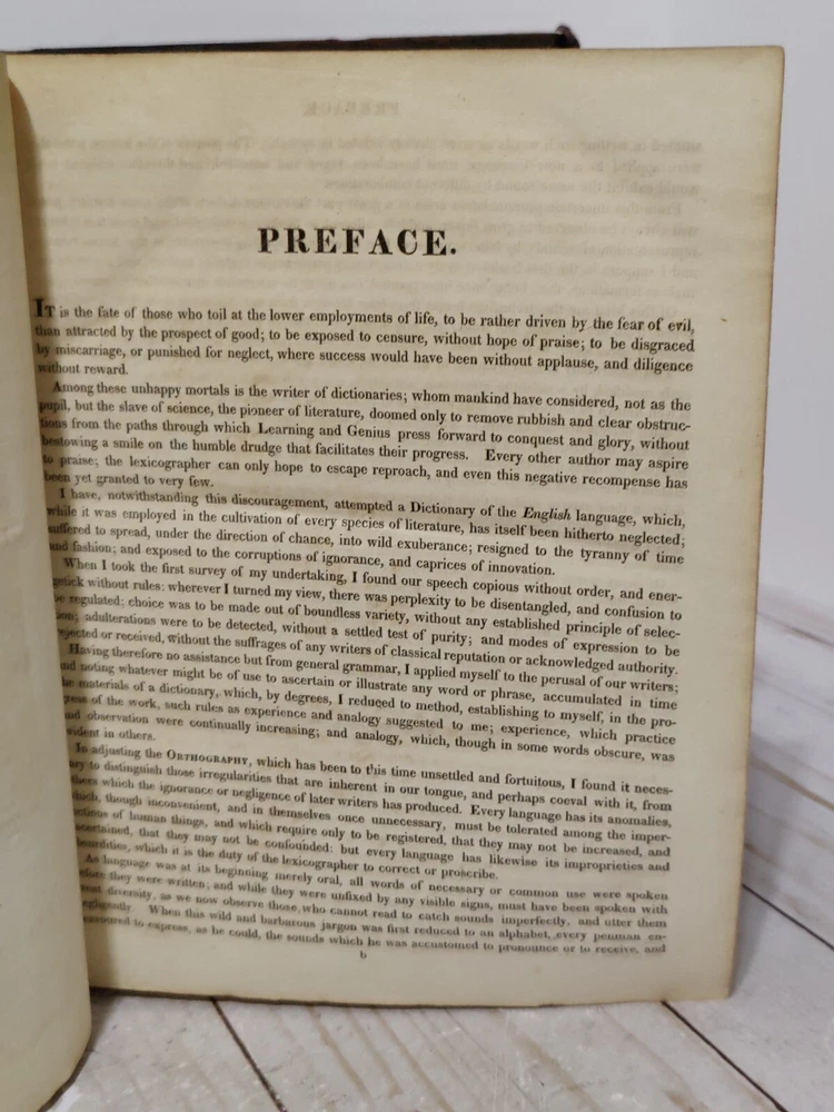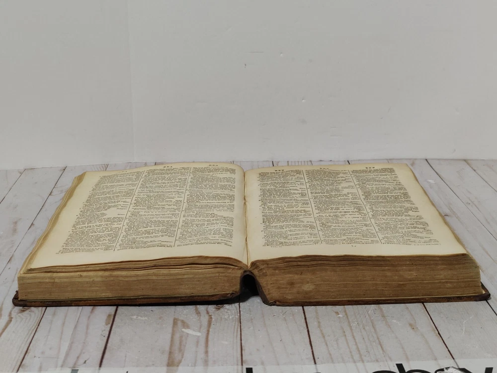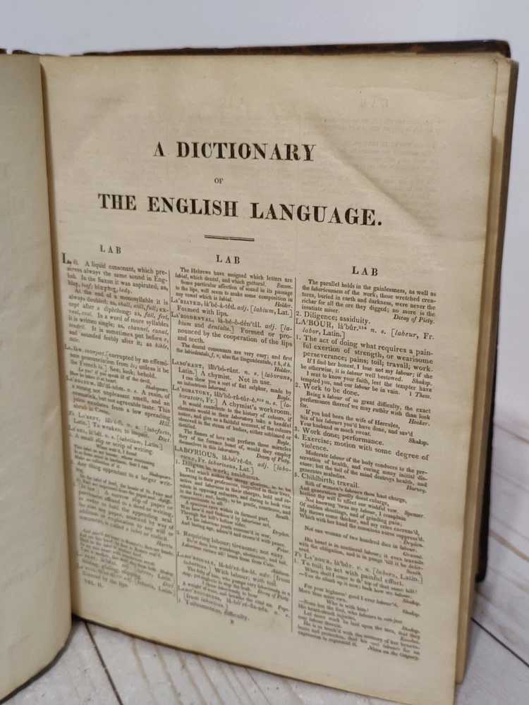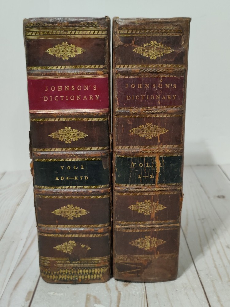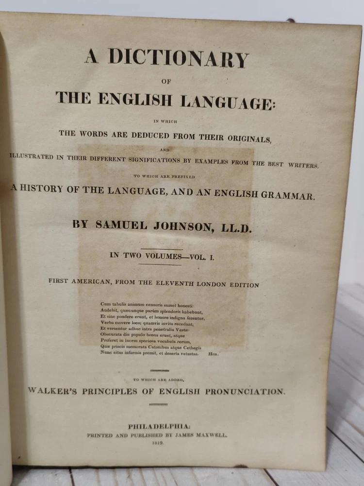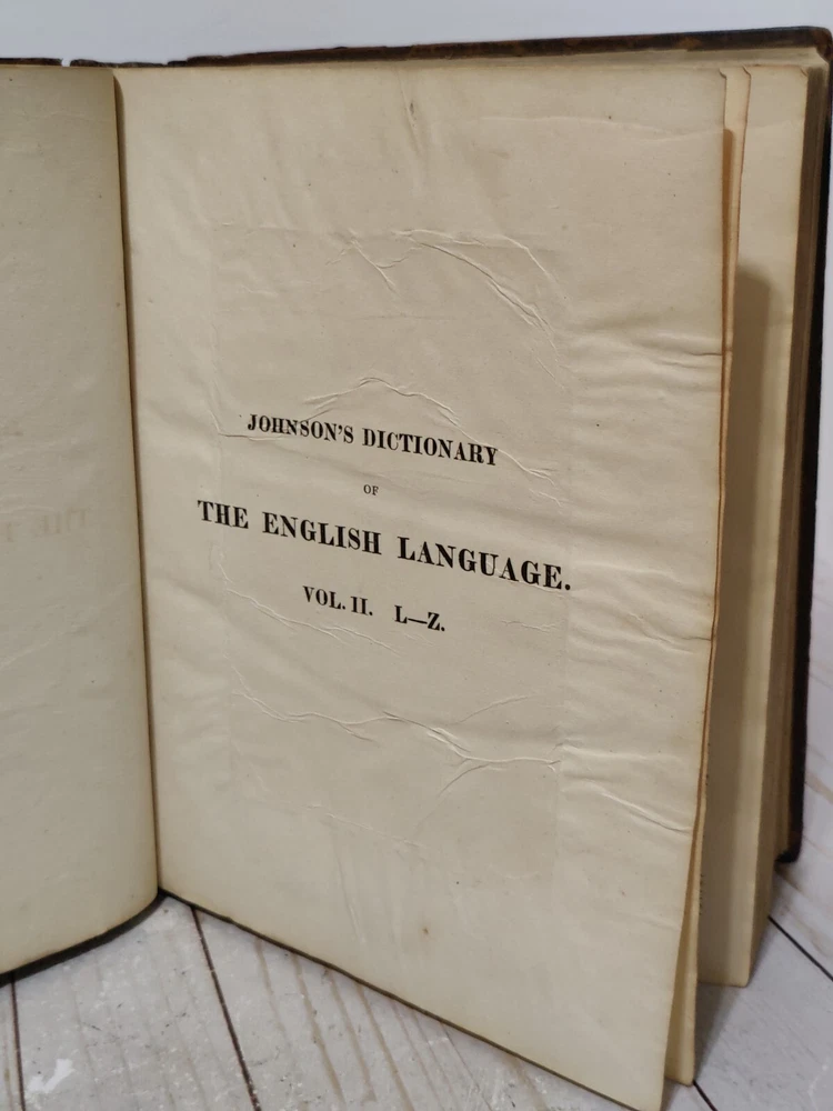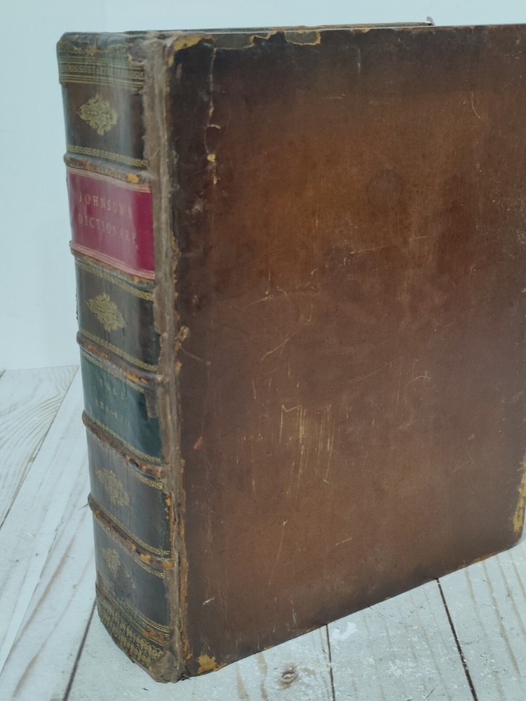 Johnson’s Dictionary of the English Language 1819 Volume 1 & 2 First American Edition. True collectors item. Appx 11x9x3.5". A dictionary of the English language in which the words are deduced from the originals, illustrated in their different significations by examples from the best writers. To which are prefixed a history of the language, and an English grammar. By Samuel Johnson, L.L.D. In two volumes. First American, from the eleventh London edition. To which are added, Walker's principles of English pronunciations. Philadelphia, printed and published by James Maxwell, 1819. Used, 200+ years old. Pretty good condition for age. Bindings seem to be strong and in tact. Noticeable wear, moisture staining, some stiff/warped pages. Leather has cracks, chipping, and scuffs/marks. Foxing throughout. All pages and words are legible, with some light fading in areas. 24 photos provided to show condition. Prior to purchasing, Please take the time to review the photos, zoom in, ask questions, and let me know if you would like any additional photos. These are sold as is. Will be shipped USPS Priority Mail with Signature Confirmation for Delivery.