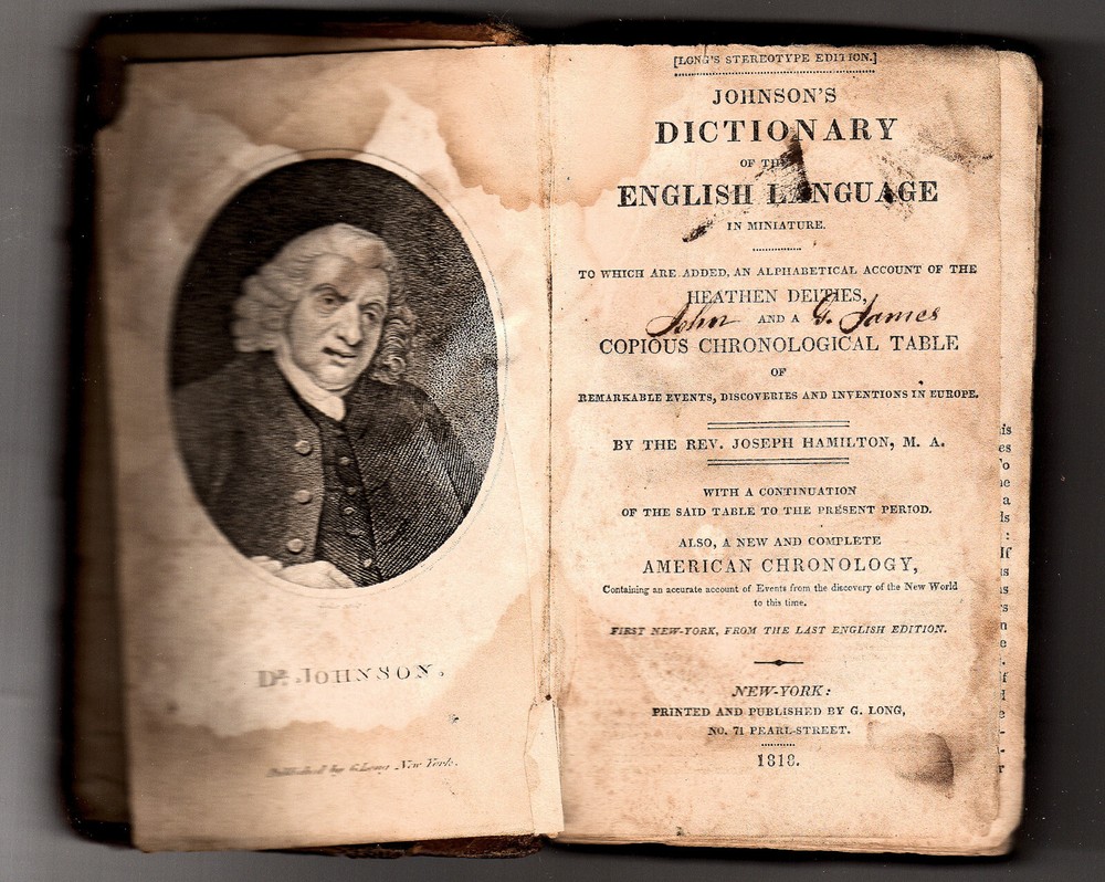 Johnson's Dictionary of the English Language in Miniature, by The Rev. Joseph Hamilton, M.A., printed and published by G. Long, New York, NY, 1818, Long's Stereotype Edition — First New York Edition, from the Last English Edition — 290 pages — frontispiece portrait of Dr. Johnson, engraved by Seeler, Sculp., New York — no other illustrations. Long's Stereotype Edition : Johnson's Dictionary of the English Language in Miniature, to Which are Added, an Alphabetical Account of the Heathen Deities, and a Copious Chronological Table of Remarkable Events, Discoveries and Inventions in Europe, by The Rev. Joseph Hamilton, M.A., with a Continuation of the Said Table to the Present Period, Also, a New and Complete American Chronology, Containing an account account of Events from the discovery of the New World to this time.