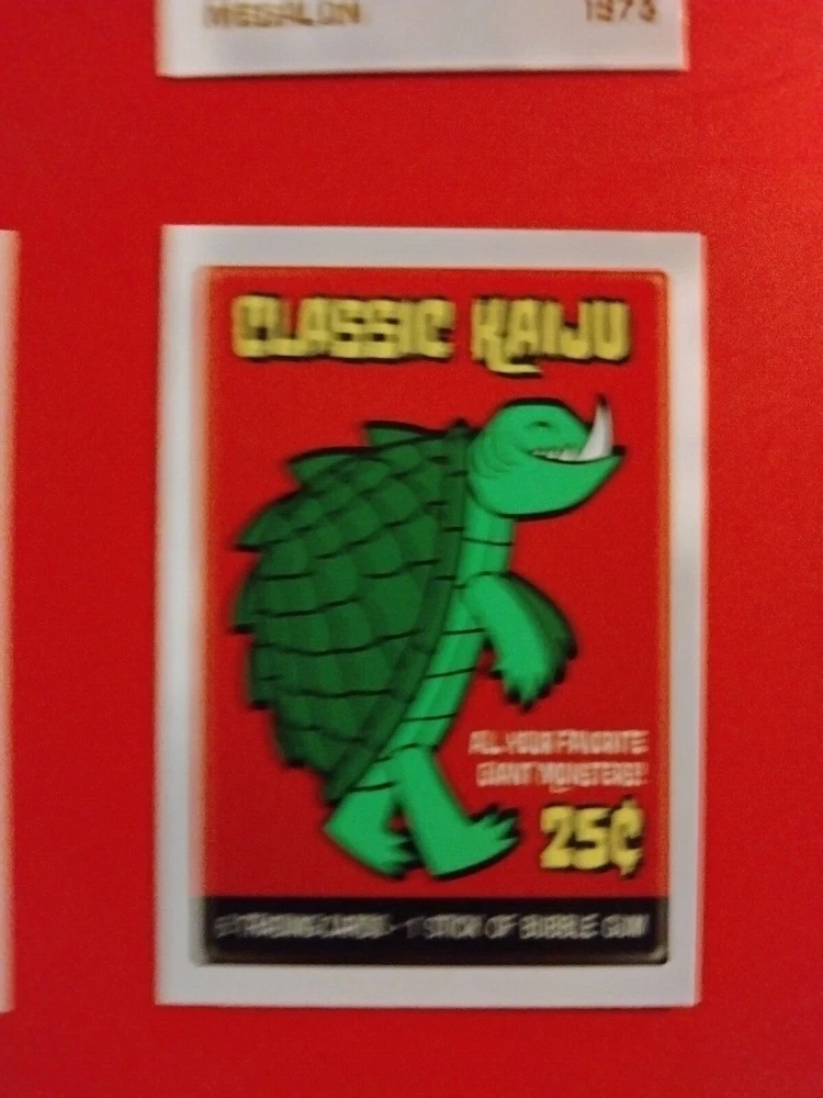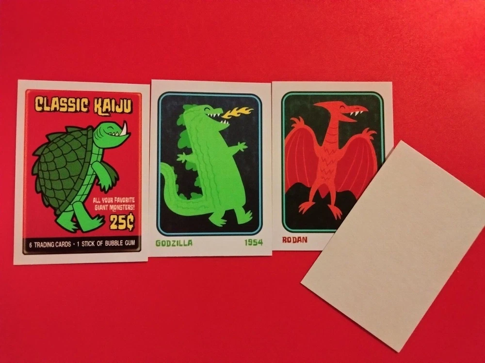 These are ART CARDS by a private designer (Darryl Young). They are in my collection because I love classic horror/sci-fi and felt the need to sell/showcase them on my site. The cards are cartoon caricatures of the legendary movie monsters. The kaiju monsters are the source of many great childhood memories and will forever remain MEGAcool!!! Classic KAIJU giant monster cards. Cards are pack fresh (opened by me) and are smaller "mini" dimensions 1.75" x 2.5". Choose your favorite! Cards totaling under $20 will be sent eBay Standard Shipping. Orders Totaling over $20 USPS Ground. FREE SHIPPING Thank you for your interest.