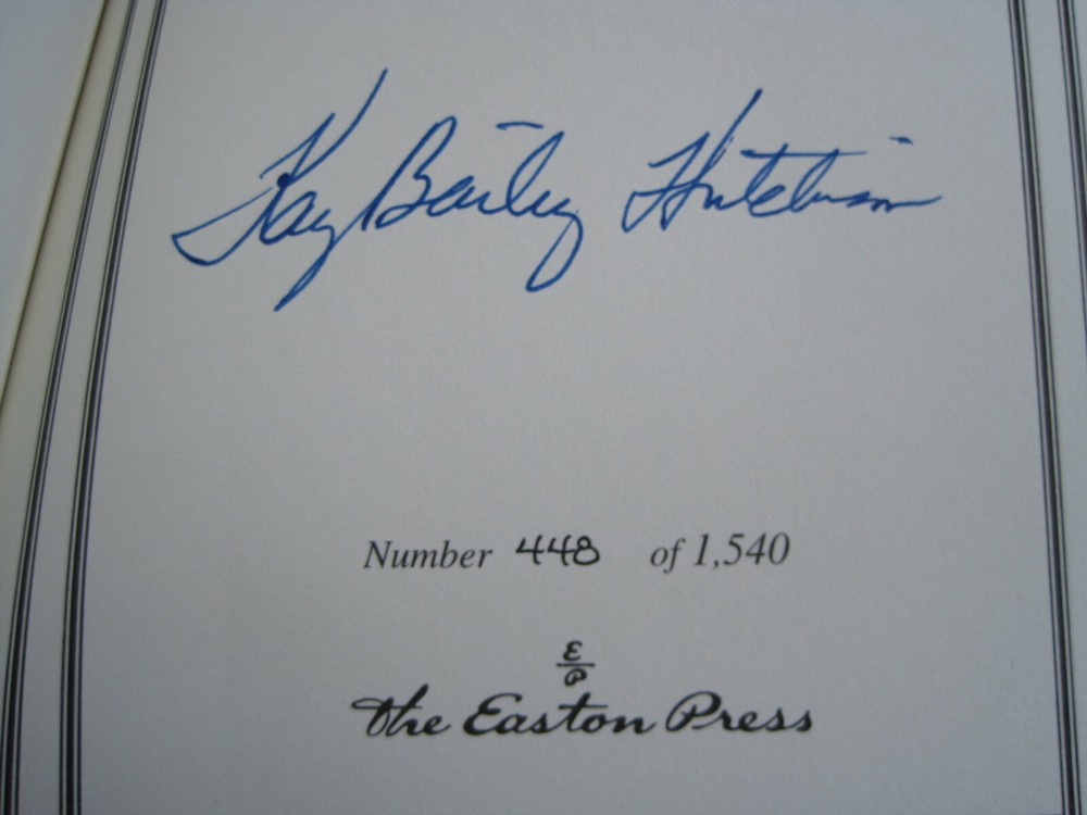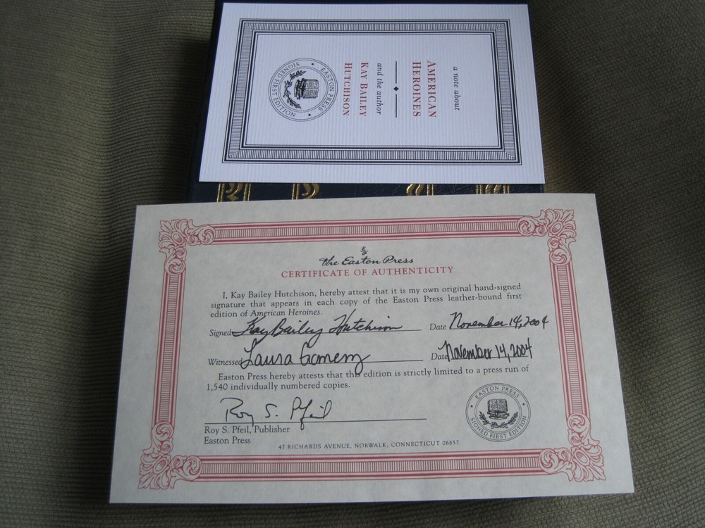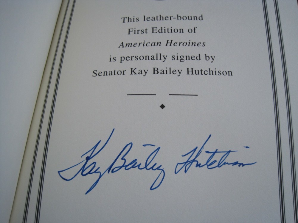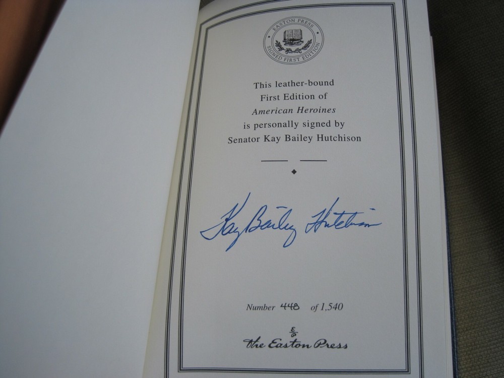 This is a leather bound signed numbered first edition of Senator Kay Bailey Hutchinson's best seller - "American Heroines - The Spirited Women Who Shaped Our Country" . As long as there has been an America, the indomitable spirit of American women has shaped both the country's history and society. Regardless of the time and place these women were born each excelled in her respective field, making it easier for the next generation. This is what makes them heroines. In American Heroines, Kay Bailey Hutchison presents female pioneers in fields as varied as government, business, education and healthcare, who overcame the resistance and prejudice of their times and accomplished things that no woman–and sometimes no man –– had done before. Hutchison, a pioneer in her own right, became the first woman elected to the United States Senate from the State of Texas. The book is unread, but with significant imperfections on the cover (see images). It looks like the gold from another book attached to this one in different spots. However, the interior of the book is flawless. Signed by the author on the limitation page, this is book number 448 of only 1540 numbered copies ever printed. The signed and dated certificate of authenticity and the publisher's note card are also included. Easton Press books are the golden standard in the publishing industry, highly collectible and lasting generations. Easton Press Full Genuine Leather Dubbed Spine Accented Wit 22 kt. Real Gold Satin Ribbon Page Marker Distinctive Cover Design Gilded Page Edges To Protect Against Humidity High Quality Acid - Free paper Smyth-Sewn Pages Silk-Moire Endleaves I combine multiple items for savings on shipping charges. I ship worldwide. Please ask about international shipping charges and/or different shipping options. Thank you!