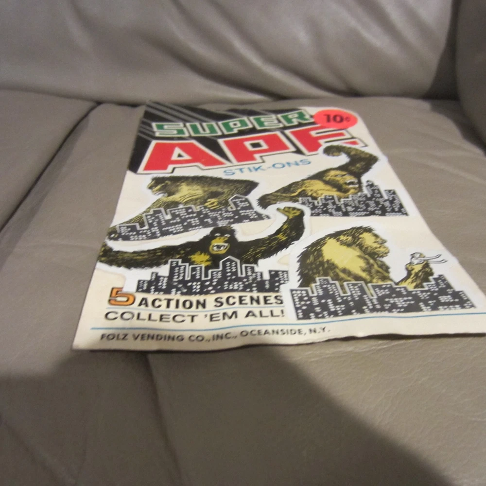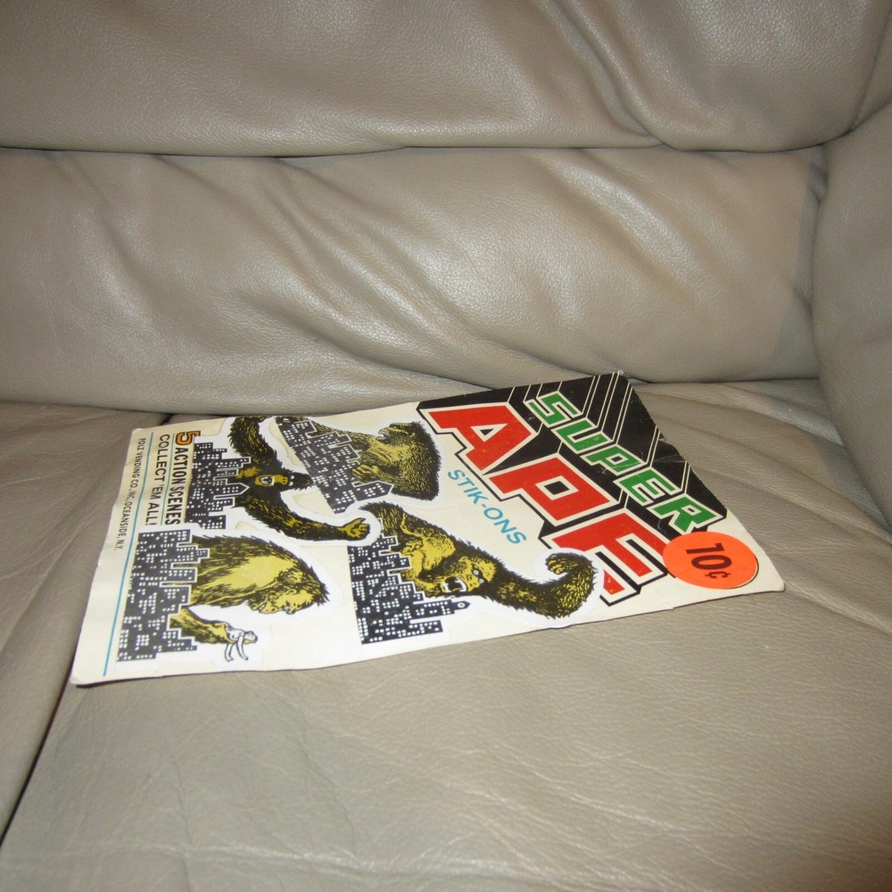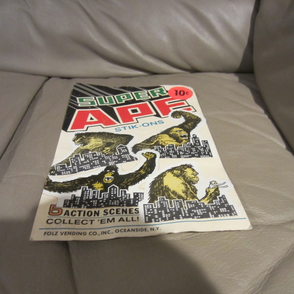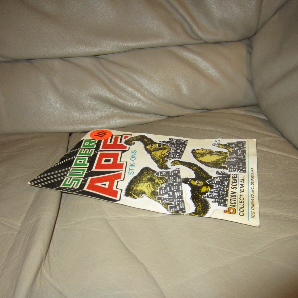 RARE!!!!!----KING KONG SUPER APE STIK-ON STICKERS FOLZ VENDING BACKER CARD GUMBALL - VINTAGE King Kong stickers that you could get by putting 10 cents in the gumball/vending machine. This is the 6" x 8" cardboard backer card that would go inside the vending/gumball machine to show the kids the various Kong stickers. Some minor wear from age...See photos. RARE KING KONG/SUPER APE COLLECTIBLE! Comes as pictured. Great vintage piece. See photos. Please ask any questions prior to bidding. Sold as is. No refunds or exchanges on this vintage piece. Serious bidders only. See photos. Will be shipped and insured for full amount. U.S. bidders only please . Bid with confidence- 100% feedback and quality packaging assured!!!! See photos. Item is sold as is. Take a look at the photos as they are part of the description. Please inquire with any questions prior to bidding. All items sold as is. No refunds or exchanges. See photos for actual item. They are part of the description. Please ask any questions prior to bidding. Payment must be received within 3 days of auction close. Track Page Views With Auctiva's FREE Counter