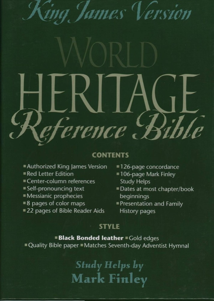 Bible: World Heritage Reference Bible includes King James Version Red Letter Edition Center-column references 8 pages of color maps 126-page concordance Self-pronouncing text Messianic prophecies 22 pages of Bible Reader Aids 106-page Mark Finley Study Helps Dates at most chapter/book beginnings Presentation and family history pages. Black Bonded Leather, quality Bible paper, gold edges. Size: 5 ½" by 8 1/4".