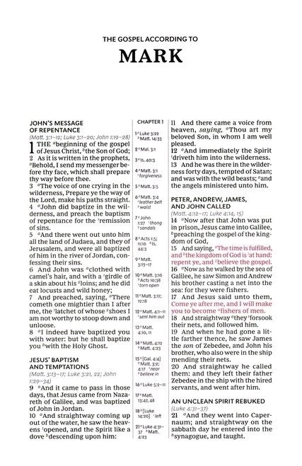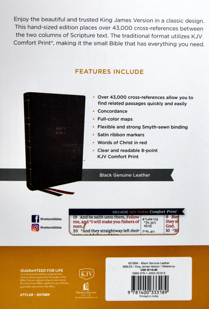 This KJV Bible is a fantastic compact edition with a premium genuine leather cover that feels great in hand. The center-column references make studying scripture effortless, and the Smyth-sewn binding ensures long-lasting durability. The 8-point Comfort Print is easy on the eyes, while the ribbon markers and full-color maps add extra convenience. Perfect for daily reading or travel!