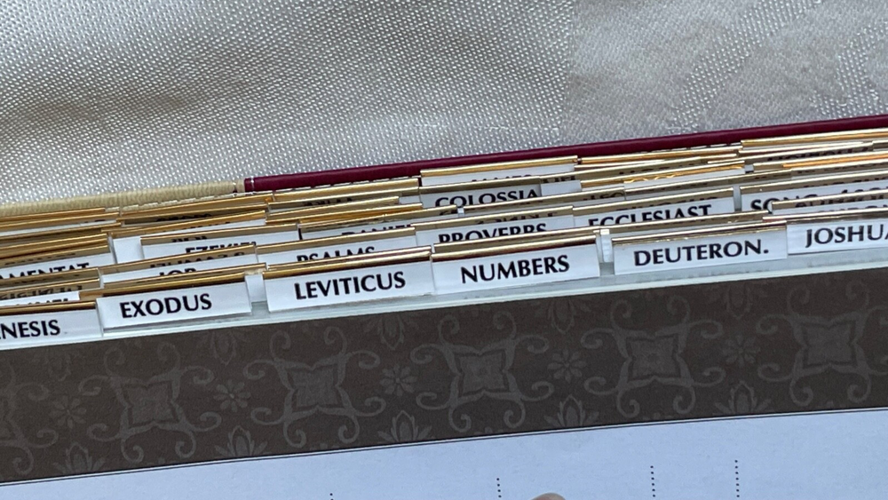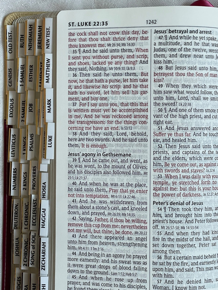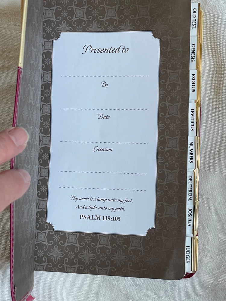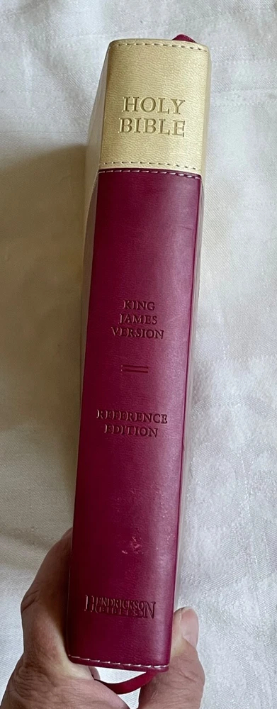 This listing is for a nice, easy-to-read Bible with reference materials in the King James Version (KJV). The words of Christ are in red, there's a ribbon bookmark, plus each book of the Bible has a tab to make it easier to find. It is a comfortable book made of Flexisoft Leather.