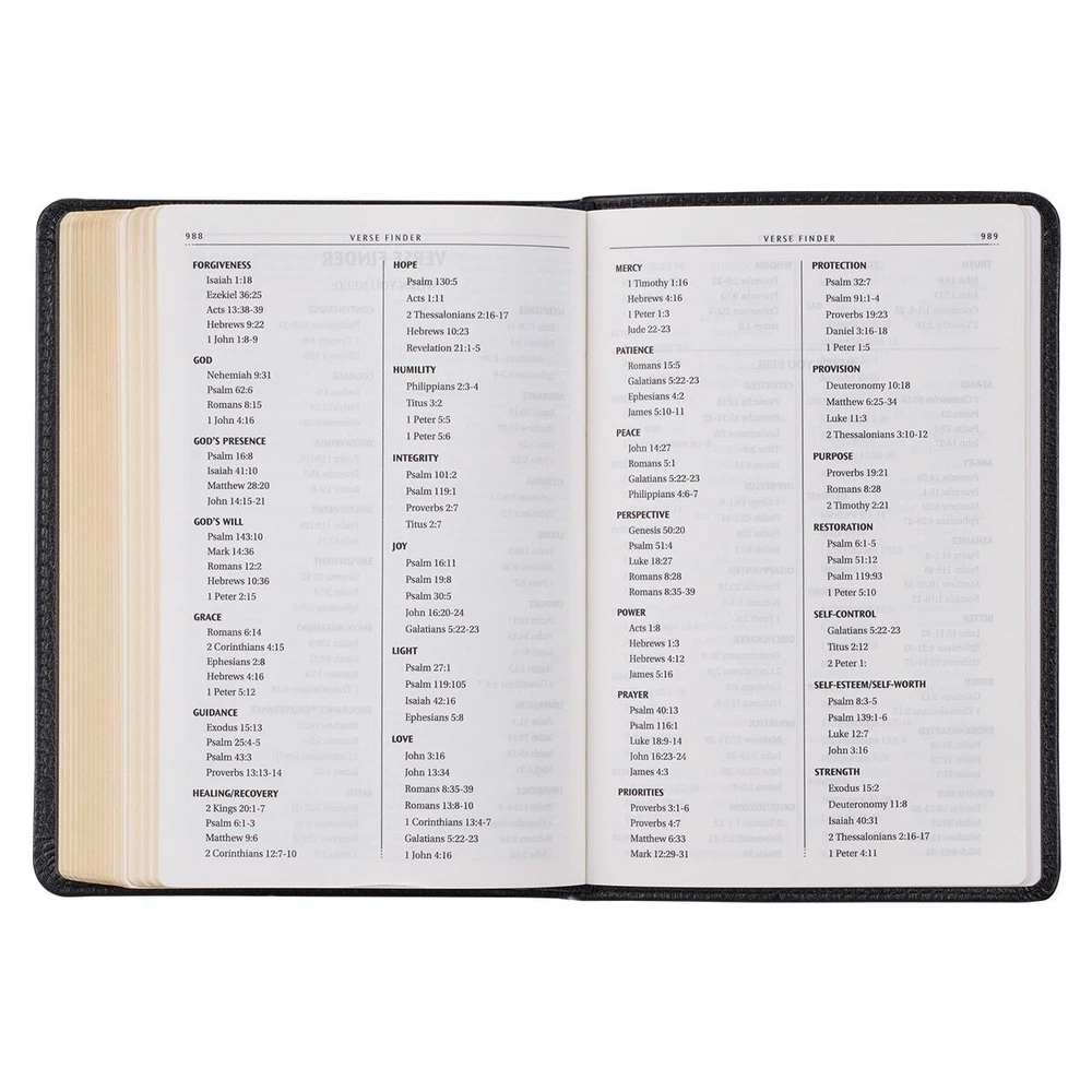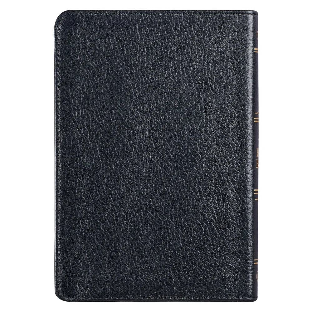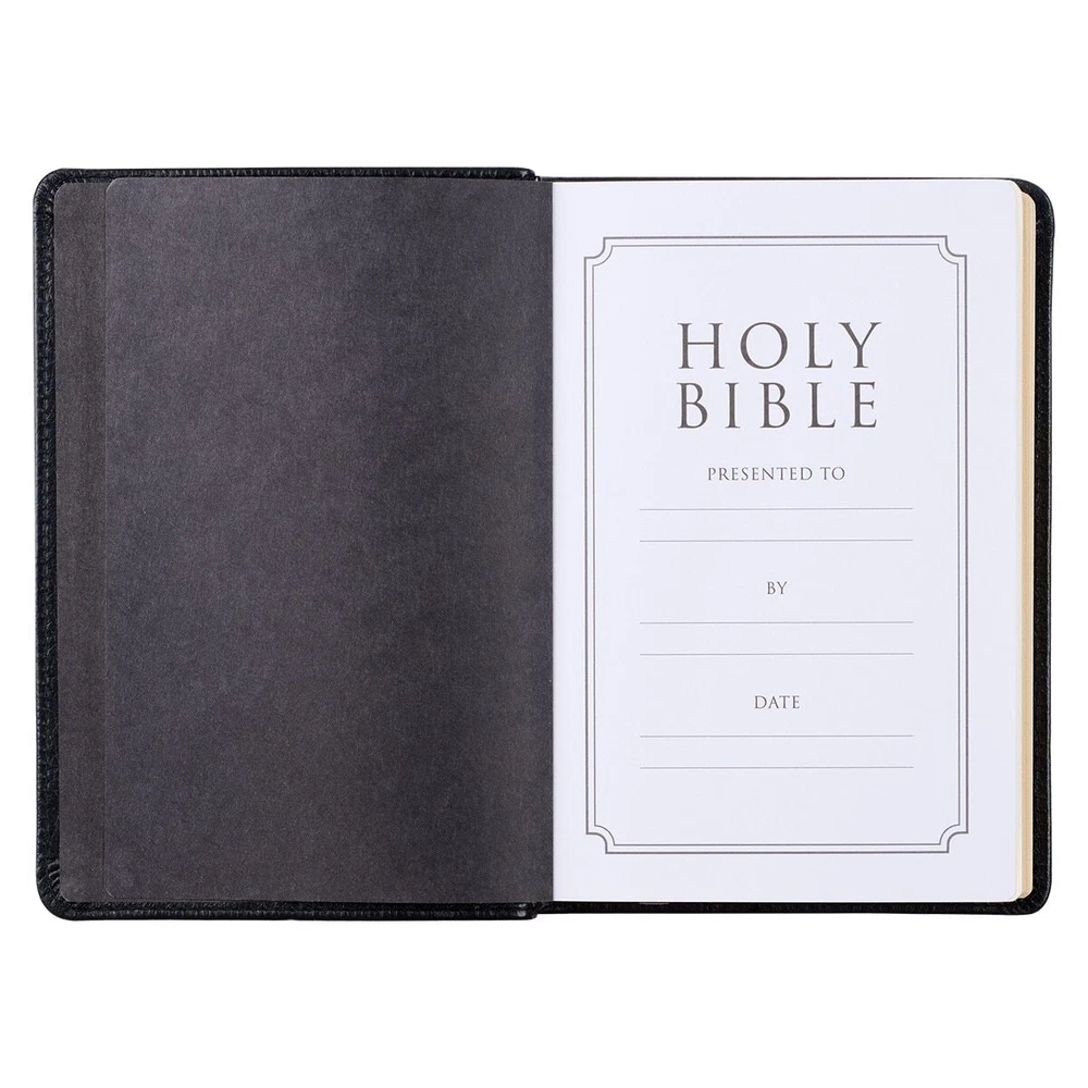 Slip the Black Full Grain Leather Compact King James Version Bible into your purse or backpack for optimal convenience and accessibility wherever your day may take you. Whether at home, the office, a coffee shop, the park, or at church, you will appreciate the compact size and clean design of this Bible. It is sure to be a favorite for home or away. Visit Storefront Contact Us View Feedback About Our Company KJV Holy Bible, Compact Premium Full Grain Leather Red Letter Edition - Ribbon Marker, King James Version, Black Item Details Slip the Black Full Grain Leather Compact King James Version Bible into your purse or backpack for optimal convenience and accessibility wherever your day may take you. Whether at home, the office, a coffee shop, the park, or at church, you will appreciate the compact size and clean design of this Bible. It is sure to be a favorite for home or away. Slip the Black Full Grain Leather Compact King James Version Bible into your purse or backpack for optimal convenience and accessibility wherever your day may take you. Whether at home, the office, a coffee shop, the park, or at church, you will appreciate the compact size and clean design of this Bible. It is sure to be a favorite for home or away. This Compact KJV Bible’s classic design features a solid black full grain leather cover, gilt-edged pages, and an attached satin ribbon page marker for your convenience. Foiled embellishments on the spine include the title, version reference, small flourishes, and other decorative accents. KJV THE HOLY BIBLE Topstitching around the edges of the bible increases its durability and adds a subtle element of design interest. This Bible’s 7-point text, double-column format, reader-friendly subheadings, thematic Scripture verse finder, concordance, 8 full-color maps, and one-year Bible reading plan aid the user in personal Bible study. As an added feature, the words of Christ are printed in red ink. The Black Full Grain Leather Compact King James Version Bible is an excellent gift for Christmas, First Communion, Baptism, or for any other significant event in a person’s life. There is a presentation page in the front of the Bible where a personal note may be written. Black Full Grain Leather Large Print Compact King James Version Bible is packaged in a sturdy gift box that prevents damage and is easy to wrap. Classic King James Version Text Black full grain leather cover Foiled spine title design Flexcover Text size: 7-point type 1016 gilt-edged pages Attached ribbon marker Double-column format Lay-flat binding Words of Christ in red ink One-year Bible reading plan 8 full-color maps Thematic Scripture verse finder Reader-friendly subheadings Presentation page Packaged in gift box Size: 6.7” x 4.7” x 1.1” (170 x 119 x 28mm) Return Policy To ensure complete satisfaction of our customers, we offer a 30 day return policy for all orders. Please reach out to us if you have any questions and one of our friendly customer service representatives will reply within 24 hours. This excludes weekends and holidays. Shipping Information All orders are fulfilled and shipped within 1-2 business days excluding holidays and will be shipped via standard economy shipping. Please do not hesitate to reach out with any questions. Please Note: Our hours of operation are Monday-Friday, 8am-5pm (CST). All orders received before 2pm (CST) will be processed & shipped within 1-2 business days.* Average transit times are 2-7 business days to the contiguous 48 United States and the District of Columbia. (*Does not apply to holidays or special orders.) Shop Our Storefront | View Feedback | Contact Us | Add Us to Your Favorites