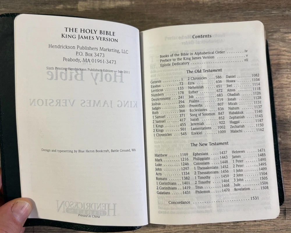 This is a 6.0 x 4.25-inch Bonded Leather Book. The Book is: - KJV Compact Reference Bible Black Bonded Leather Hendrickson Red Letter Concordance - Book was published in July 2011 by Hendrickson Bibles. Book is a First Edition - Sixth Printing. Book has 1590 pages including the concordance. Book has color map illustrations. Book is in Like New - Unused Condition. Cover is clean with some typical light shelf wear - corner and edge dings. Binding is tight. Pages are clean with no marks. No Odor. Book is from Pet and Smoke Free Home. The s/h is current media mail rate. Combined S/H Discount - NO (0.00 cents) additional S/H postage for each additional item you purchase during the same week . I have many other Bibles in my eBay store. Category - Bibles. Always Combine S/H. If you are not happy with the item. I will provide a full refund. PLEASE NOTE: I MAIL ALL BOOKS VIA MEDIA MAIL with Standard USPS Tracking. Please - Please Contact me if you have not received the Book. I can provide you the tracking information. If for some reason you are not satisfied with the condition of the book, I will provide a full refund and you will not have to contact eBay and open a case. Let us Keep eBay a Fun Place to Buy and Sell. Thanks.