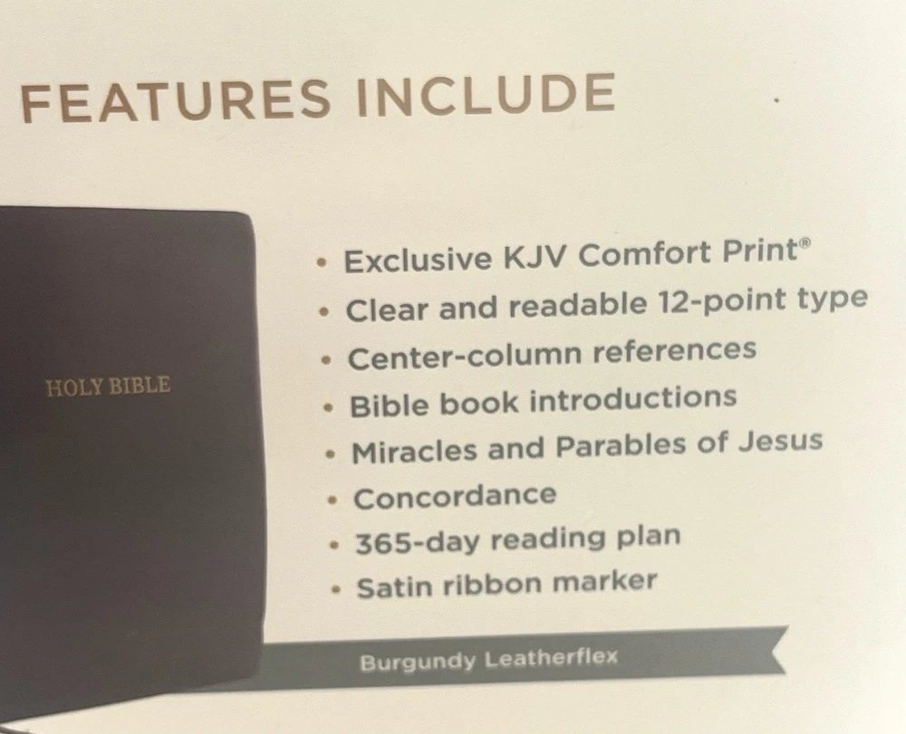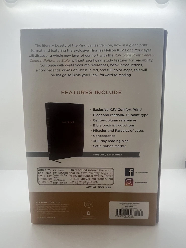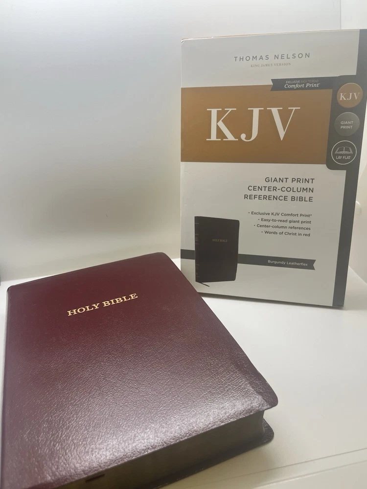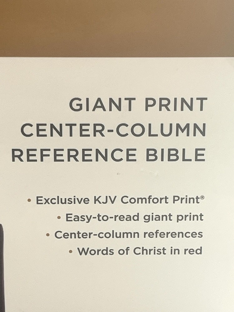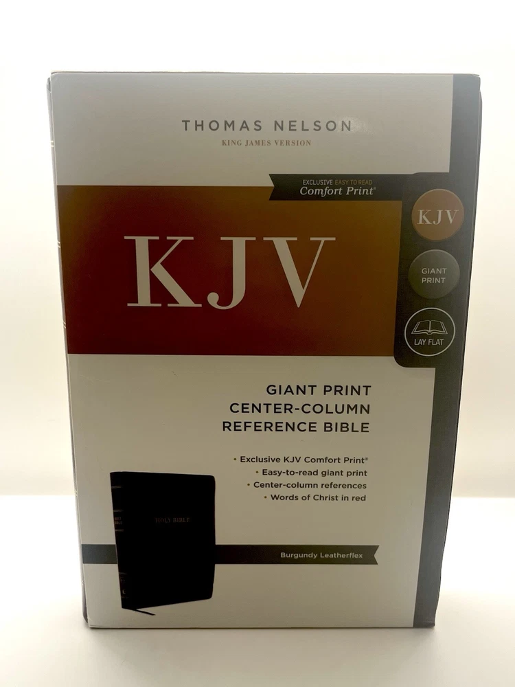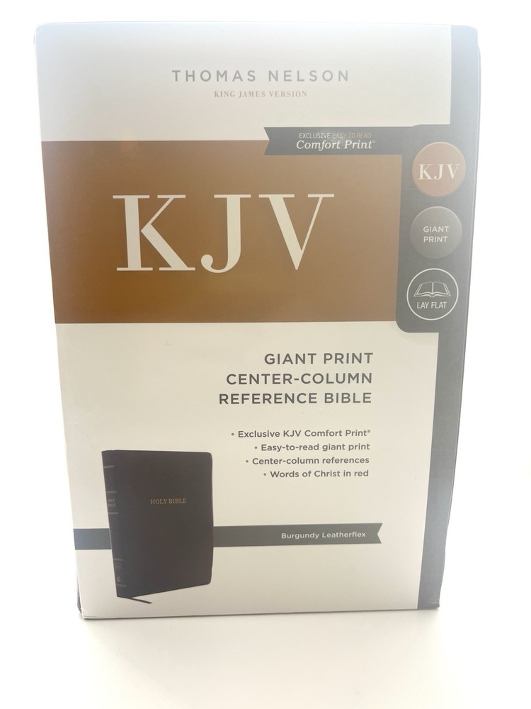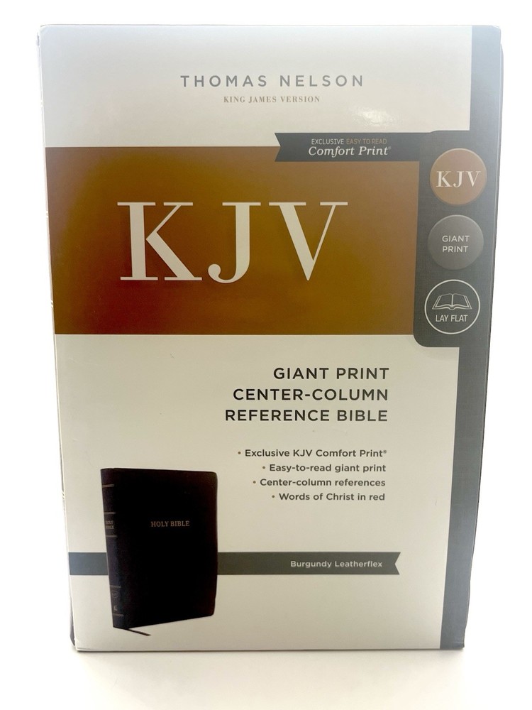 The literary beauty of the King James Version, now in a giant-print format and featuring the exclusive Thomas Nelson KJV Font. Your eyes will discover a whole new level of comfort with the KJV G/ant Print Center-Column Reference Bible, without sacrificing study features for readability. Complete with center-column references, book introductions, a concordance, words of Christ in red, and full-color maps, this will be the go-to Bible you'll look forward to reading. Features: Bible book introductions provide a concise overview of the background and historical context of the book about to be read Center-column references allow you to find related passages quickly and easily Reading plan guiding you through the entire Bible in a year Miracles and parables of Jesus chart calls out important events during Jesus' earthly ministry Concordance for looking up a word's occurrences throughout the Bible Full color maps show the layout of Israel and other biblical locations for better context Two satin ribbon markers Clear and readable 10.5-point KJV Comfort Print Product Information Title: KJV Large Print Center-Column Reference Bible, Comfort Print--soft leather-look, black Format: Imitation Leather Number of Pages: 1568 Vendor: Thomas Nelson Publication Date: 2022 Dimensions: 9.25 X 6.25 X 1.50 (inches) Weight: 2 pounds 4 ounces
