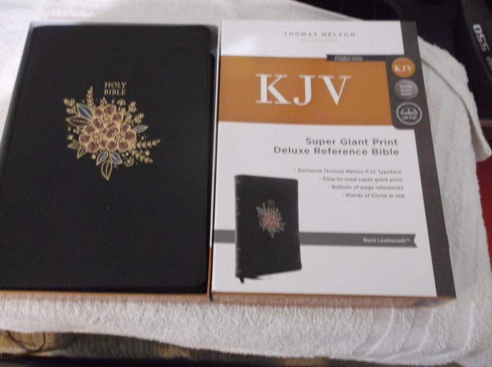Up for sale is a Thomas Nelson King James Version Bible, Super Giant Print Deluxe Reference Bible. Features are as Follows: Exclusive KJV Comfort Print. Clear and Readable 16-point type. Bottom Page Reference. Bible book introductions. Miracles and Parables of Jesus. 365-day reading plan. Concordance. Full color maps. Two satin ribbon markers. If you have any questions, please message me here. Thanks for looking and please check out our other items.
