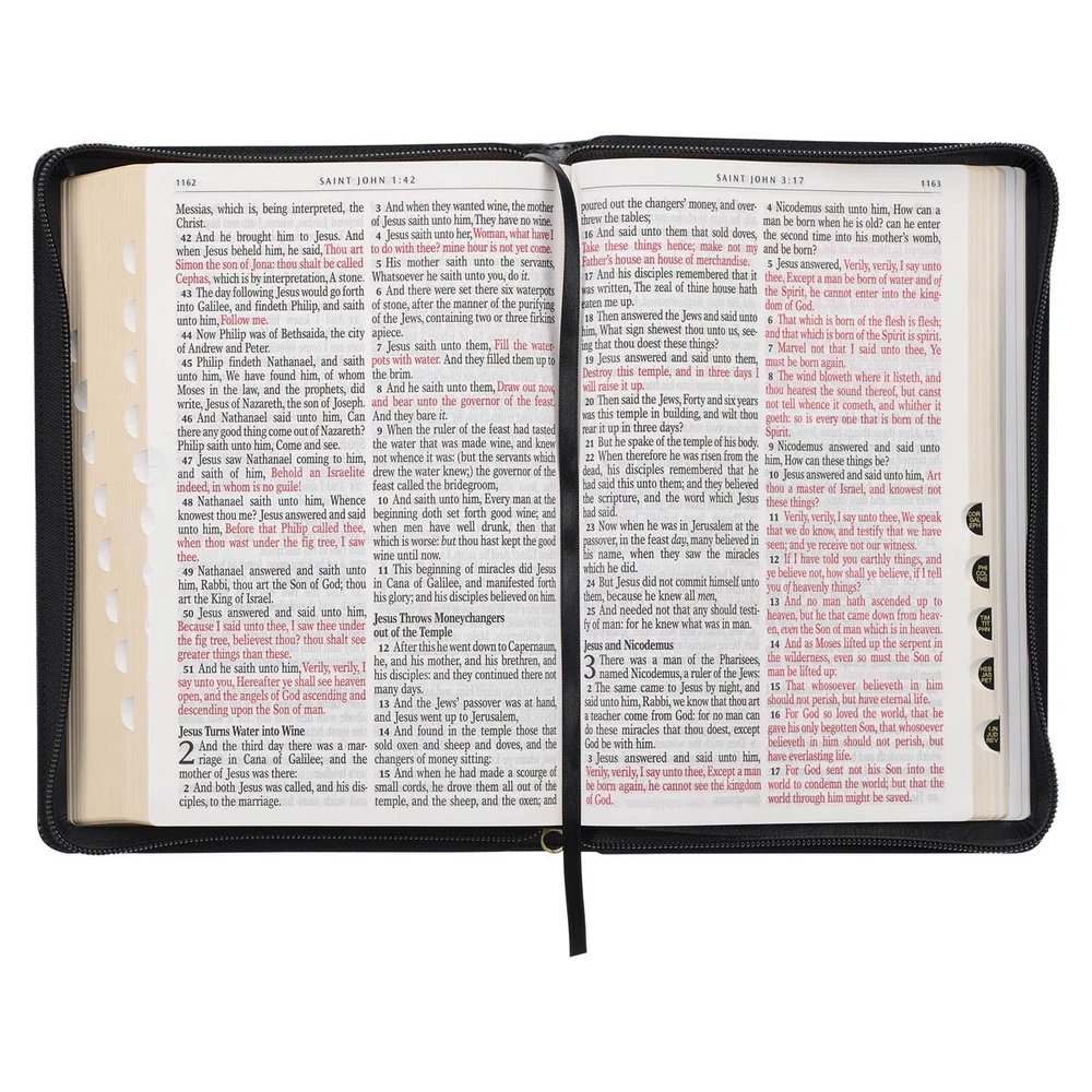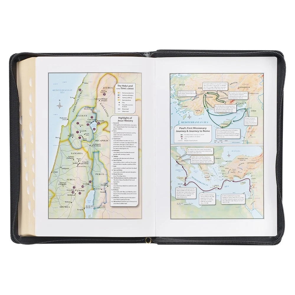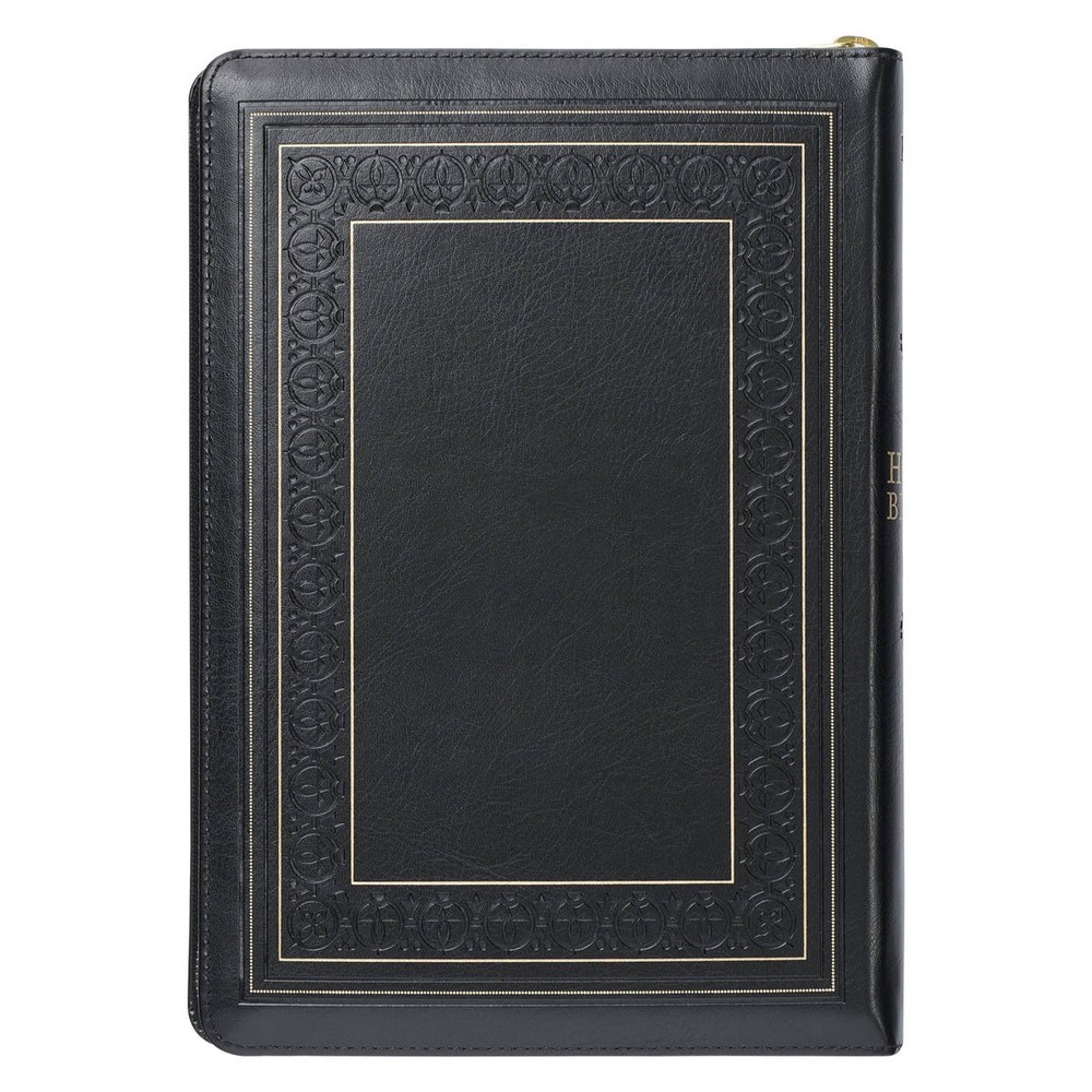 The timeless design of the Black Framed Faux Leather Giant Print Full-size KJV Bible with Thumb Index and Zippered Closure ensures that it will be a well-received gift for anyone special in your life. Visit Storefront Contact Us View Feedback About Our Company KJV Holy Bible, Giant Print Full-size Faux Leather w/Thumb Index & Ribbon Marker, Red Letter Edition, King James Version, Black, Zipper Closure Item Details The timeless design of the Black Framed Faux Leather Giant Print Full-size KJV Bible with Thumb Index and Zippered Closure ensures that it will be a well-received gift for anyone special in your life. The timeless design of the Black Framed Faux Leather Giant Print Full-size King James Version Bible with Thumb Index and Zippered Closure ensures that it will be a well-received gift for anyone special in your life. The Bible's smooth, black faux leather cover features a triple gold-foiled frame accented with a heat-debossed floral medallion design. The gold-foiled title is centered within its own heat-debossed ornate bracket frame, and the version reference is heat-debossed below it. The heat-debossed medallion motif, as well as the gold-foiled title, are repeated on the spine. HOLY BIBLE KING JAMES VERSION The heat-debossed triple frame design is repeated on the back cover. This Bible includes all the essentials, from the presentation page at the front, thumb indexing, and a zippered closure to the reading plan and verse finder at the back. An attached satin ribbon ensures you will never lose your place, and you will find it easy to reflect on the words of Christ because of their red inking. Gilt-edged pages finish the exquisite design. The zippered closure will ensure that all loose notes, sermon bulletins, and bookmarks are securely tucked inside. The original 1769 English KJV text is presented in a double-column format so expect slight variations in spelling and language use. The giant 14-point type font makes reading easy and lessens the strain on the eyes. The Bible is packaged in a full-color printed cardstock sleeve. Bless a newly ordained pastor with this Bible, which is easy to read from a distance. It will serve him well as he preaches the gospel from the pulpit each Sunday. He would love to keep the Black Framed Faux Leather Giant Print Full-size King James Version Bible with Thumb Index and Zippered Closure close at hand or on the pulpit. Heat-debossed medallion motif and triple gold foiled frame design Black faux leather cover Flexcover Zippered closure Classic King James Version Full-size Bible Gold foiled titles Thumb-indexing tabs Satin ribbon marker 1400 gilt-edged pages Presentation page Lay-flat Smyth-sewn binding Reader-friendly subheadings Double-column format Words of Christ in red Thematic Scripture verse finder One-year Bible reading plan 8 full-color maps Giant print 14-point type Packaged in a full-color printed cardstock sleeve Size: 9.9" x 6.8" x 1.5" (251 x 173 x 38mm) Return Policy To ensure complete satisfaction of our customers, we offer a 30 day return policy for all orders. Please reach out to us if you have any questions and one of our friendly customer service representatives will reply within 24 hours. This excludes weekends and holidays. Shipping Information All orders are fulfilled and shipped within 1-2 business days excluding holidays and will be shipped via standard economy shipping. Please do not hesitate to reach out with any questions. Please Note: Our hours of operation are Monday-Friday, 8am-5pm (CST). All orders received before 2pm (CST) will be processed & shipped within 1-2 business days.* Average transit times are 2-7 business days to the contiguous 48 United States and the District of Columbia. (*Does not apply to holidays or special orders.) Shop Our Storefront | View Feedback | Contact Us | Add Us to Your Favorites