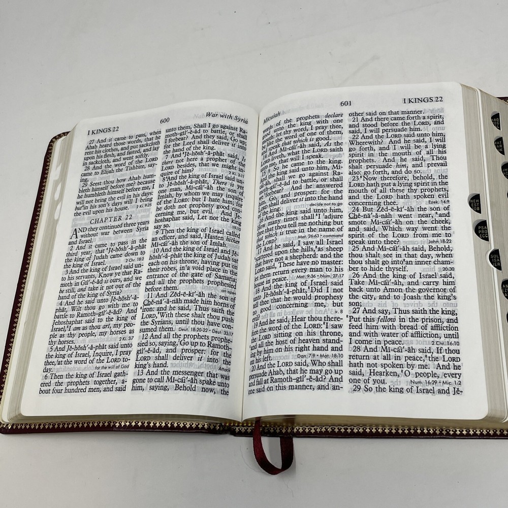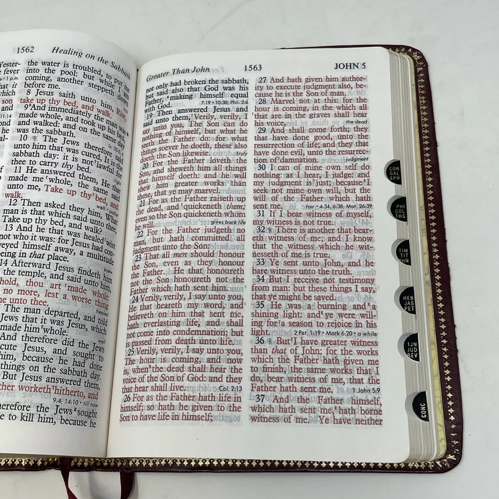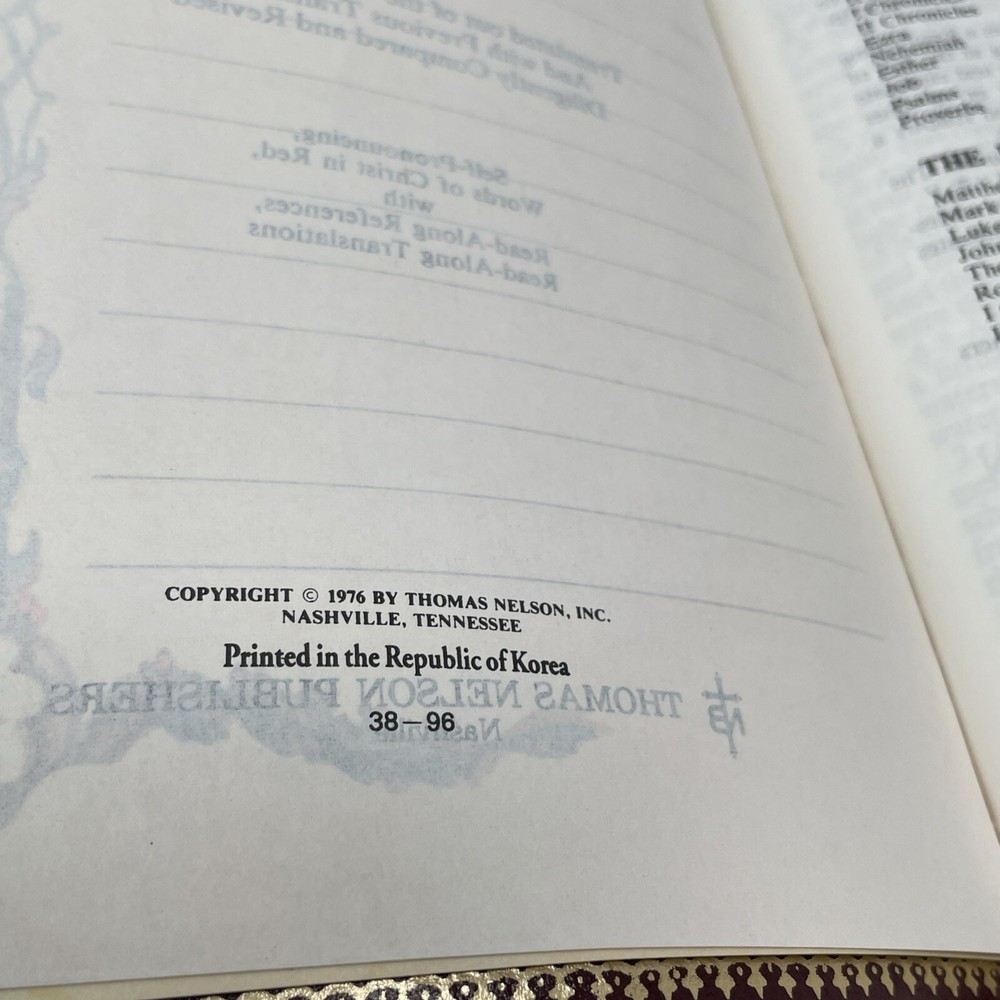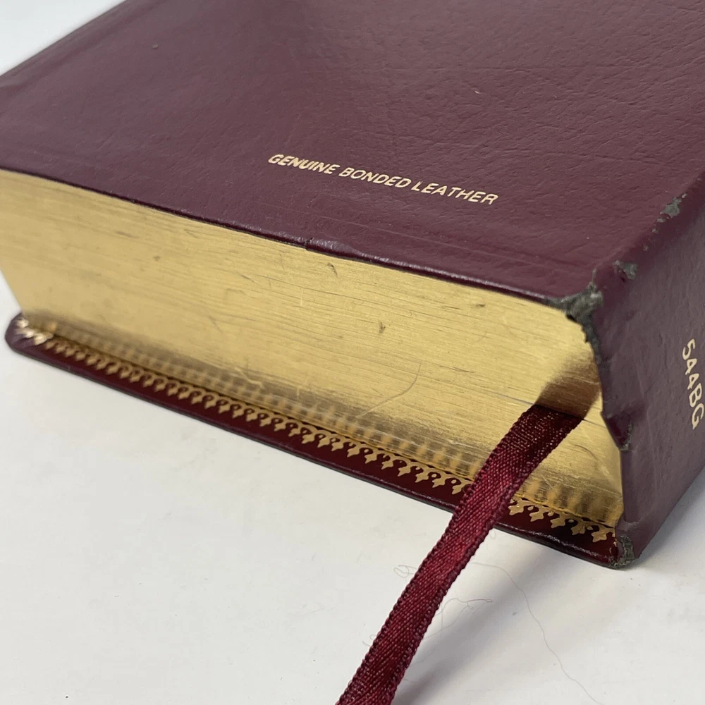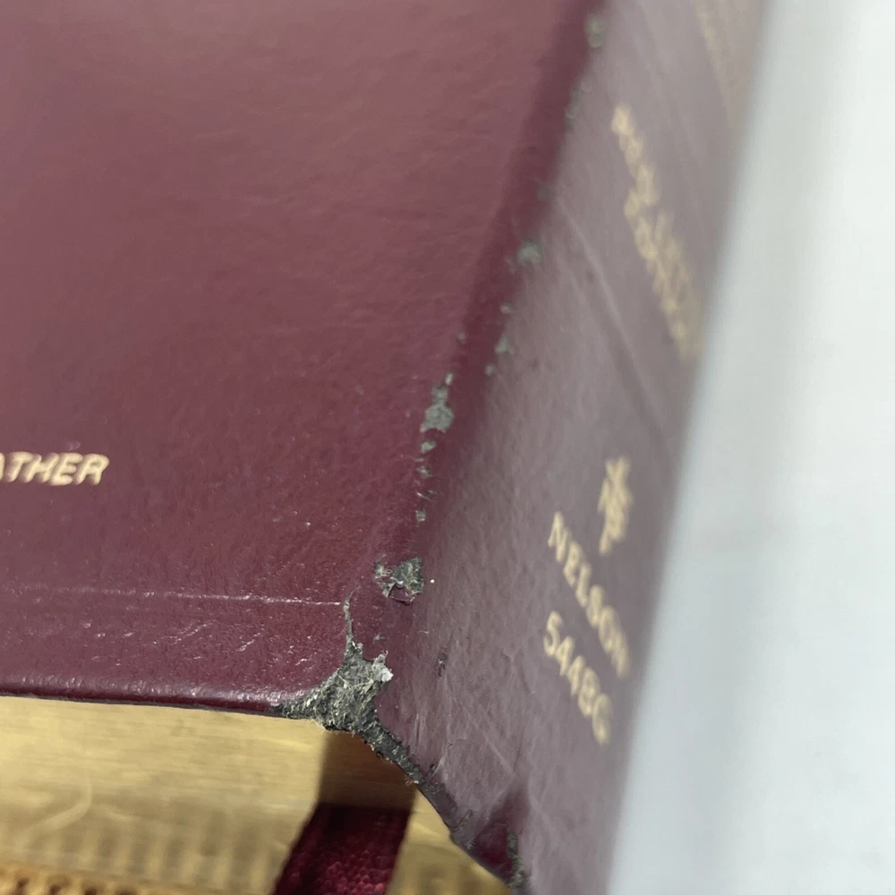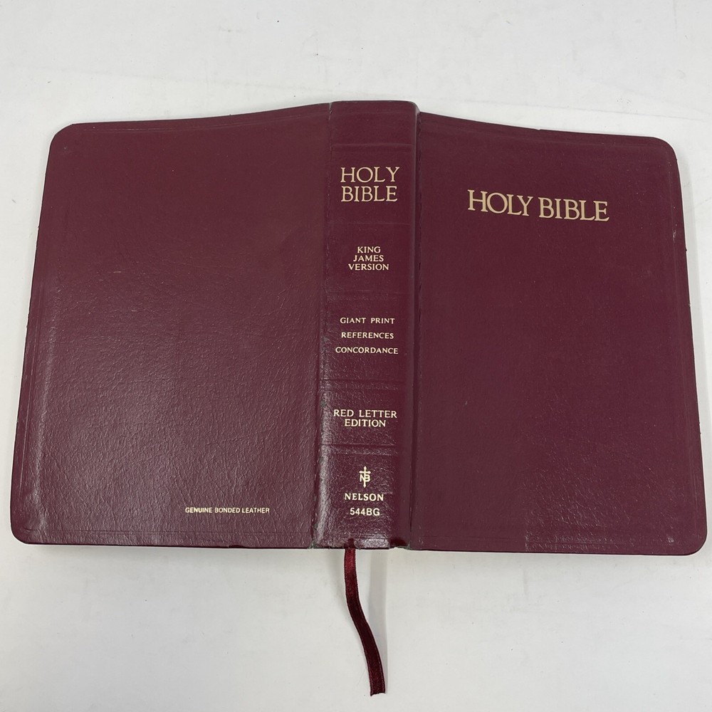 KJV Giant Print Reference Bible THUMB INDEX Genuine Bonded Leather Nelson 544BG This 1976 Nelson giant print Bible is in good used condition. It has no writing or highlighting inside. It appears to have had very limited use and is very clean. The edges of the spine cover show wear from storage. This is evident in pictures. It is rare to find a Bible this age in this condition. See pictures for details of exact condition.