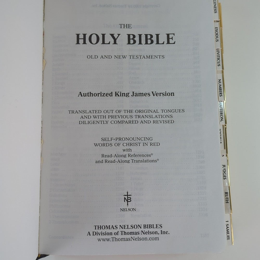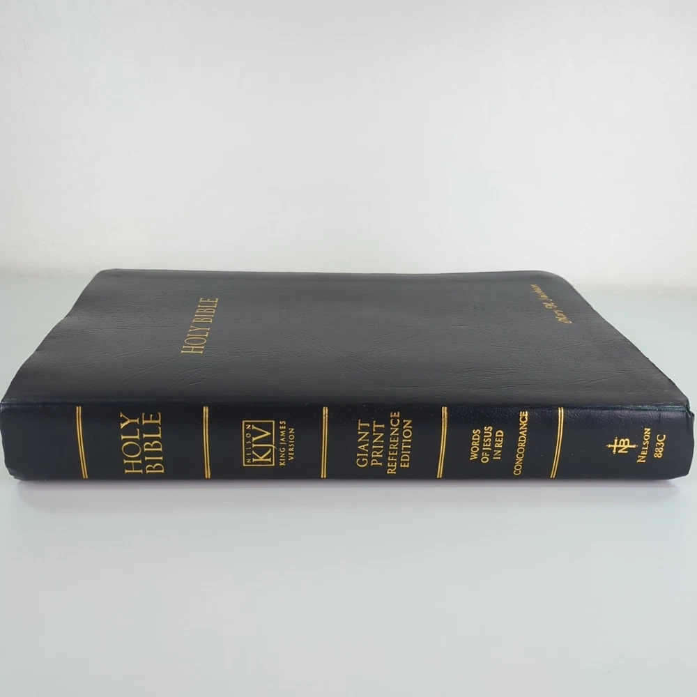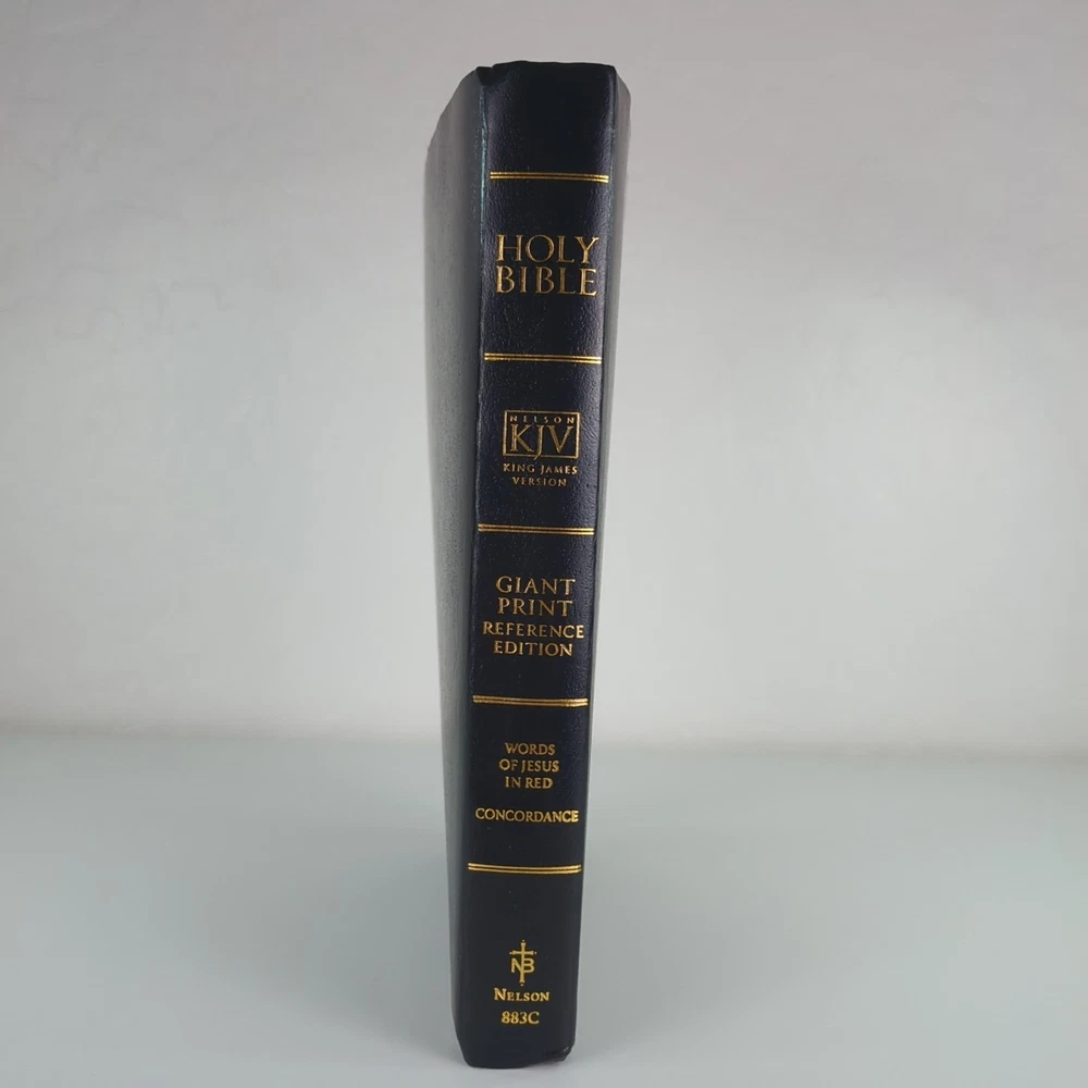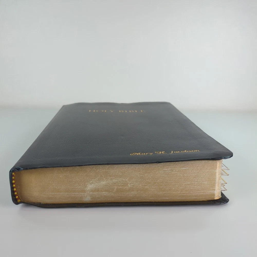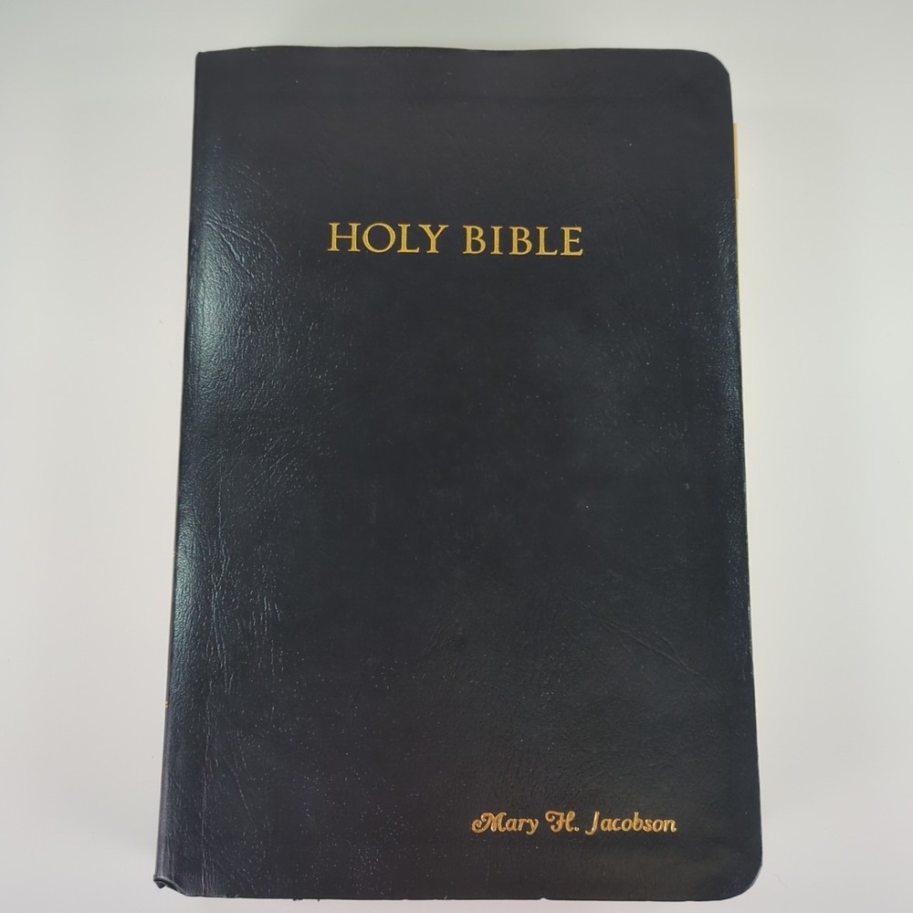KJV Holy Bible Giant Print Reference Edition Red Letter Concordance Nelson 883C Black with gold-colored lettering Gold-colored edges on index tabs Maps included Plus ephemera: Read the Bible Through In One Year Front cover is personalized/embossed with the name Mary H. Jacobson