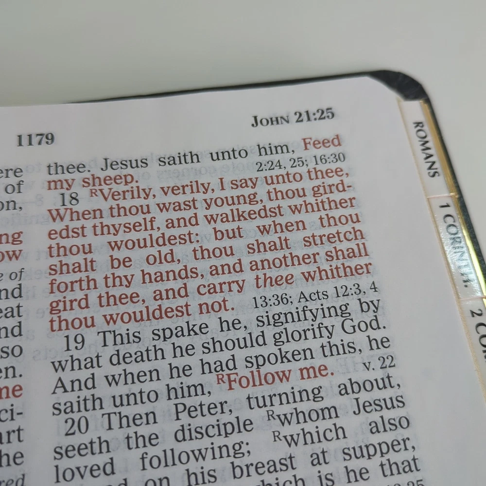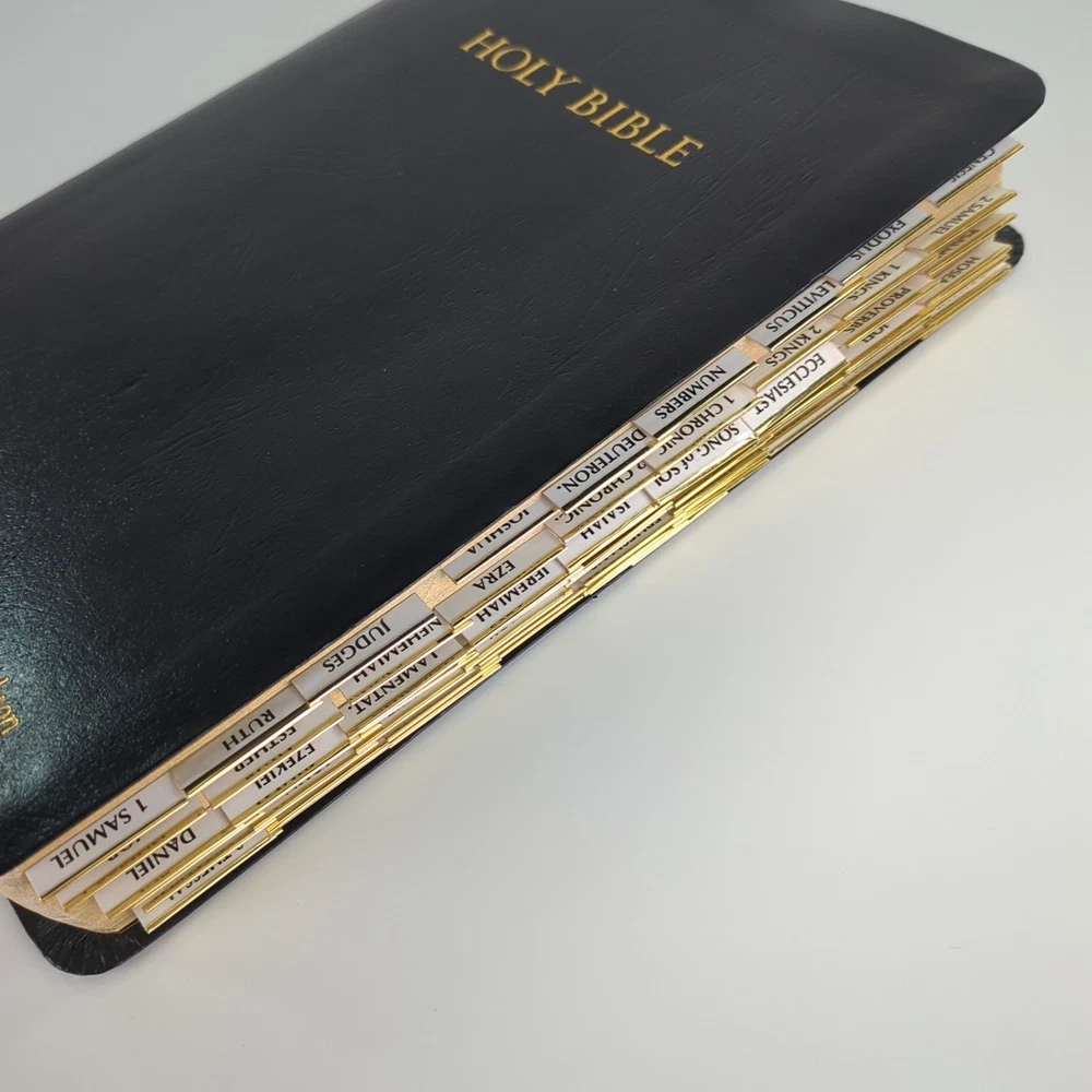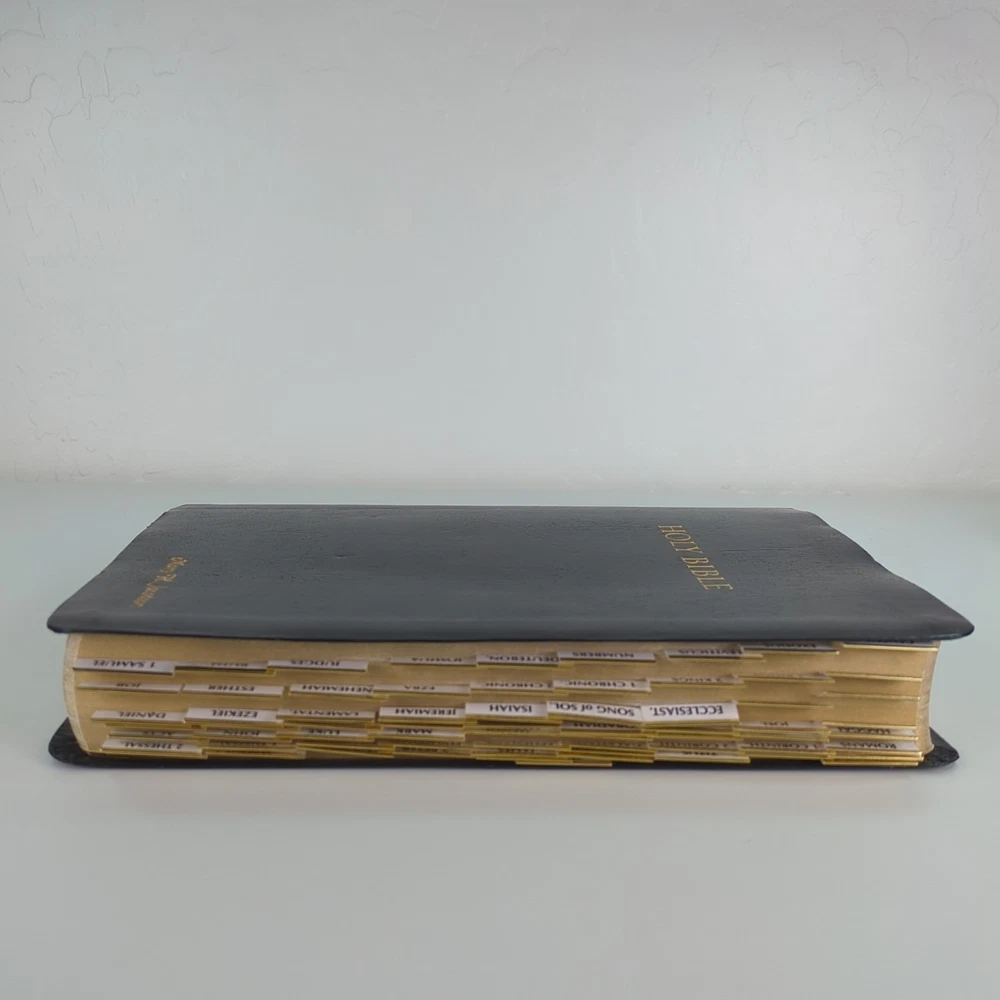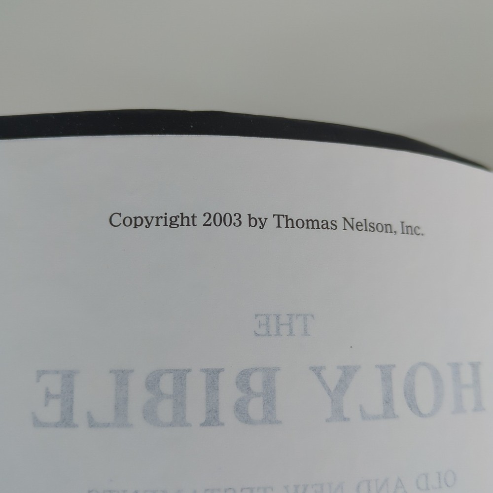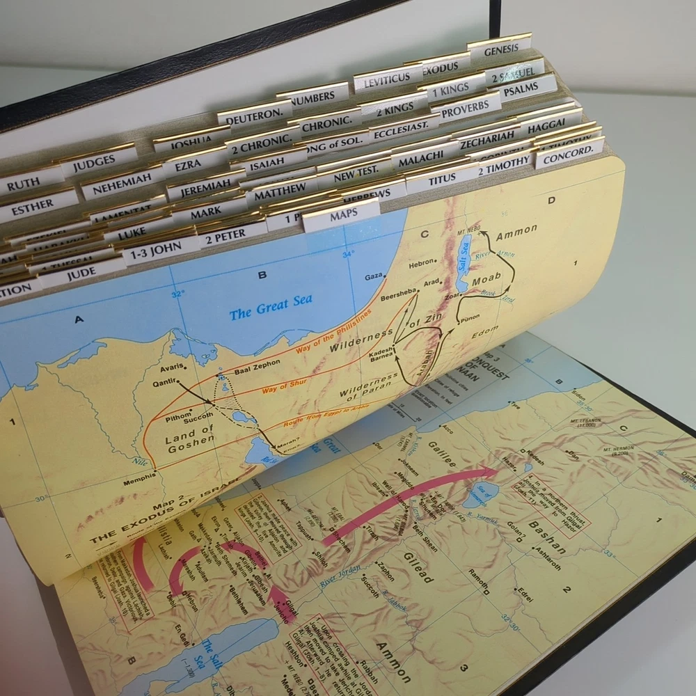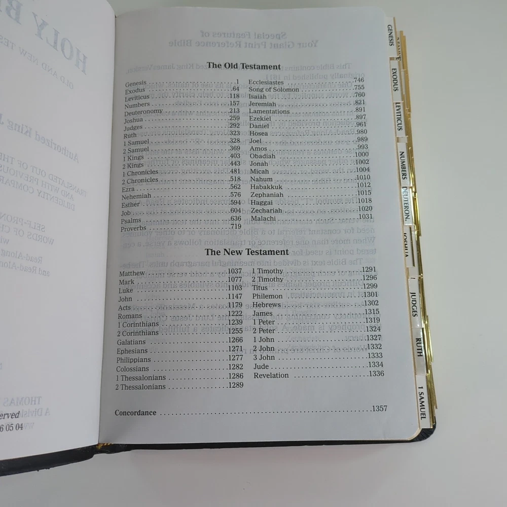 KJV Holy Bible Giant Print Reference Edition Red Letter Concordance Nelson 883C Black with gold-colored lettering Gold-colored edges on index tabs Maps included Plus ephemera: Read the Bible Through In One Year Front cover is personalized/embossed with the name Mary H. Jacobson