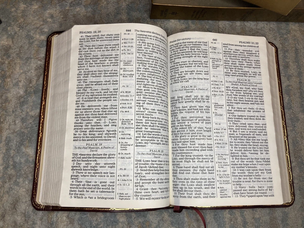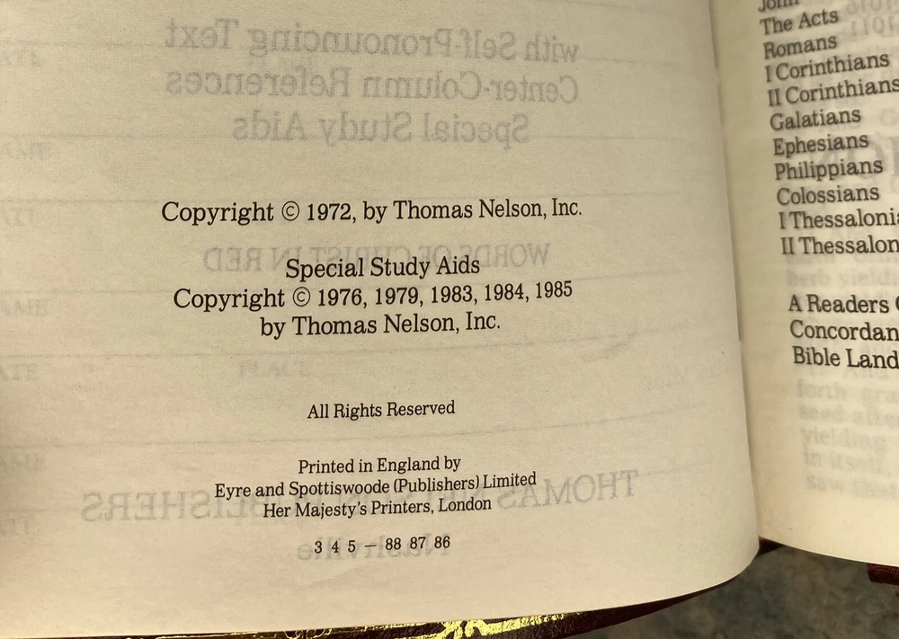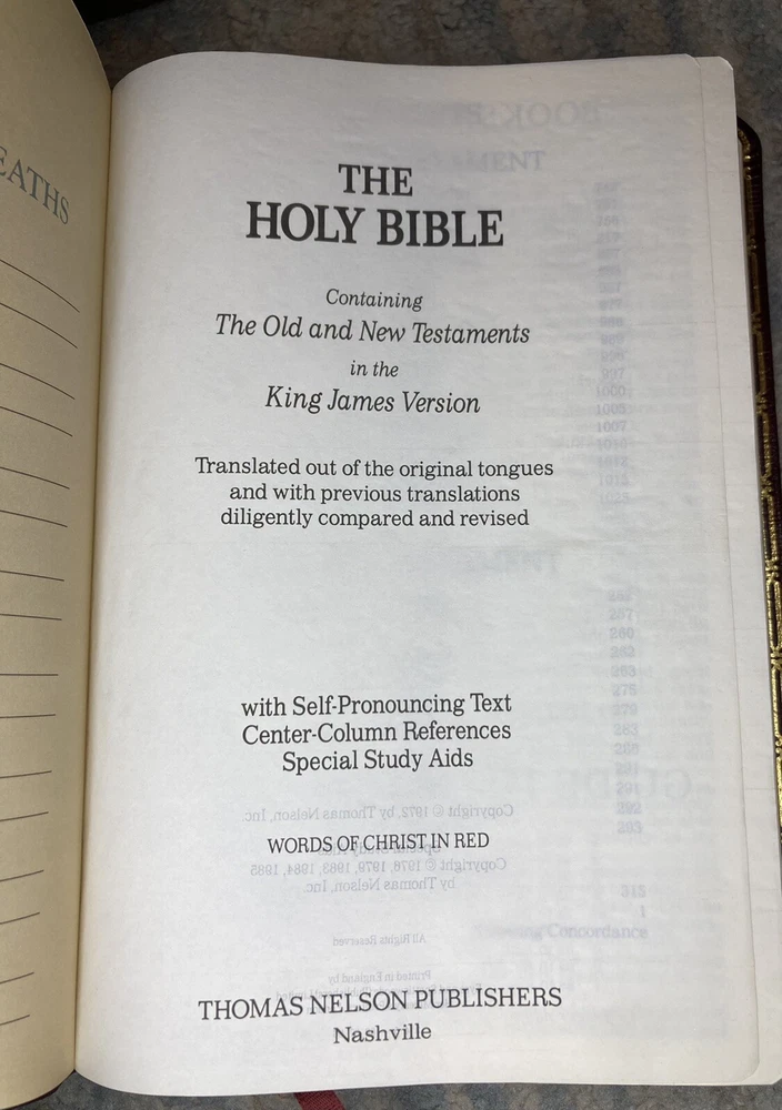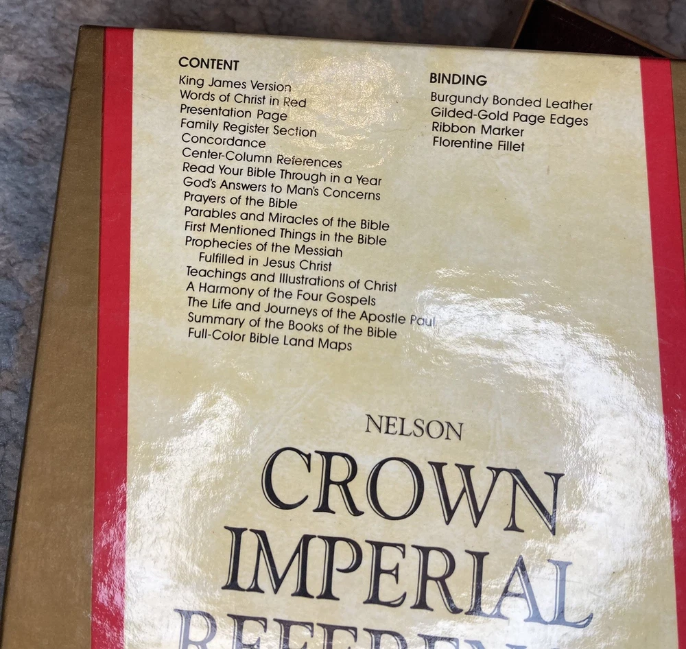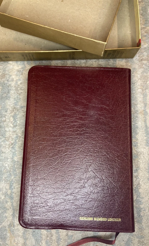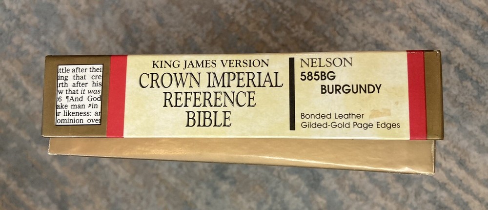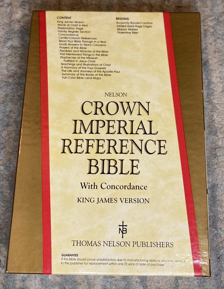 KJV Holy Bible Imperial Reference Ed., Nelson, 585 Burgundy Genuine Leather with Box (1972). Has a couple wear marks on front cover ( see photos Features: -King James Version - Words of Christ in Red -Family Register Section - Altered Presentation page with Collage Decoration - Center Column references -Concordance -Harmony of the Gospels -Reading Guide to the Bible - History of the Red Letter Edition - Life and Journeys of the Apostle Paul - Color Maps Binding: - Overlap Style - Gold page-edges - Ribbon marker -Florentine Fillet - Bound in Burgundy Genuine Leather