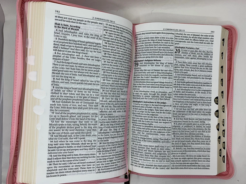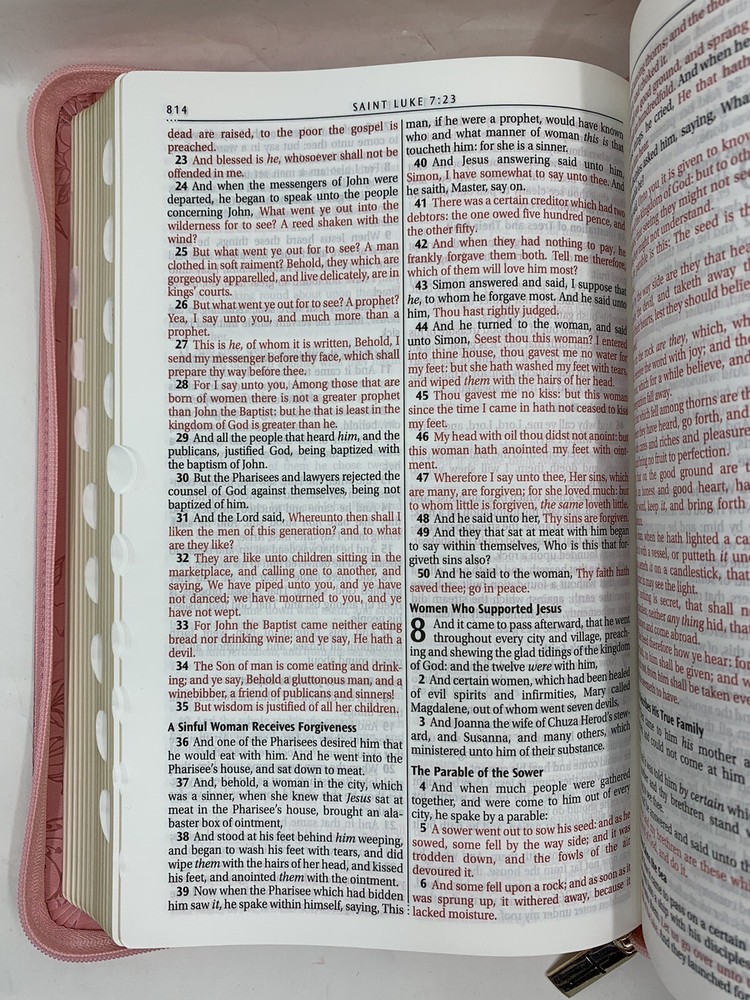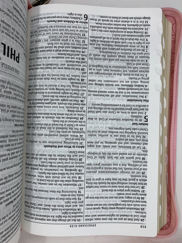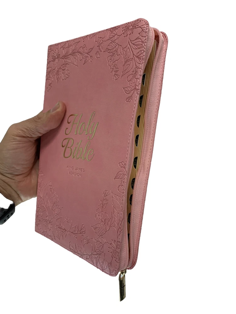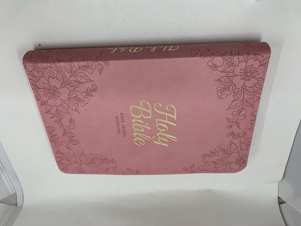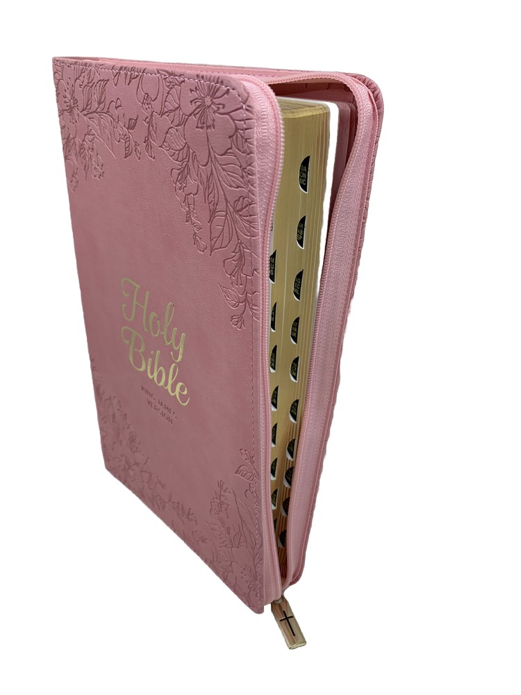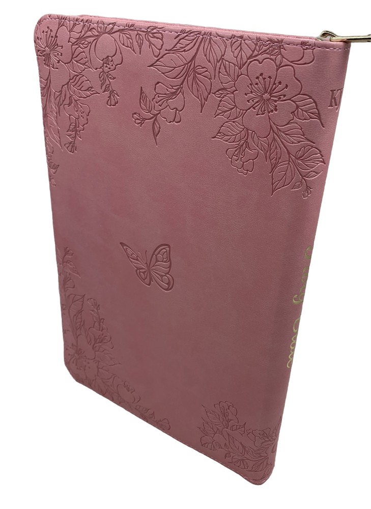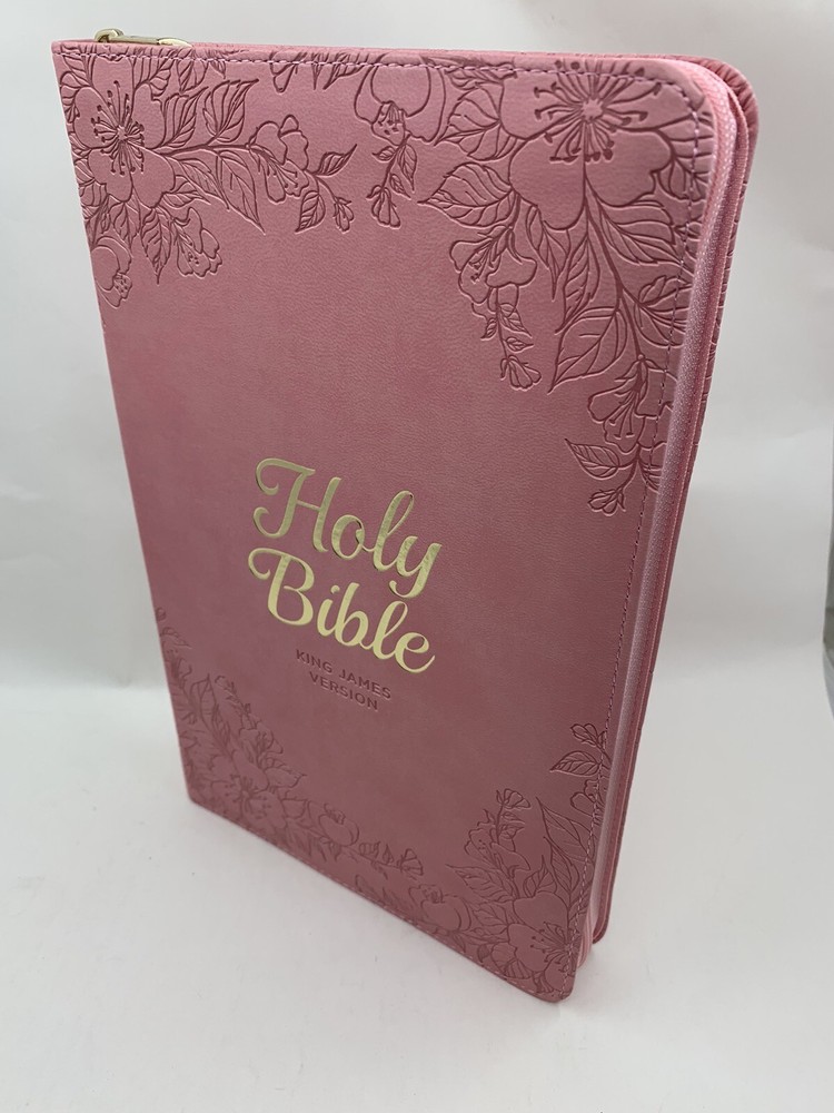 The Blossom Pink Faux Leather King James Version Deluxe Gift Bible with Thumb Index and Zippered Closure is a delightful choice to commemorate a daughter's baptism or confession of faith. Its exquisite design and thoughtful features make it a meaningful gift that she will cherish during this significant milestone in her life. Heat-debossed floral design Blossom-pink faux leather Gold-foiled title Heat-debossed version reference Gold-foiled spine title and heat-debossed version reference Classic King James Version text Deluxe Gift Bible Zippered closure Cross-engraved gold metal zipper pull Attached satin ribbon marker Gilt-edged pages Thumb index Flexcover Lay-flat spine Double-column format Reader-friendly subheadings Words of Christ in red ink Thematic Scripture verse finder One-year Bible reading plan 8 full-color maps Presentation page 1002 pages Text size: 9-point type Packaged in full-color printed cardboard sleeve Size: 9.1" x 6" x 1.1" (231 x 152 x 28 mm)