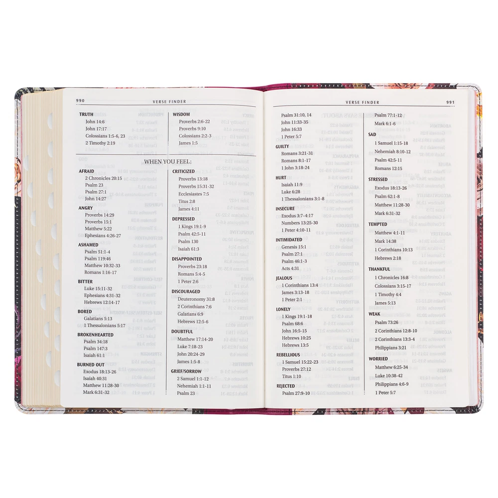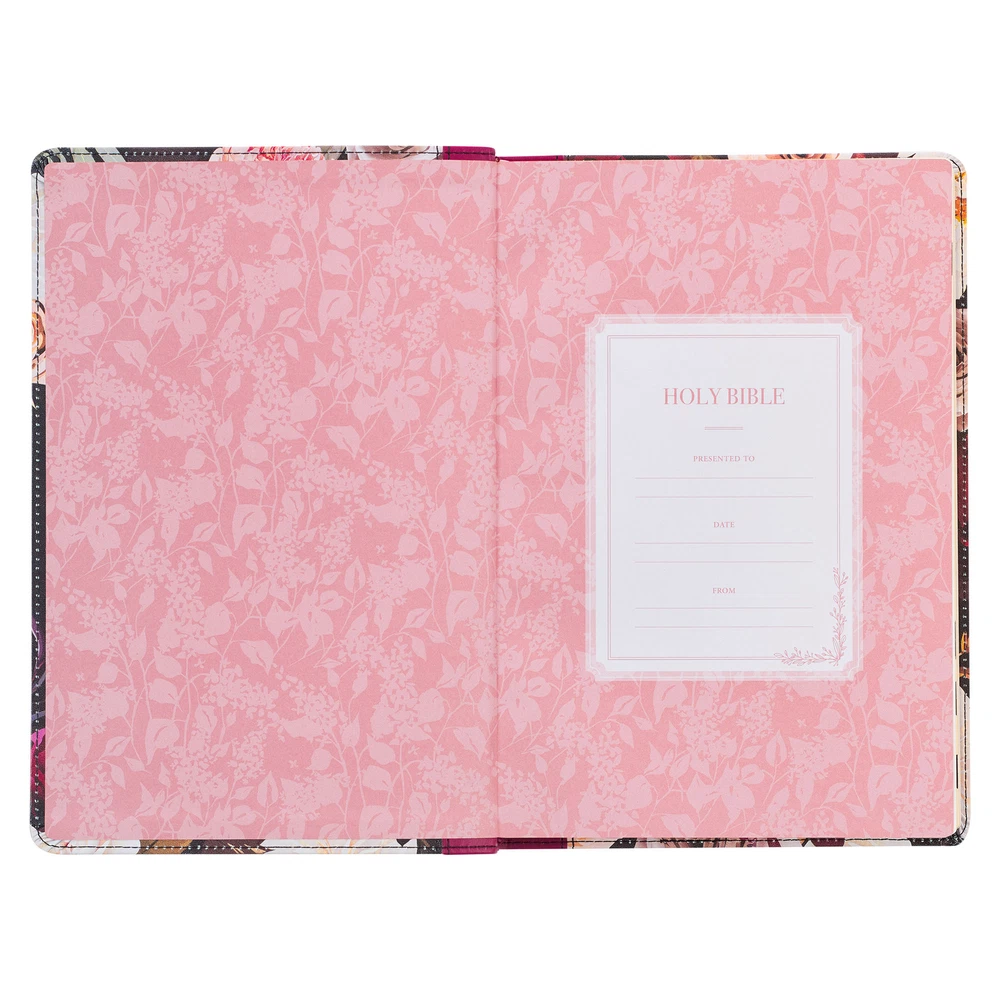 The exquisite design of the Black and Burgundy Floral Faux Leather Large Print Thinline King James Version Bible with Thumb Index makes it a stunning gift that will leave her breathless. This luxury Bible features convenient thumb indexing tabs and a gorgeous screen-printed cover design. Despite its luxurious appeal, it remains lightweight, and easy to hold. Visit Storefront Contact Us View Feedback About Our Company KJV Holy Bible, Thinline Large Print Faux Leather Red Letter Edition Thumb Index, Ribbon Marker, King James Version, Black/Burgundy Printed Floral Item Details The exquisite design of the Black and Burgundy Floral Faux Leather Large Print Thinline King James Version Bible with Thumb Index makes it a stunning gift that will leave her breathless. This luxury Bible features convenient thumb indexing tabs and a gorgeous screen-printed cover design. Despite its luxurious appeal, it remains lightweight, and easy to hold. The exquisite design of the Black and Burgundy Floral Faux Leather Large Print Thinline King James Version Bible with Thumb Index makes it a stunning gift that will leave her breathless. This luxury Bible features convenient thumb indexing tabs and a gorgeous screen-printed cover design. The Thinline Bible has a thin spine that is lightweight and easy to hold. An expanded burgundy faux leather spine elegantly washes onto the front and back covers of this Thinline Bible and securely connects them with a double row of topstitching. The black front cover is screen-printed with delicate white and pink flowers, complemented by rich burgundy blooms and gold-foiled leaf outlines, creating a captivating floral design. The gold-foiled title is beautifully framed by these gorgeous flowers. HOLY BIBLE The back cover boasts a dark background overflowing with the same beautiful flowers. The title is artfully replicated in gold foil on the burgundy faux leather spine, while the version reference is set at the very top in gold-foiled letters. KJV Thumb indexing tabs and gilt-edged pages are luxury features that elevate the design of this Thinline Bible. Other design features include a pink satin ribbon marker to mark your page, a lay-flat binding, and a presentation page that can be completed when the Bible is given as a gift. The Bible offers several features that enhance the reading experience. Its thin spine and lightweight binding ensure easy handling. The slightly larger 10-point type text is presented in a reader-friendly double-column format with helpful subheadings. A Scripture verse finder is organized by topic to aid in locating specific verses. Additionally, eight full-color maps provide geographical context, while the words of Christ are printed in red for emphasis. A one-year Bible reading plan is included for those seeking structure to keep them motivated. The Bible is elegantly packaged in a full-color printed cardstock sleeve. Experience the captivating beauty of the original KJV Bible's poetic language in this remarkable edition. Over 400 years since its first printing, the KJV text has remained an enduring testament to its remarkable accuracy. Its rich heritage is beautifully reflected in the distinctive spelling and grammatical structure that deviates from modern usage. Immerse yourself in the language that has withstood the test of time, embracing the profound legacy of this cherished translation. The Black and Burgundy Floral Faux Leather Large Print Thinline King James Version Bible with Thumb Index is an exquisite gift that will please any woman. Its gorgeous cover design and many practical features make the Black and Burgundy Floral Faux Leather Large Print Thinline King James Version Bible with Thumb Index the ideal gift for celebrating a beloved grandmother or mother on her birthday. Screen-printed floral cover design Burgundy faux leather Gold-foiled title Gold-foiled title and version reference on the spine Flexcover Classic King James Version Thinline Thumb index 1016 gilt-edged pages Gold gilt edging Lay-flat spine Satin ribbon marker Double-column format Words of Christ in red ink Thematic Scripture verse finder One-year Bible reading plan 8 full-color maps Presentation page 10-point type Packaged in a full-color cardstock sleeve Size: 9.7" x 6.7" x 1.1" (246 x 170 x 28mm) Return Policy To ensure complete satisfaction of our customers, we offer a 30 day return policy for all orders. Please reach out to us if you have any questions and one of our friendly customer service representatives will reply within 24 hours. This excludes weekends and holidays. Shipping Information All orders are fulfilled and shipped within 1-2 business days excluding holidays and will be shipped via standard economy shipping. Please do not hesitate to reach out with any questions. Please Note: Our hours of operation are Monday-Friday, 8am-5pm (CST). All orders received before 2pm (CST) will be processed & shipped within 1-2 business days.* Average transit times are 2-7 business days to the contiguous 48 United States and the District of Columbia. (*Does not apply to holidays or special orders.) Shop Our Storefront | View Feedback | Contact Us | Add Us to Your Favorites