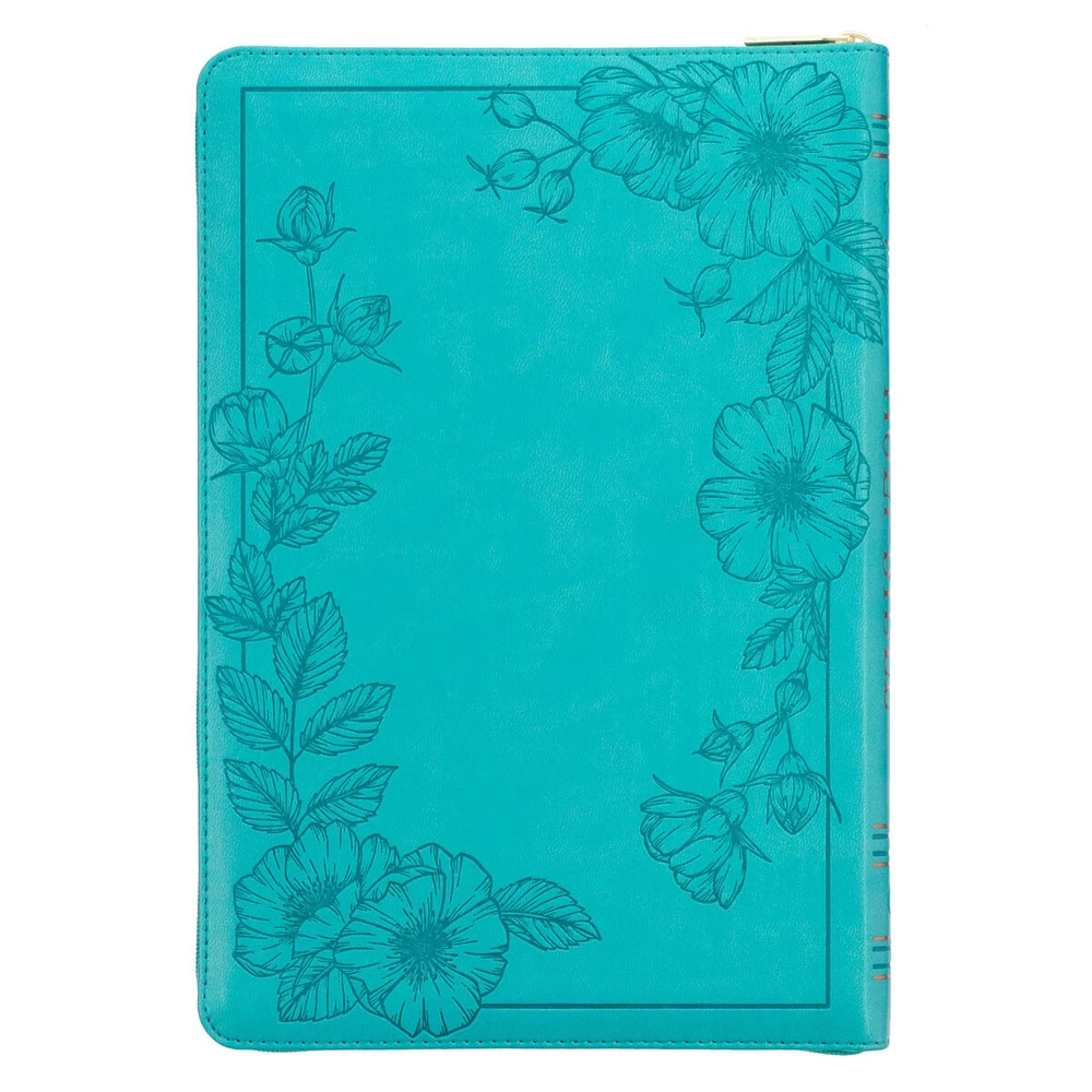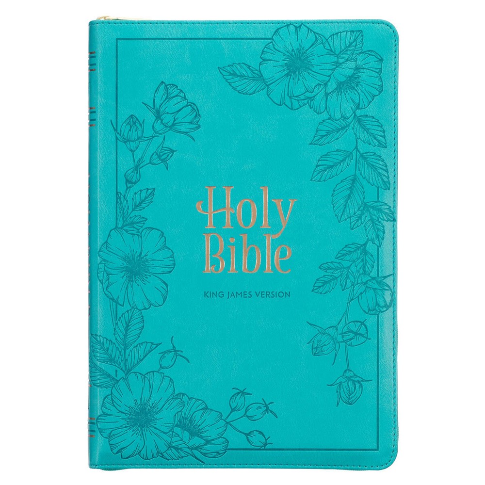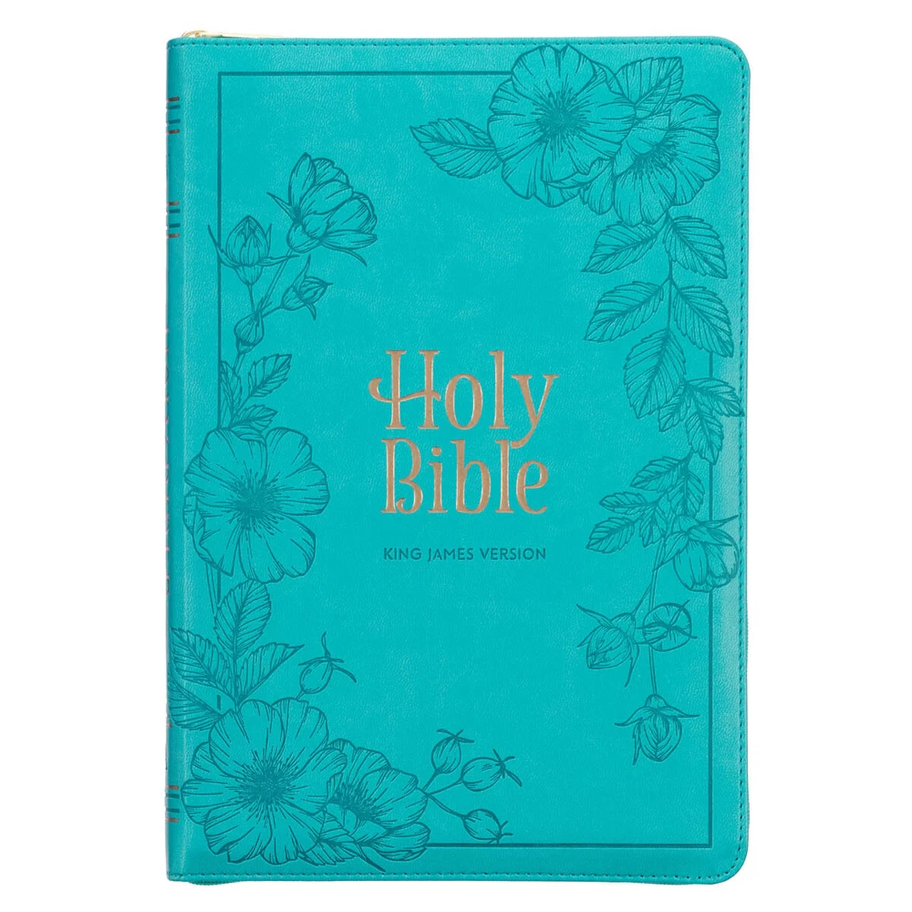 The Vibrant Teal Faux Leather Large Print Thinline King James Version Bible with Zippered Closure and Thumb Index is the perfect blend of style and convenience. This beautiful Bible offers the timeless beauty of the KJV text with the practicality of a Thinline format, thumb indexing, and a zippered closure. Visit Storefront Contact Us View Feedback About Our Company KJV Holy Bible, Thinline Large Print Faux Leather Red Letter Edition Thumb Index, Ribbon Marker, King James Version, Vibrant Teal, Zipper Closure Item Details The Vibrant Teal Faux Leather Large Print Thinline King James Version Bible with Zippered Closure and Thumb Index is the perfect blend of style and convenience. This beautiful Bible offers the timeless beauty of the KJV text with the practicality of a Thinline format, thumb indexing, and a zippered closure. The Vibrant Teal Faux Leather Large Print Thinline King James Version Bible with Zippered Closure and Thumb Index is the perfect blend of style and convenience. This beautiful Bible offers the timeless beauty of the KJV text with the practicality of a Thinline format, thumb indexing, and a zippered closure. Large heat-debossed florals wind their way along the heat-debossed frame on both the front and back covers. The title is foiled in gold and set in the middle of the frame with the heat-debossed version reference just below it. HOLY BIBLE KING JAMES VERSION The spine beautifully duplicates the heat-debossed title, accentuating it with two sets of gold-foiled spine ribs. The design features of this Bible include a teal zipper with a gold metal zipper pull, ensuring the security of loose notes. The zipper pull is engraved with a cross design. Thumb indexing tabs make navigating the Bible effortless, while gilt-edged pages add an extra touch of shimmer to the overall design. Completing the ensemble is a matching teal satin ribbon page marker that provides a convenient way to keep your place. A presentation page in the front of the Bible lets you add a meaningful message to mark a special occasion. The reader-friendly text layout of this Bible provides easy navigation with helpful subheadings for passages and a double-column format. The words of Christ, elegantly printed in red, draw attention to His teachings, and to provide geographical context to the historical events of the Bible, eight full-color maps are included. Additionally, a thematic Scripture verse finder assists in locating themes and verses while a one-year Bible reading plan is provided to structure your studies. The comfortable 10-point type offers larger text compared to standard prints. This edition features the original poetic language of the KJV text, renowned for its enduring accuracy even after 400 years. Immerse yourself in its captivating heritage as you discover the distinctive spelling and grammatical structure that beautifully reflects the language of that era. Delight your daughter with the exquisite Vibrant Teal Faux Leather Large Print Thinline King James Version Bible . Its thoughtful design, including a zippered closure and thumb index, makes it a truly remarkable gift to commemorate her baptism or confession of faith. The Vibrant Teal Faux Leather Large Print Thinline King James Version Bible with Zippered Closure and Thumb Index embodies elegance and practicality and will become a cherished companion on her spiritual journey. Heat-debossed floral frame cover design Vibrant teal faux leather Gold-foiled title Heat-debossed version reference Gold-foiled spine design Flexcover Classic King James Version Thinline Zippered closure Gold metal zipper pull Thumb index 1016 gilt-edged pages Lay-flat spine Satin ribbon marker Double-column format Words of Christ in red ink Thematic Scripture verse finder One-year Bible reading plan 8 full-color maps Presentation page 10-point type Packaged in a full-color cardstock sleeve Size: 9.9" x 6.8" x 1.1" (251 x 173 x 28mm) Return Policy To ensure complete satisfaction of our customers, we offer a 30 day return policy for all orders. Please reach out to us if you have any questions and one of our friendly customer service representatives will reply within 24 hours. This excludes weekends and holidays. Shipping Information All orders are fulfilled and shipped within 1-2 business days excluding holidays and will be shipped via standard economy shipping. Please do not hesitate to reach out with any questions. Please Note: Our hours of operation are Monday-Friday, 8am-5pm (CST). All orders received before 2pm (CST) will be processed & shipped within 1-2 business days.* Average transit times are 2-7 business days to the contiguous 48 United States and the District of Columbia. (*Does not apply to holidays or special orders.) Shop Our Storefront | View Feedback | Contact Us | Add Us to Your Favorites