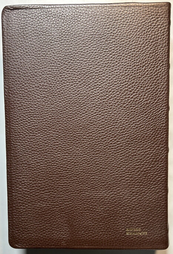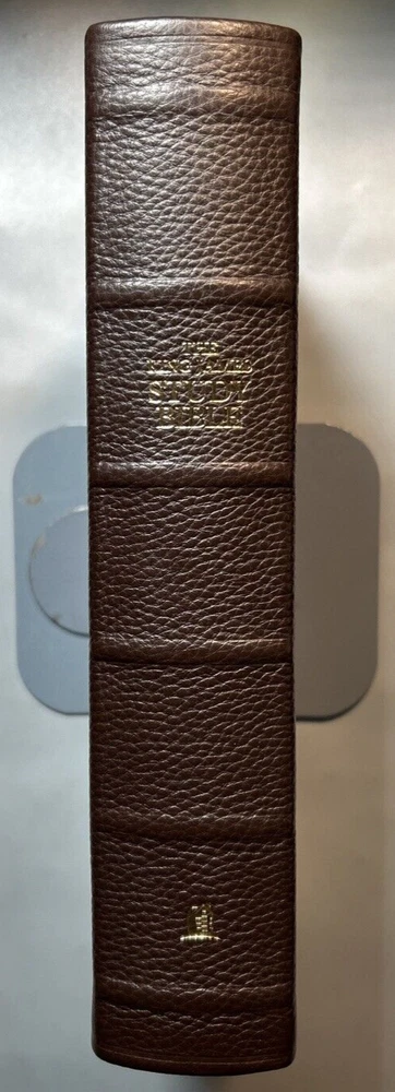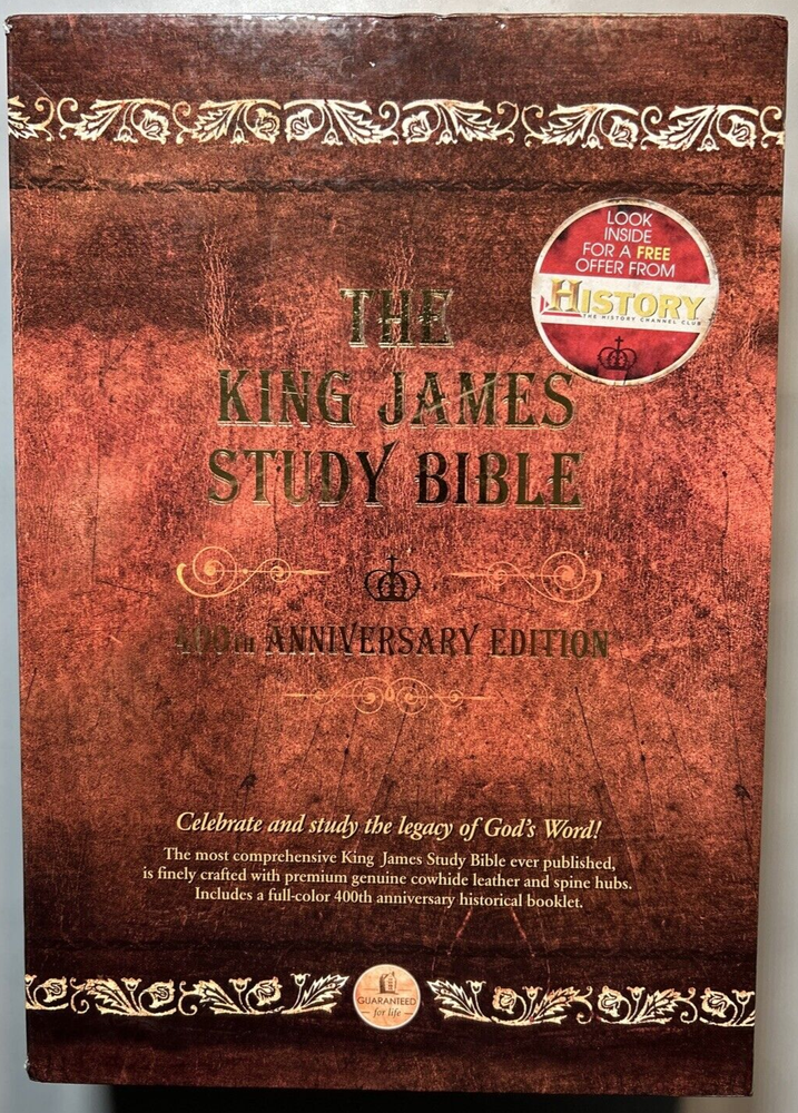 KJV King James Study Bible 400th Anniversary Edition Brown Genuine Leather Like New In Box. Here are details on this Bible: 1. The print size is a 9 point type. 2. The cover size is 6 1/2" x 9 3/4" x 2". 3. Here are some of the features of this Bible: *Ribbed spine. *Presentation page. *400th Anniversary edition of the KJV. *Book introductions. *Center column references. *Words of Christ in red. *Ribbon markers. *Concordance. *Color maps. *Much more! Listed as "Like New", here are details on this Bible: Shows light handling wear, otherwise New.