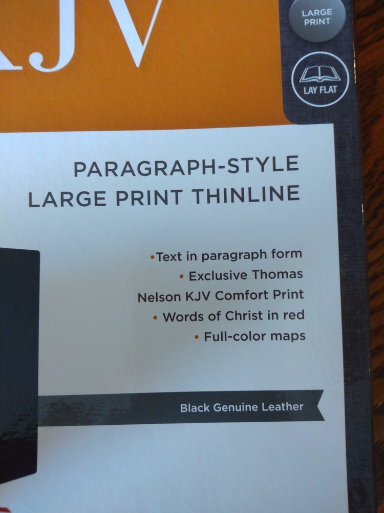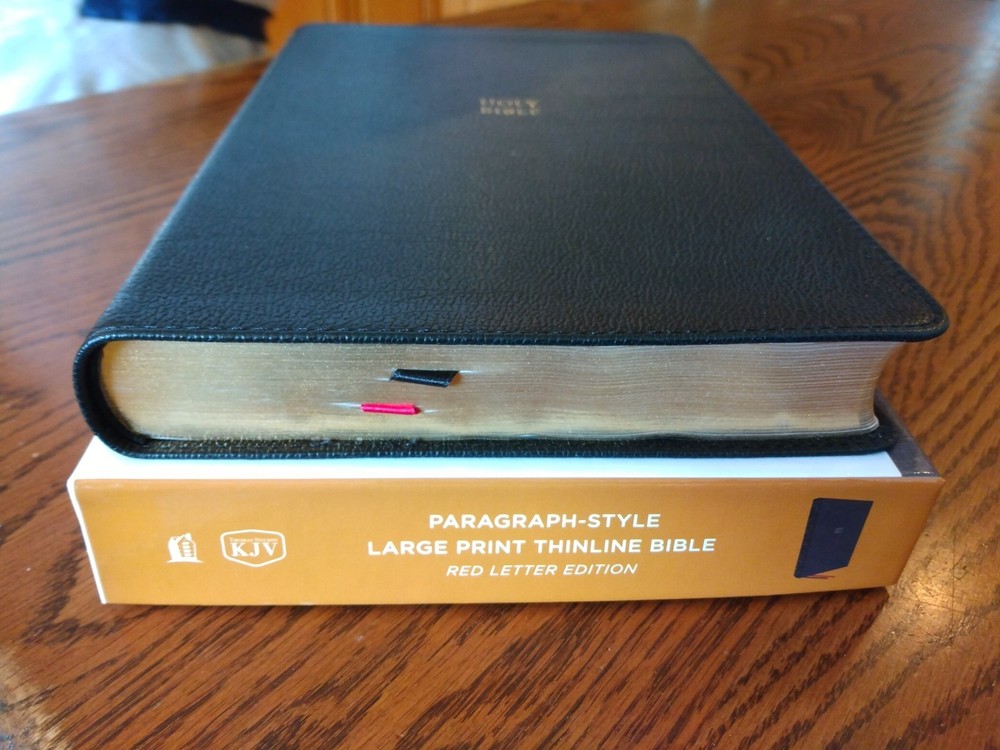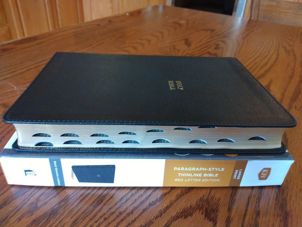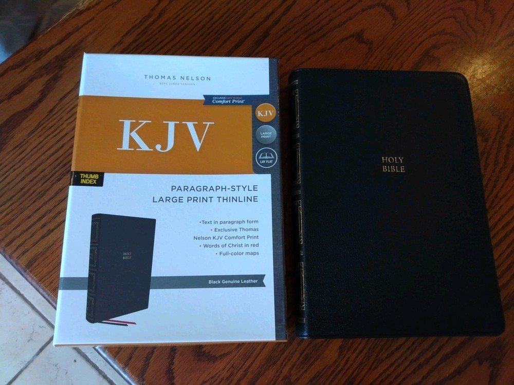 KJV LARGE PRINT Thinline Bible Thumb Indexed ~ $104.99 Retail ~ Genuine Leather Font/Text size is 10 point Dimensions: 9.25 X 6.25 (inches) x 1.25" approx Red letter for Christ's words Thumb Indexed Product Description God's Word is brought to you in a large text with a thin book profile in the KJV Paragraph-style Large Print Thinline Bible and, most importantly of all, presents the hope of Scripture in a format that helps you keep your place in the text. Not only is the translation in the venerable 1611 King James Version, but each verse of scripture is given it's own paragraph, with the purpose of helping your eyes keep track of where you are on the page and keeping your engaged in the biblical story. Features: Clear and readable 10-point KJV Comfort Print Line-matched double column text Bible book introductions Words of Christ in red Over 22,000 translator notes Over 43,000 cross-referenced passages Concordance One-year Bible Reading Plan The Parables of Jesus Christ chart The Miracles of Jesus Christ chart 8 pages of full-color maps 2 satin ribbons Product Information Title: KJV Paragraph-style Large Print Thinline Bible, Comfort Print--genuine leather, black (indexed) Format: Genuine Leather Number of Pages: 1376 Vendor: Thomas Nelson Publication Date: 2023 Dimensions: 9.25 X 6.25 (inches) Weight: 2 pounds 7 ounces ISBN: 0785290362 ISBN-13: 9780785290360 References: Cross References Text Layout: Double Column Text Color: Red Letter Text Size: 10 Point Thumb Index: Yes Ribbon Marker: Yes Feel free to ask questions. I try to return and answer your questions in a timely manner and as soon as I am able. NO RETURNS. Please buy responsibly. Visit my eBay store at aboundingjoy66