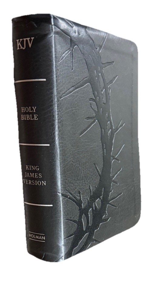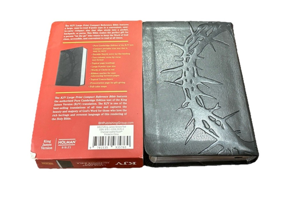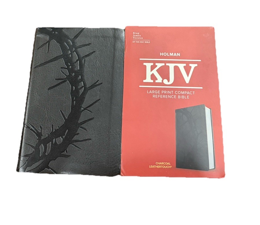 The KJV Bible is Large Print Compact Reference in easy to read size 8 pt font. It contains the words of Christ in red and 2 columns of text per page. The Bible color is charcoal black with LeatherTouch leather. Bible contains ribbon place holder and full color maps. Free shipping with purchase! Thanks for stopping by!