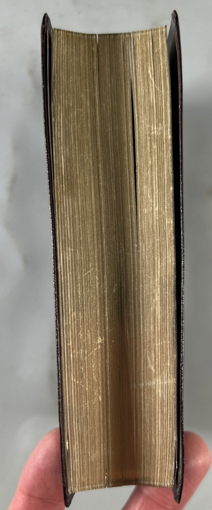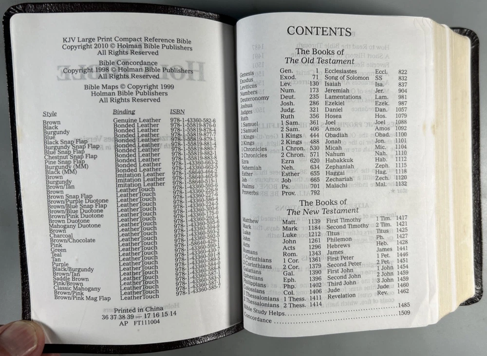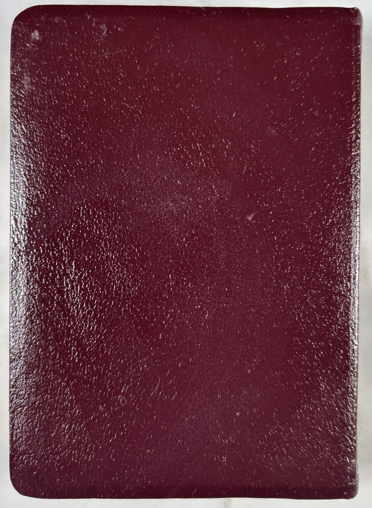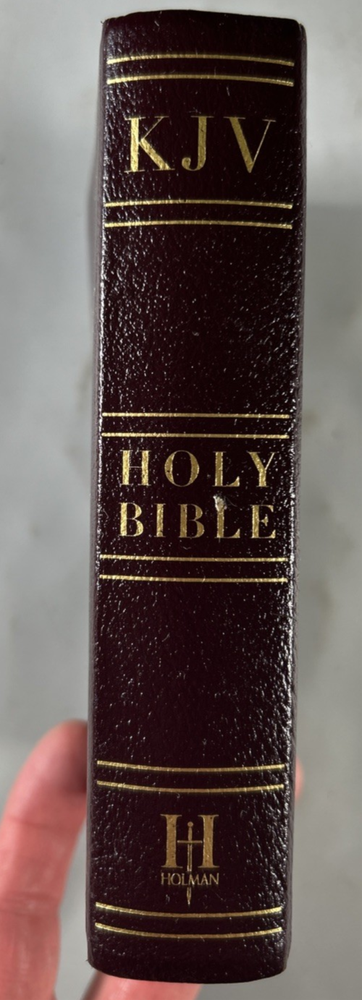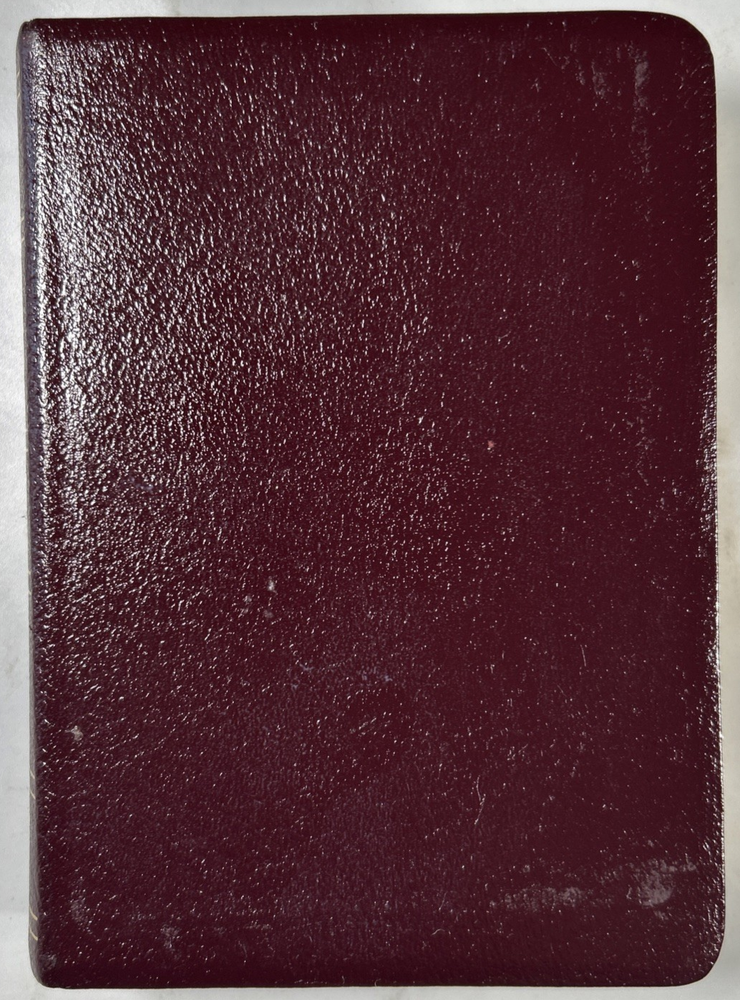 KJV Large Print Compact Reference Bible Burgundy Bonded Leather Clean G+. Here are details on this Bible: 1. The print size is a 8.5 point type. 2. The cover size is 4 1/4" x 6" x 1 1/4". 3. Here are some of the features of this Bible: *Presentation page. *Larger print. Please note, this is a compact Bible so the print is larger but far from giant print. *Words of Christ in red. *How to Read The Bible Through Article. *Concordance. *Color maps. Listed as "G+", here are details on the condition: The cover and gilding have wear from normal use. The Presentation Page and text are clean. There are a few pages with corner bends.