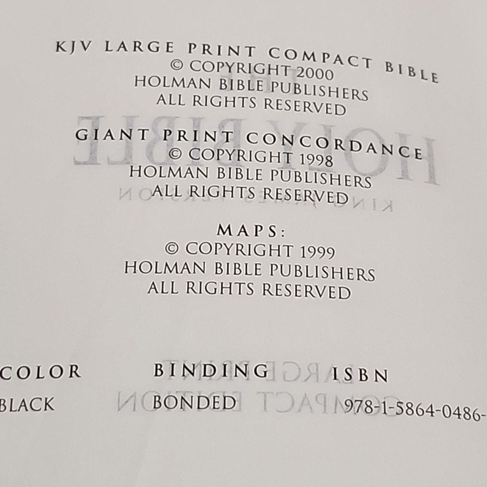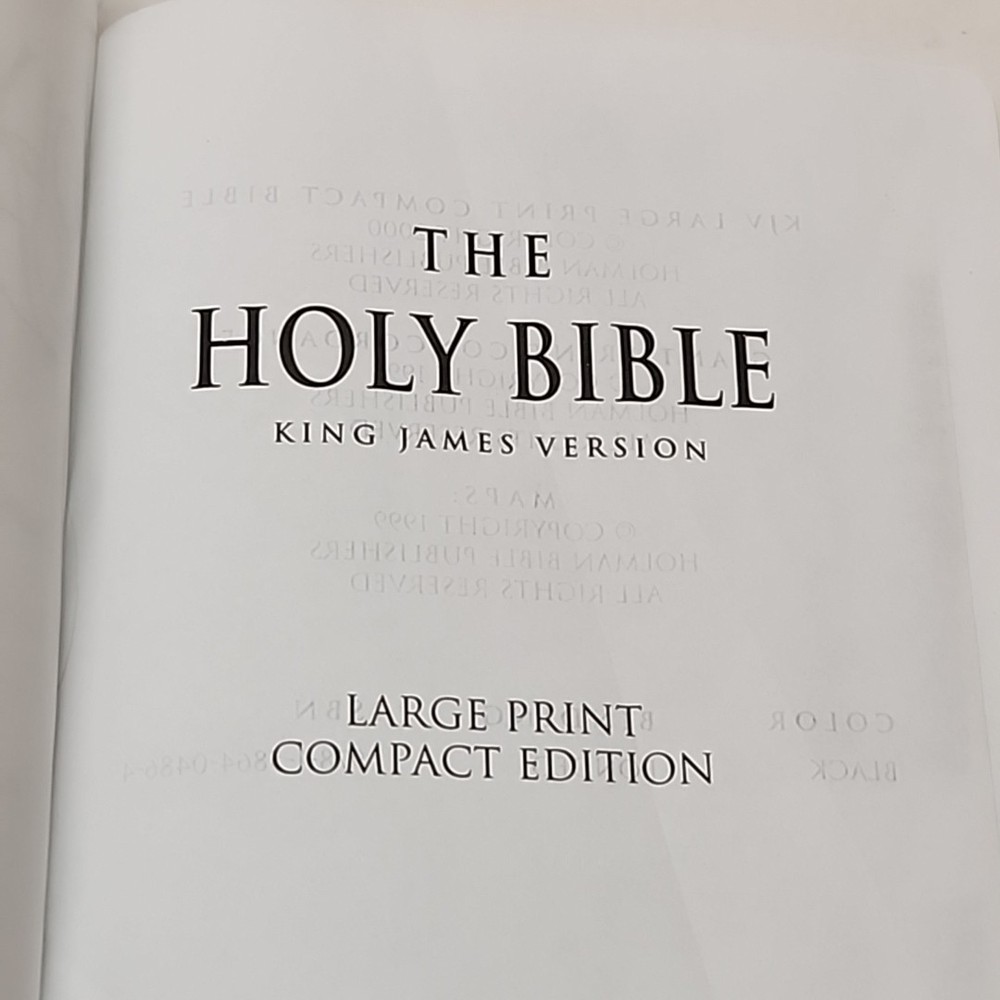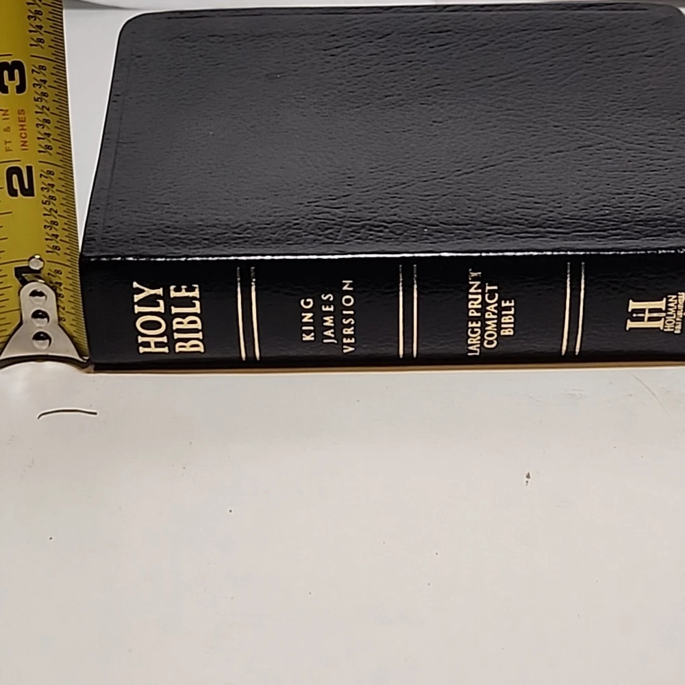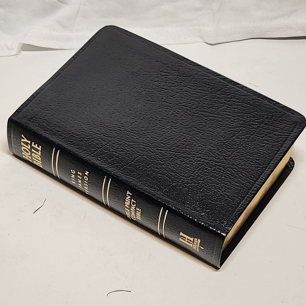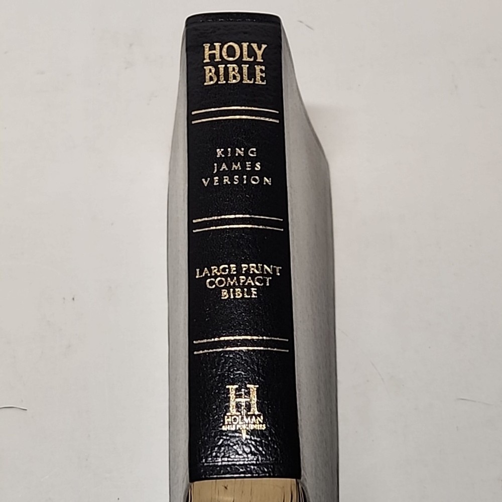 The product is a KJV Large Print Compact Reference Holy Bible in Black Leather by Holman Bible Publishers. It features a bonded leather cover with large type for easy reading. This historical book, originally written in English, has a vintage feel and is suitable for young adults, ages 4-8, ages 9-12, and adults. With 1568 pages, this Bible is a comprehensive collection of short stories and references in the King James Version, published in 2000.