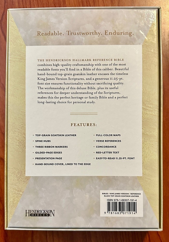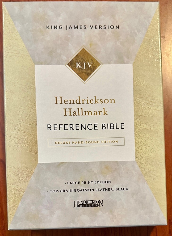 | Synopsis | Hendrickson Publishers is proud to introduce a one-of-a-kind deluxe hand-bound Bible in top-grain goatskin leather. This reference Bible is easily readable with 11.25-pt. type font, and features three ribbon markers, spine hubs, foil stamping, and comes packaged in a beautiful box. It would make the perfect heritage or family Bible, as well as a great long-lasting choice for personal study.Hendrickson Publishers has always been known for producing quality Bibles. This newest addition to our KJV Bible line exhibits the top-quality workmanship expected of a high-end Bible and rounds out our offerings with a new tier for those customers looking for the very best. Features: Top-grain goatskin leather Hand-bound lined-to-the-edge cover Foil stamping Spine hubs Three ribbon markers Gilded page edges Presentation page Full-color maps 2-piece box Verse references Concordance Red-letter text Easy to read 11.25-pt. font, Hendrickson Publishers is proud to introduce a one-of-a-kind deluxe hand-bound Bible in top-grain goatskin leather. This reference Bible is easily readable with 11.25-pt. type font, and features three ribbon markers, spine hubs, foil stamping, and comes packaged in a beautiful box. It would make the perfect heritage or family Bible, as well as a great long-lasting choice for personal study. Hendrickson Publishers has always been known for producing quality Bibles. This newest addition to our KJV Bible line exhibits the top-quality workmanship expected of a high-end Bible, and rounds out our offerings with a new tier for those customers looking for the very best. Features: - Top-grain goatskin leather - Hand-bound lined-to-the-edge cover - Foil stamping - Spine hubs - Three ribbon markers - Gilded page edges - Presentation page - Full-color maps - 2-piece box - Verse references - Concordance - Red-letter text - Easy to read 11.25-pt. font |