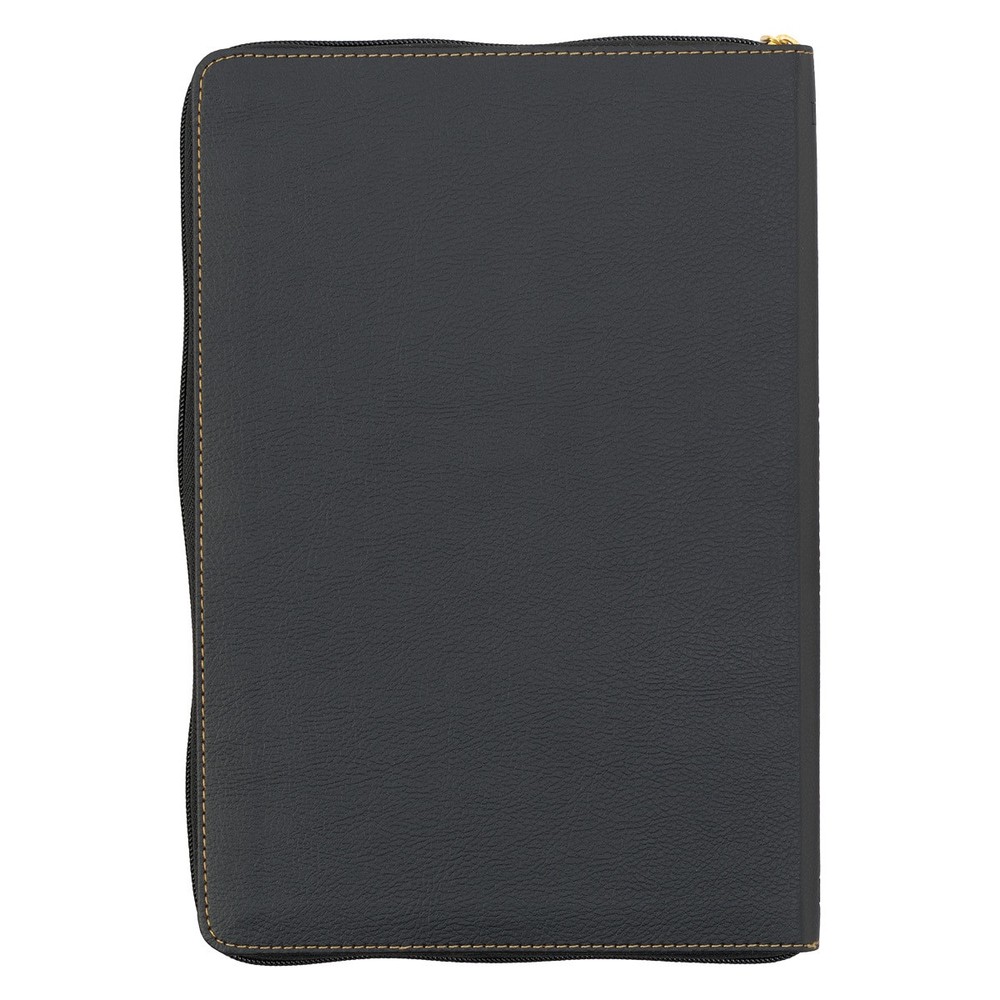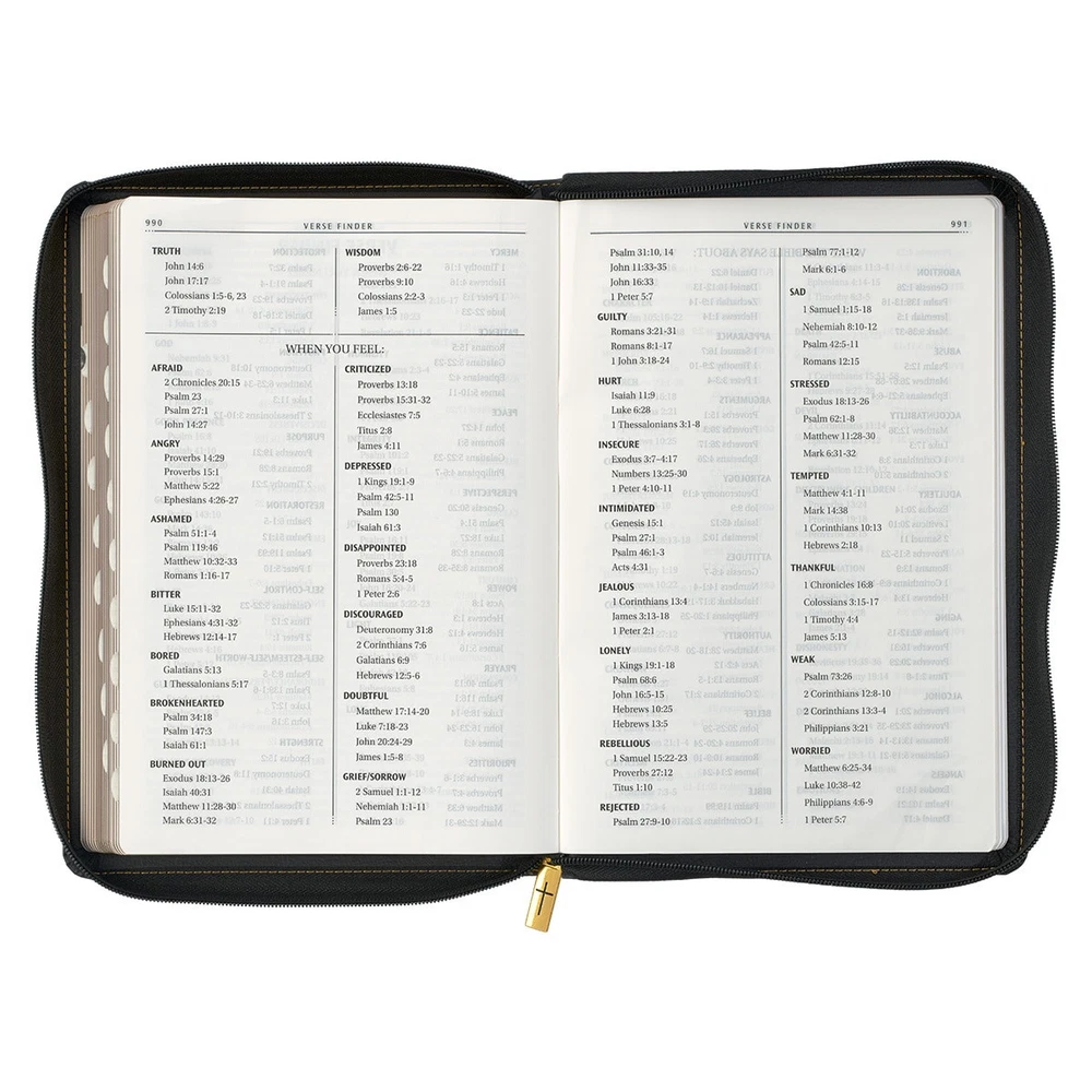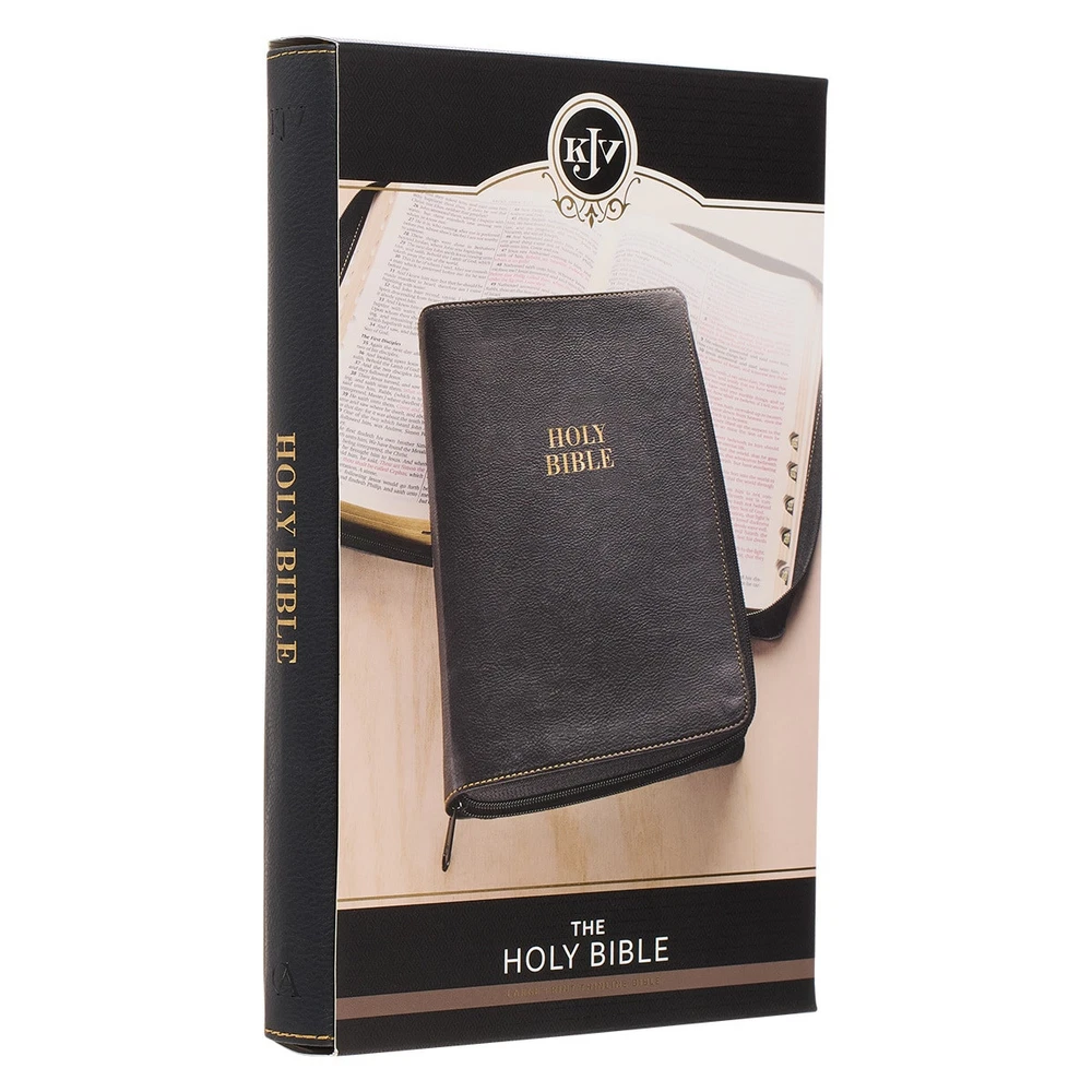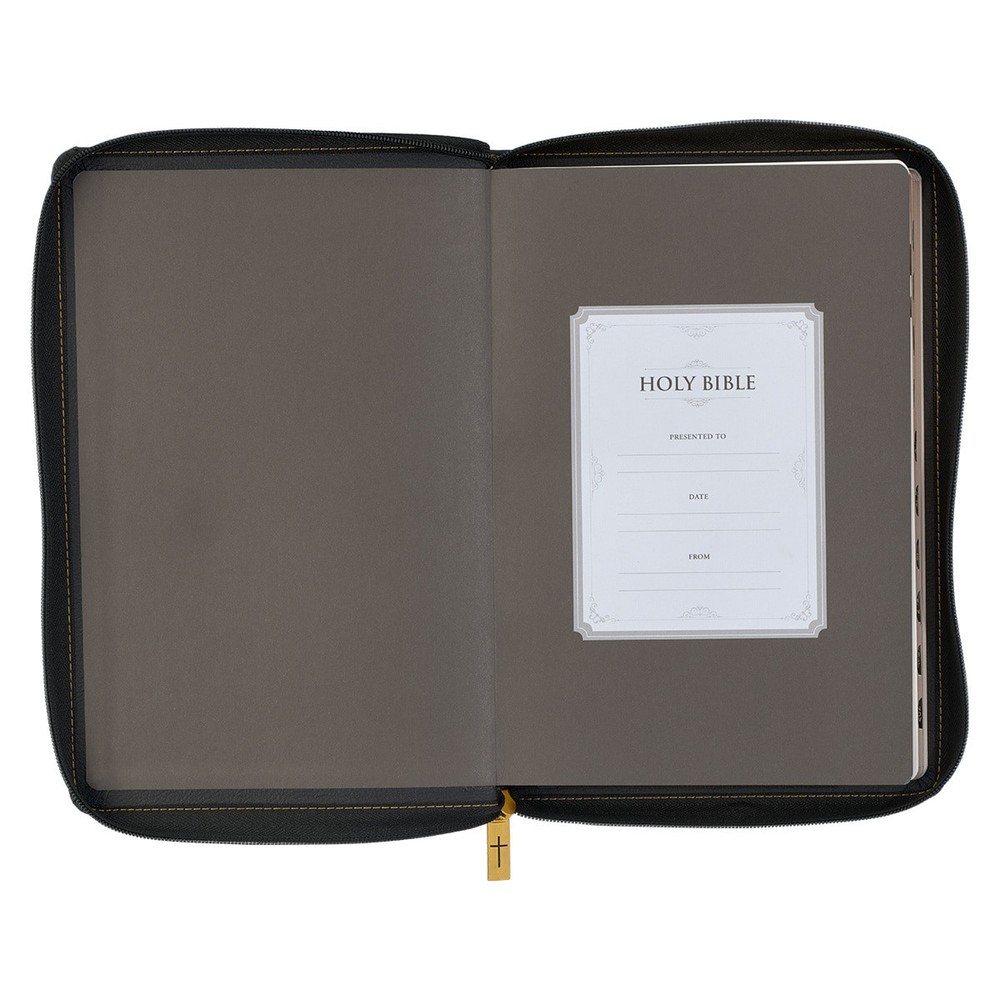 The magnified text and the plain yet sophisticated design of the Black Faux Leather Large Print Thinline King James Version Bible with Zippered Closure and Thumb Index makes it the perfect Bible for a father or son with exceptional taste. Visit Storefront Contact Us View Feedback About Our Company KJV Holy Bible, Thinline Large Print Faux Leather Red Letter Edition Thumb Index & Ribbon Marker, King James Version, Black, Zipper Closure Item Details The magnified text and the plain yet sophisticated design of the Black Faux Leather Large Print Thinline King James Version Bible with Zippered Closure and Thumb Index makes it the perfect Bible for a father or son with exceptional taste. The magnified text and the plain yet sophisticated design of the Black Faux Leather Large Print Thinline King James Version Bible with Zippered Closure and Thumb Index make it the perfect Bible for a father or son with exceptional taste. The black faux leather cover of the Bible is lightly texturized to mimic the look of genuine leather. Gold-toned topstitching along the edges adds strength to the construction and rounds off the design. The title is presented on the front cover and the spine in an elegant gold-foiled script. HOLY BIBLE The KJV version reference is heat-debossed on the spine. A sturdy black zipper with a gold zipper pull securely closes the Bible to keep all loose notes and bookmarks safe. Once the Bible is unzipped, you will find gilt-edged pages marked with elegant thumb indexing to locate passages quickly and a black satin ribbon marker to mark them. The text is presented in an easy-to-read 10-point type. Additional study features include a verse finder, a one-year reading plan, reader-friendly subheadings,8 full-color maps, and Christ’s words printed in red ink. A presentation page is also found at the front. This edition uses the original KJV Bible's beautiful poetic language. The KJV text has stood the test of time and is still considered one of the most accurate translations 400 years after it was first printed. You will see this rich heritage reflected in the spelling and grammatical structure and note that it deviates from their modern usage. Ideal for welcoming new members to your church, the Black Faux Leather Large Print Thinline King James Version Bible with Zippered Closure and Thumb Index is an excellent choice for believers at any stage of their faith journey. Texturized faux leather cover Black faux leather Flexcover Gold-foiled and heat-debossed title Classic King James Version Thumb index Zippered closure Thinline 1016 gilt-edged pages Lay-flat spine Satin ribbon marker Double-column format Words of Christ in red ink Thematic Scripture verse finder One-year Bible reading plan 8 full-color maps Presentation page 10-point type Size: 9.9" x 6.8" x 1.1" (251 x 173 x 28mm) Return Policy To ensure complete satisfaction of our customers, we offer a 30 day return policy for all orders. Please reach out to us if you have any questions and one of our friendly customer service representatives will reply within 24 hours. This excludes weekends and holidays. Shipping Information All orders are fulfilled and shipped within 1-2 business days excluding holidays and will be shipped via standard economy shipping. Please do not hesitate to reach out with any questions. Please Note: Our hours of operation are Monday-Friday, 8am-5pm (CST). All orders received before 2pm (CST) will be processed & shipped within 1-2 business days.* Average transit times are 2-7 business days to the contiguous 48 United States and the District of Columbia. (*Does not apply to holidays or special orders.) Shop Our Storefront | View Feedback | Contact Us | Add Us to Your Favorites