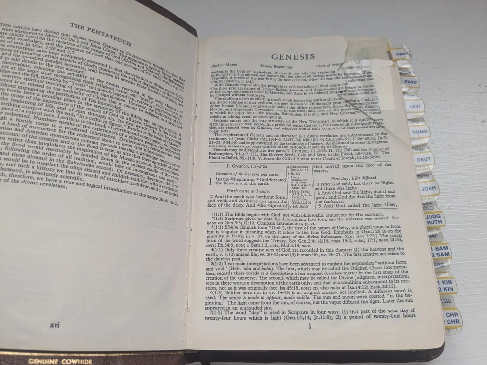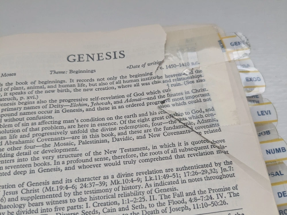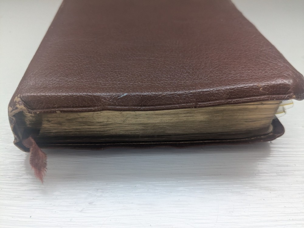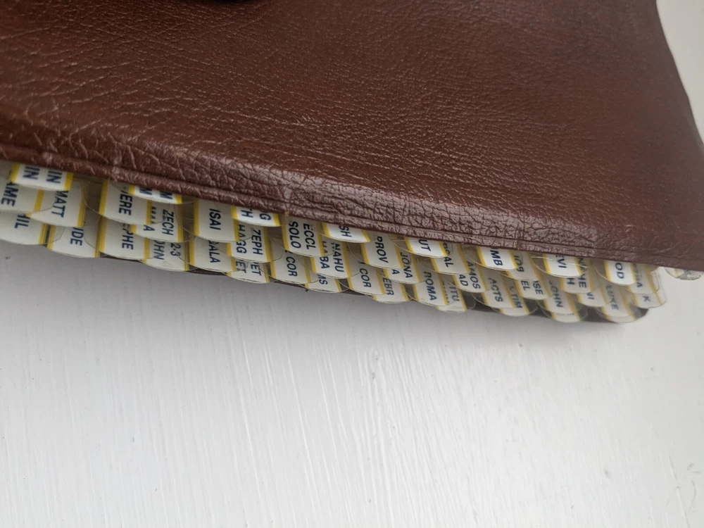 Bible measures 5 and 1/2 in x 8 in. Binding is strong. No name in front. Homemade book tabs on spine. Flipping to the Bible I see it quite a bit of ink underlining (over 100pages) also occasional yellow highlighting. I noticed two pages are torn- see last two photos.