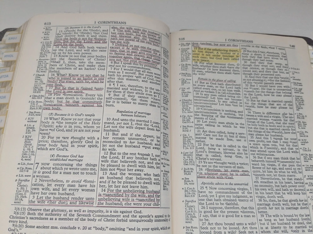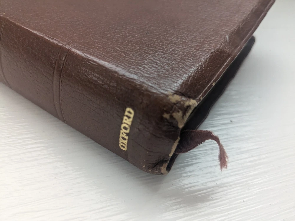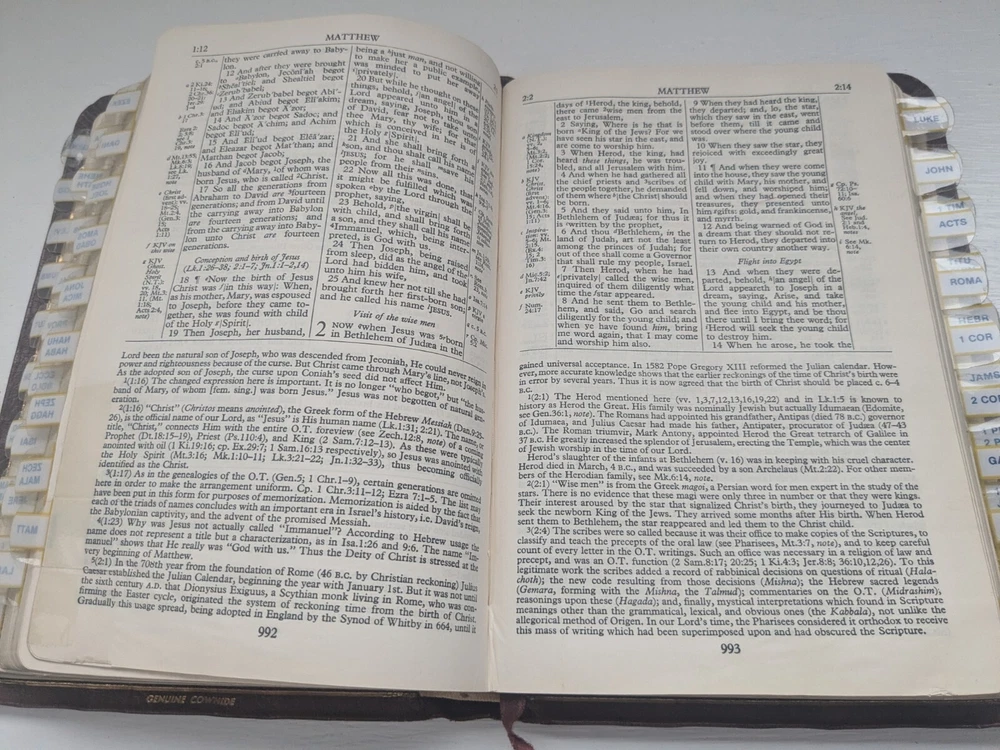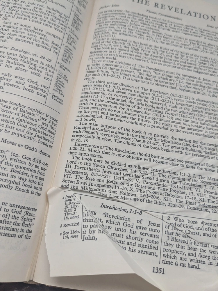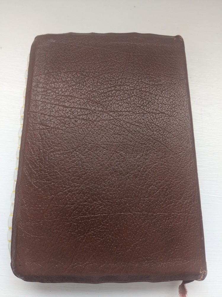 Bible measures 5 and 1/2 in x 8 in. Binding is strong. No name in front. Homemade book tabs on spine. Flipping to the Bible I see it quite a bit of ink underlining (over 100pages) also occasional yellow highlighting. I noticed two pages are torn- see last two photos.