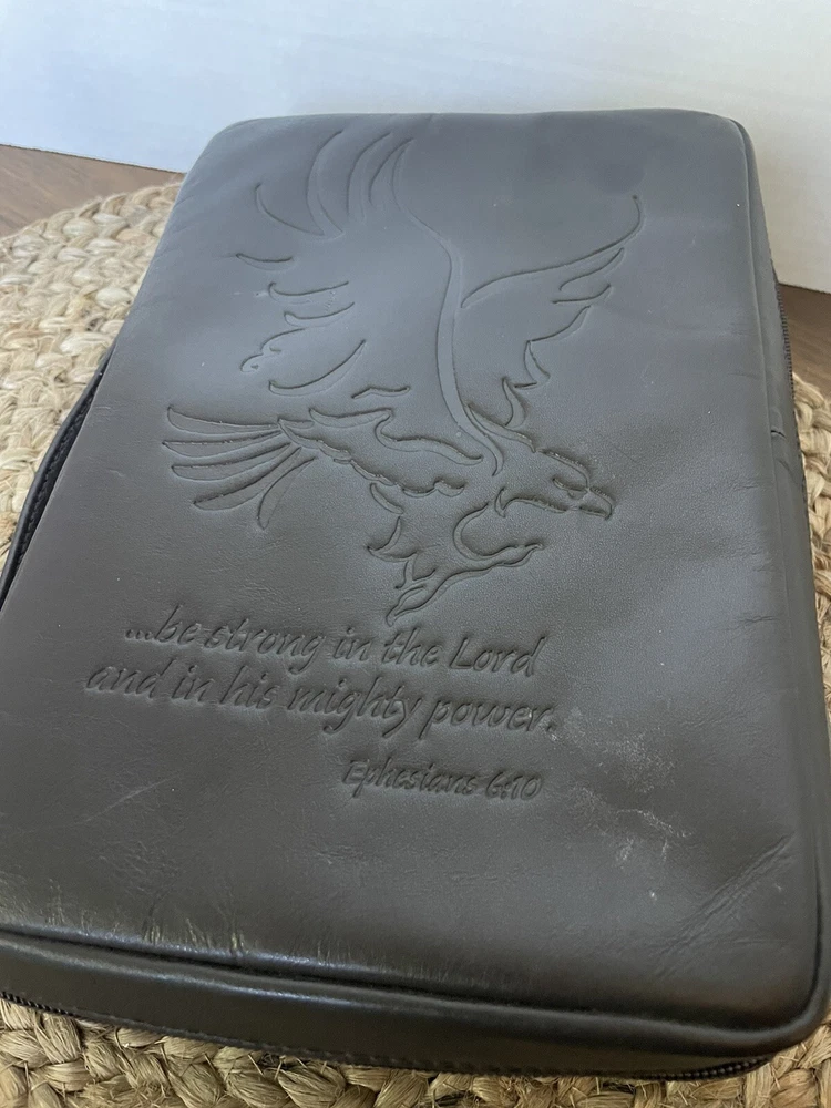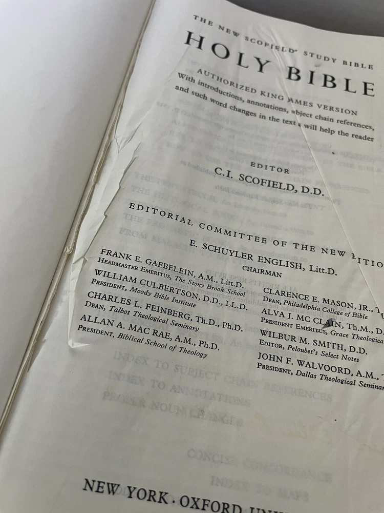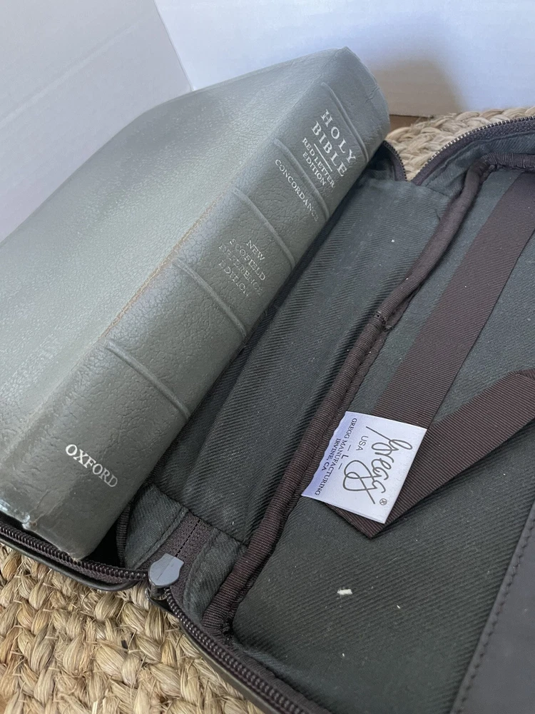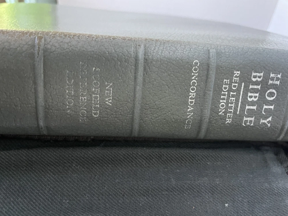 KJV New Scofield Reference Edition Study Bible With Leather Bible Cover First page slightly ripped around seam. Has study notes Comes with cover...