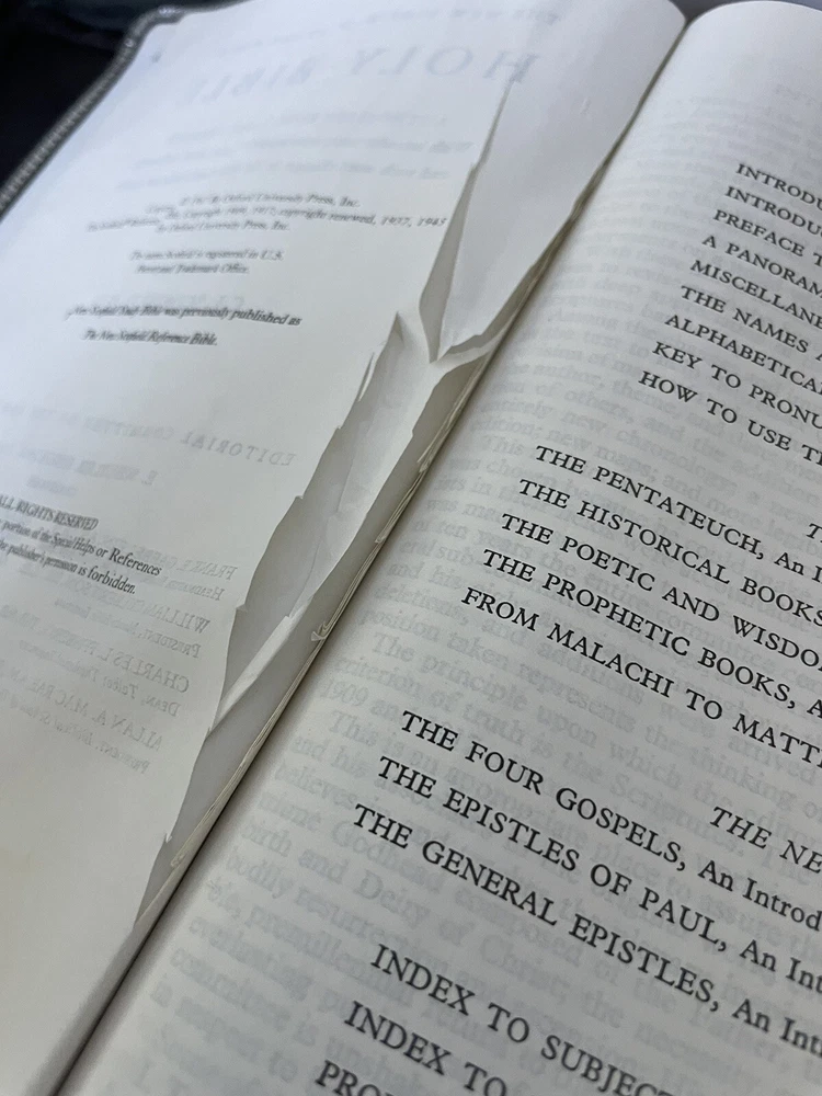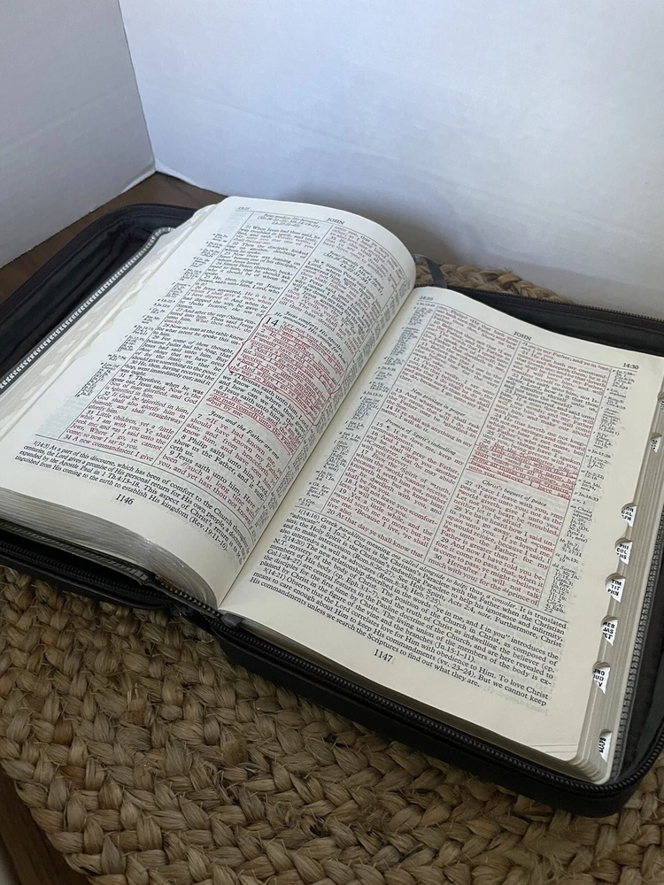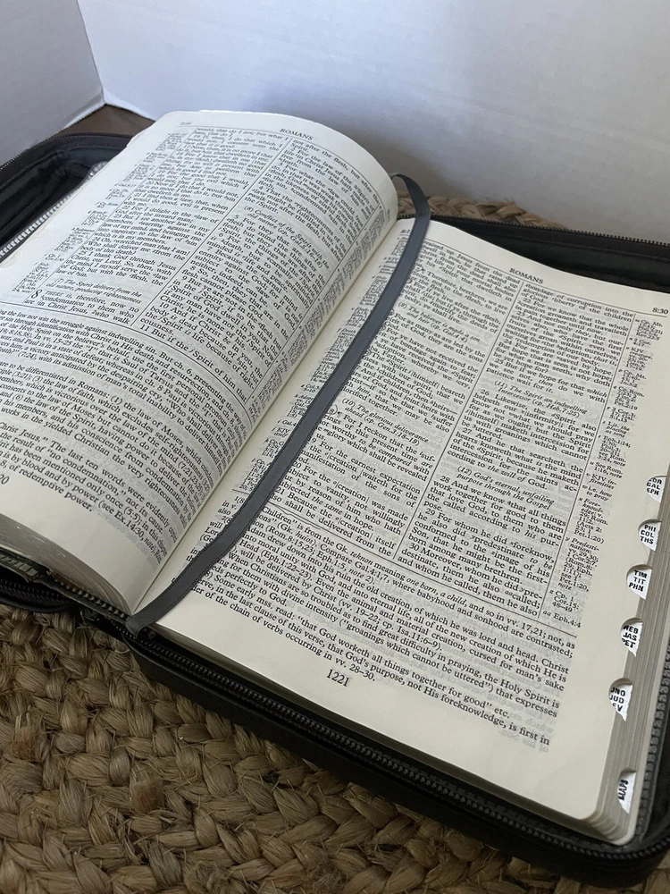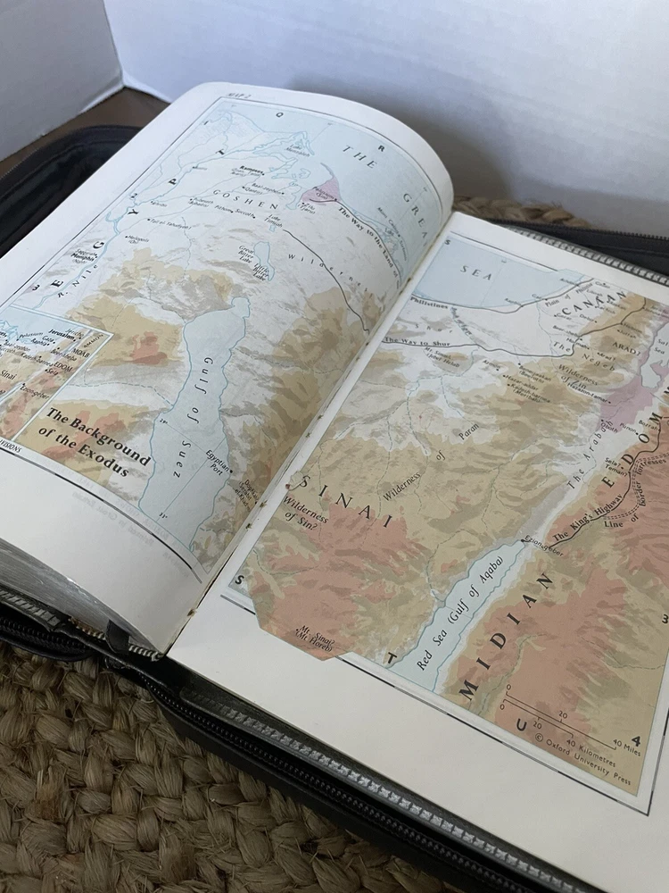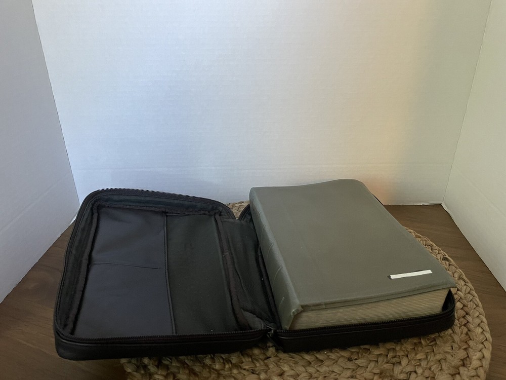 KJV New Scofield Reference Edition Study Bible With Leather Bible Cover First page slightly ripped around seam. Has study notes Comes with cover...