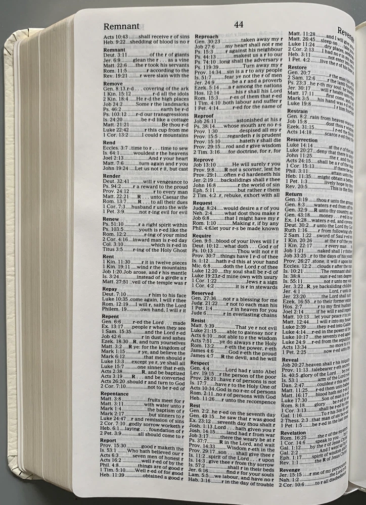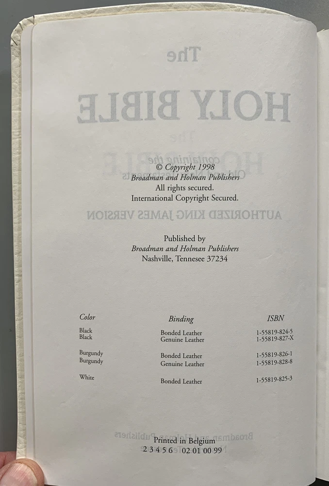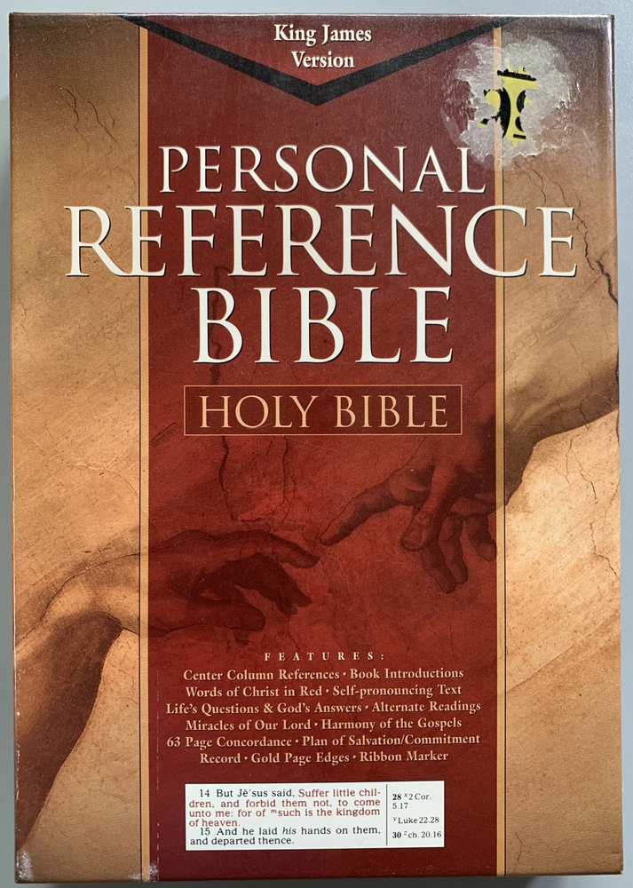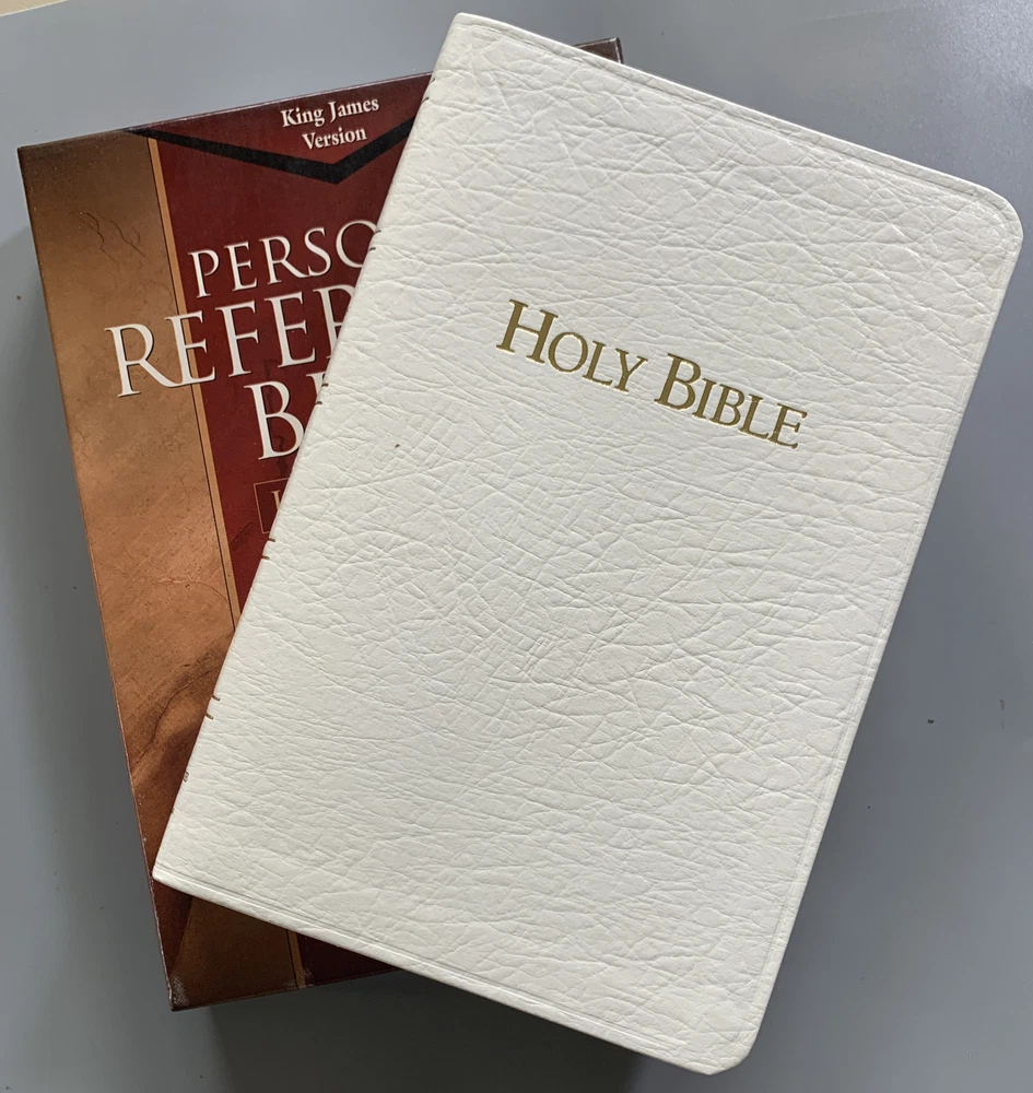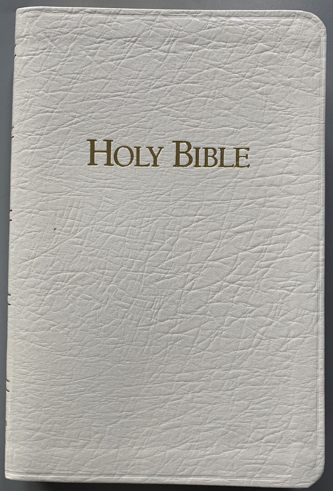 KJV Personal Reference Bible White Bonded Leather Red Letter VG. Here are details on this Bible: 1. The print size is a 8.5 point font 2. The cover size is 5 5/8" x 8 3/8" x 1" 3. Here are some of the features of this Bible: *Words of Christ in red *Ribbon marker *Center column references *Book introductions *Concordance *Color maps See pictures. Cover and gilding are like new. Presentation page had a name which has been covered with an Avery Trueblock Label. Text is clean.