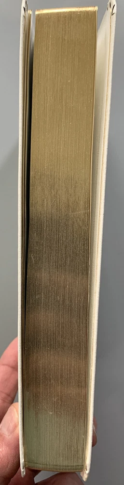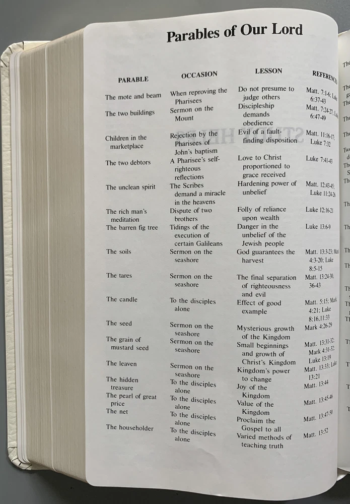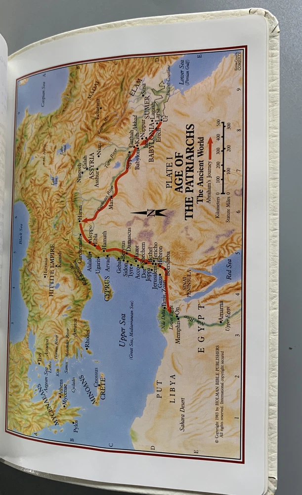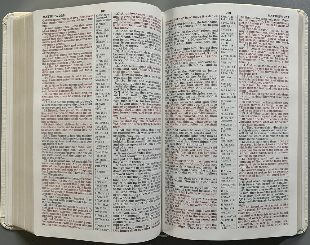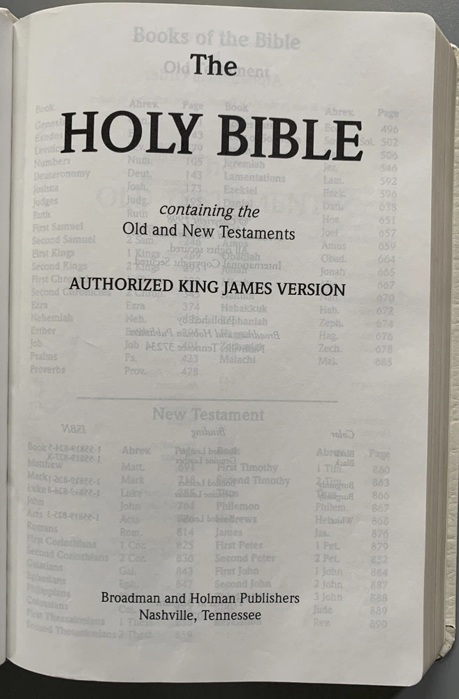 KJV Personal Reference Bible White Bonded Leather Red Letter VG. Here are details on this Bible: 1. The print size is a 8.5 point font 2. The cover size is 5 5/8" x 8 3/8" x 1" 3. Here are some of the features of this Bible: *Words of Christ in red *Ribbon marker *Center column references *Book introductions *Concordance *Color maps See pictures. Cover and gilding are like new. Presentation page had a name which has been covered with an Avery Trueblock Label. Text is clean.