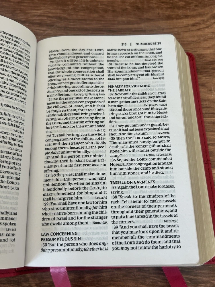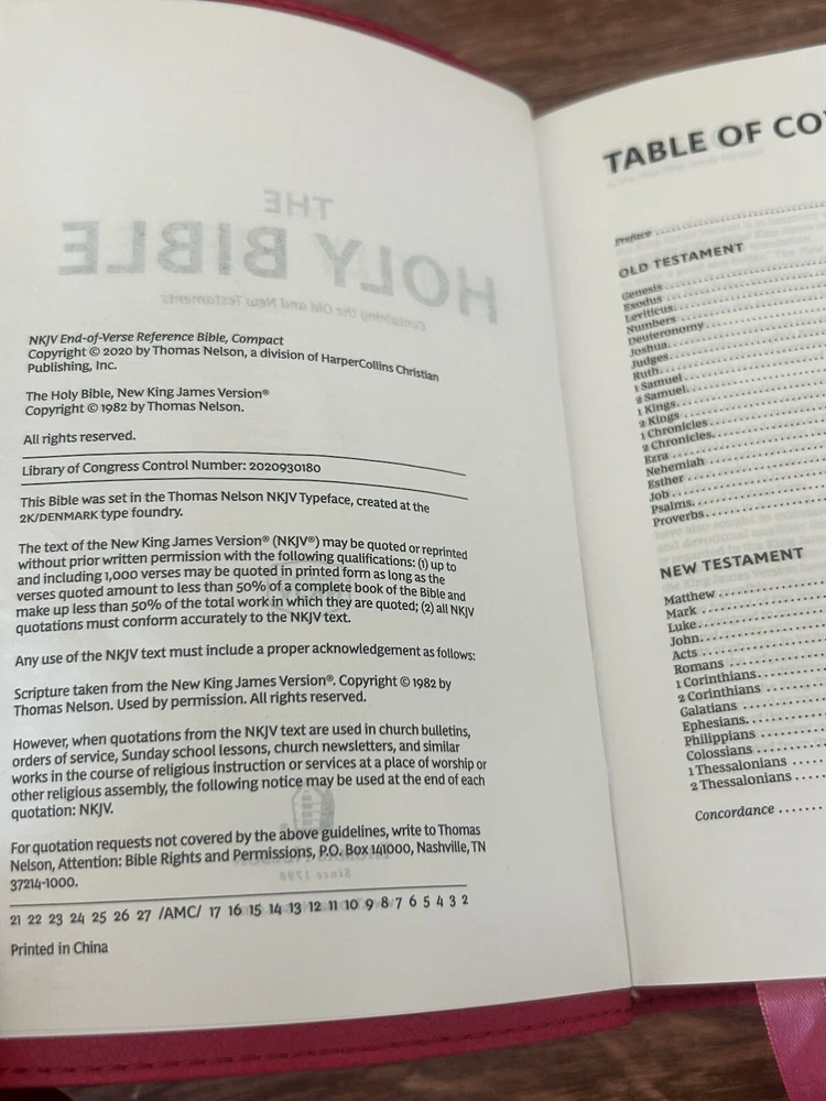 Looks just as described great price packing was great it was wrapped in plastic and mailed in a plastic mailer it was raining when delivered when I got home I was afraid that the Bible would be ruined but it’s was still dry thankfull that it was wrapped in plastic .