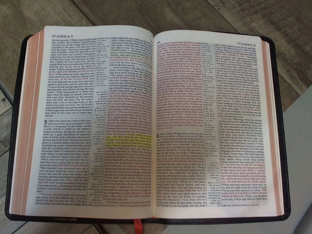 This item was listed as "very good" condition but it should have been listed as "like new" condition. I was very pleased to find the Bible had no writing in it, had a very clean leather cover and in fact looked like it had never been opened. The box was even in great shape on an item from 2013. The packaging could have gotten it to China and back without a scratch. It was shipped the same day as purchase. I love it and am very pleased with this seller.