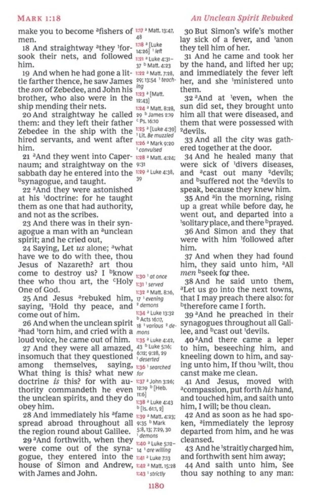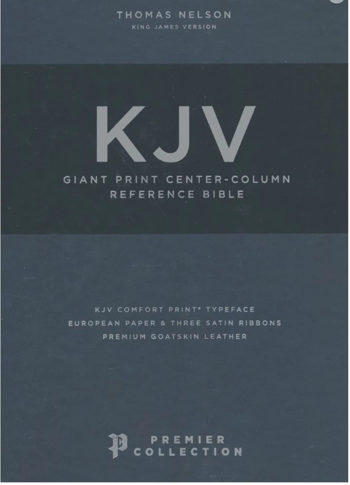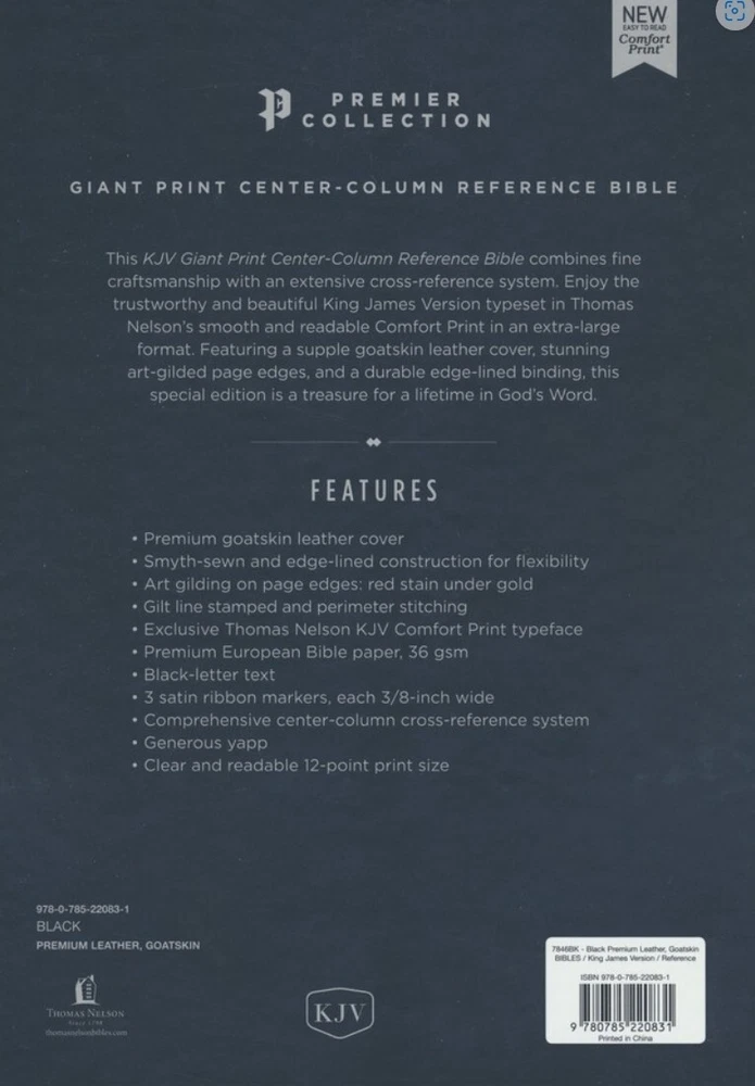 Bible Description: Combining fine craftsmanship with the depth of a complete cross-reference system. Typeset in Nelson's KJV Comfort Print in an extra-large size, you will enjoy a smooth and easy reading experience in a beautiful King James Bible designed to last. Featuring a supple goatskin leather cover, durable edge-lined binding, premium Bible paper, beautiful art gilding, and four ribbon markers, this special edition is a treasure for a lifetime in God's Word. Features include: • Smyth-sewn binding • Fine goatskin cover • Presentation page • Black-letter text • 12-point type • Concordance