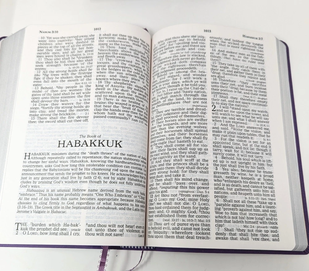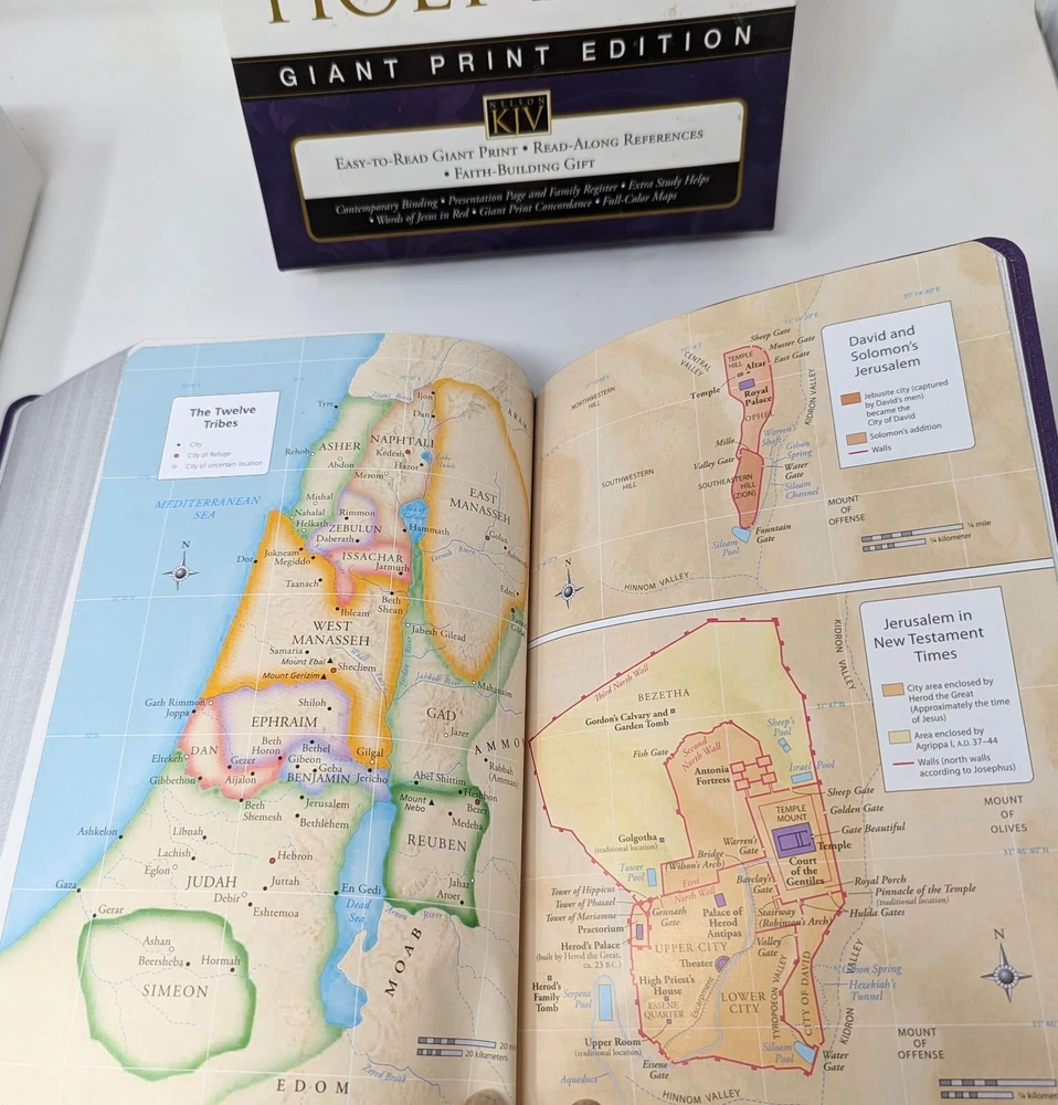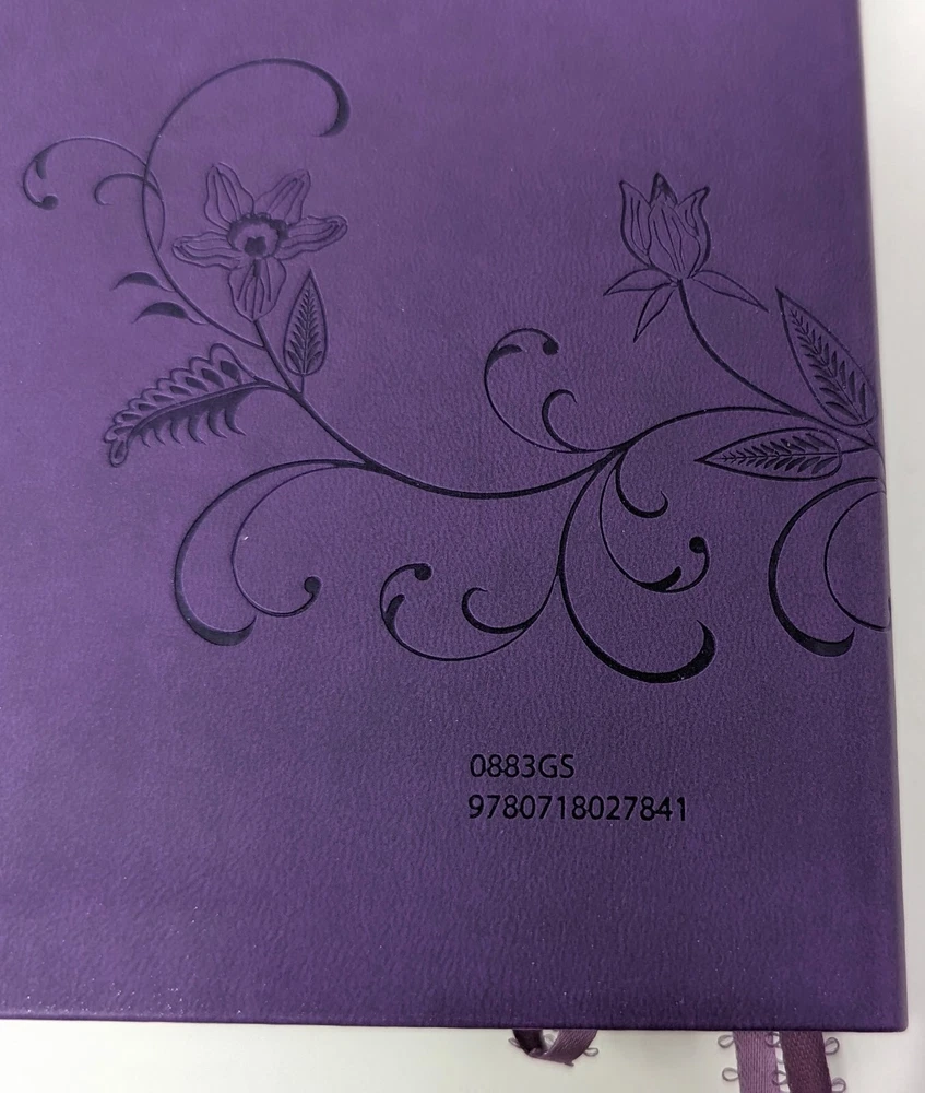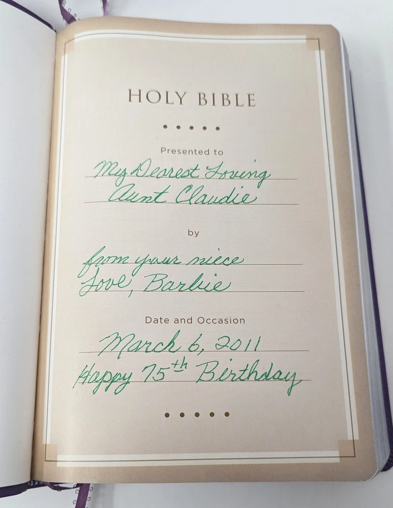 King James version giant print Bible with beautiful deep purple cover that has black scrolling. This Bible appears to be brand new with the exception of the dedication page, which is completed. Otherwise it seems this Bible has not even been opened. Please see photos. Choose your Shipping Thanks for looking! If you have any questions or concerns, please contact me before purchasing / bidding. I sincerely want you to be 100% pleased with your purchase & will do everything possible to make your experience simply perfect. Have a look at my other Holiday, vintage, unusual & collectible listings; I'm always finding interesting things! I do what I can to re-use / recycle packing material and will package your treasure with the utmost care.