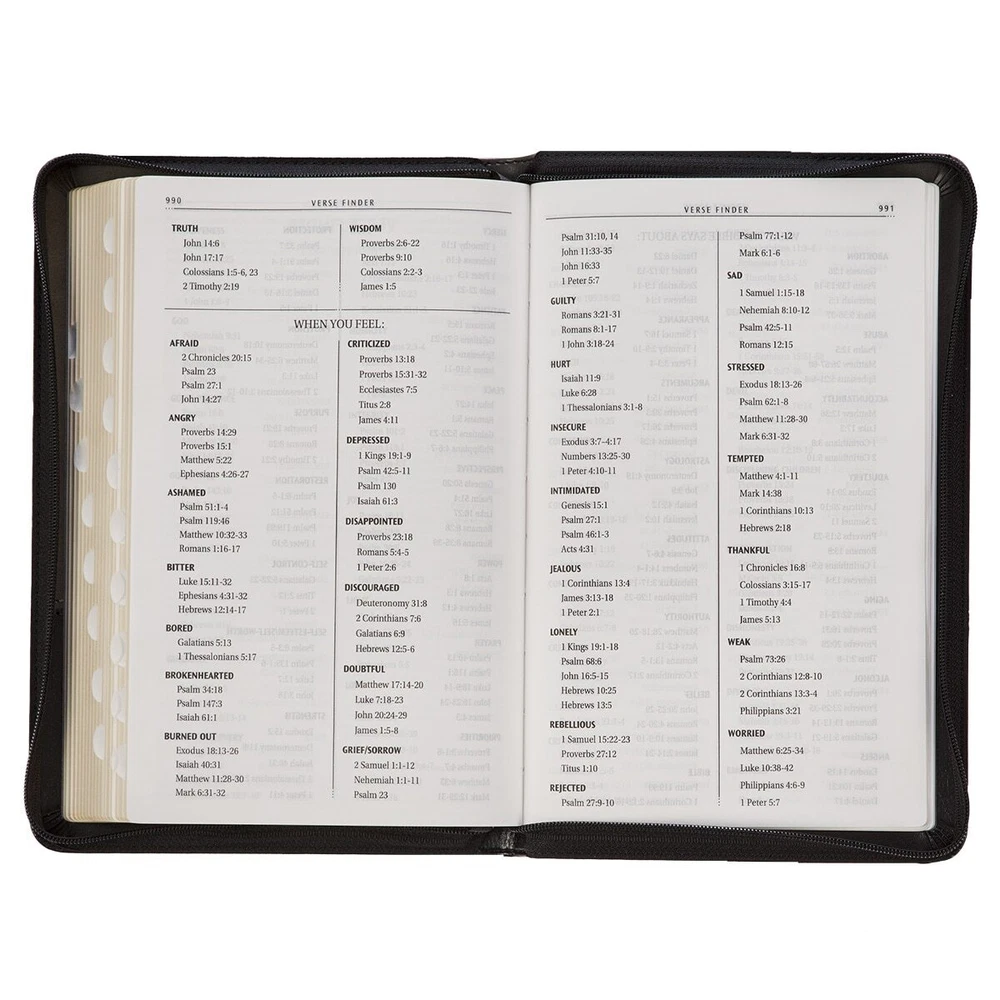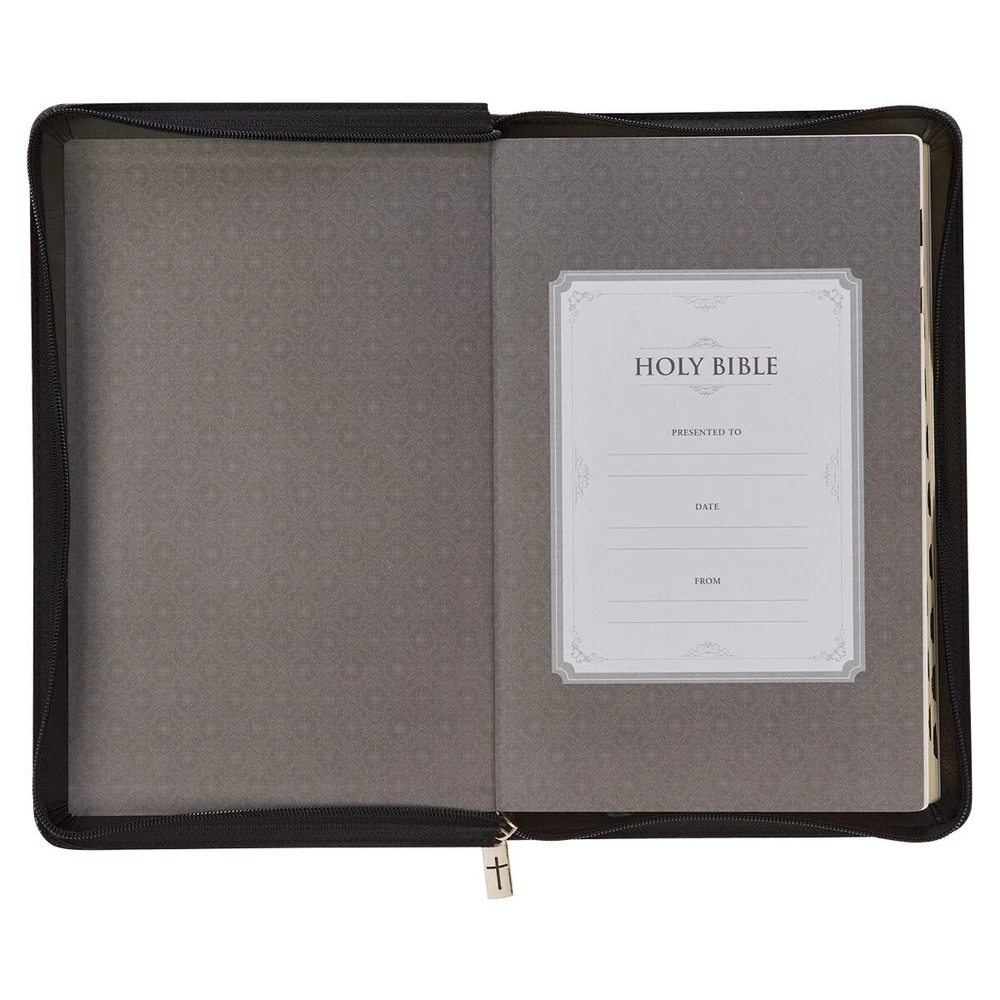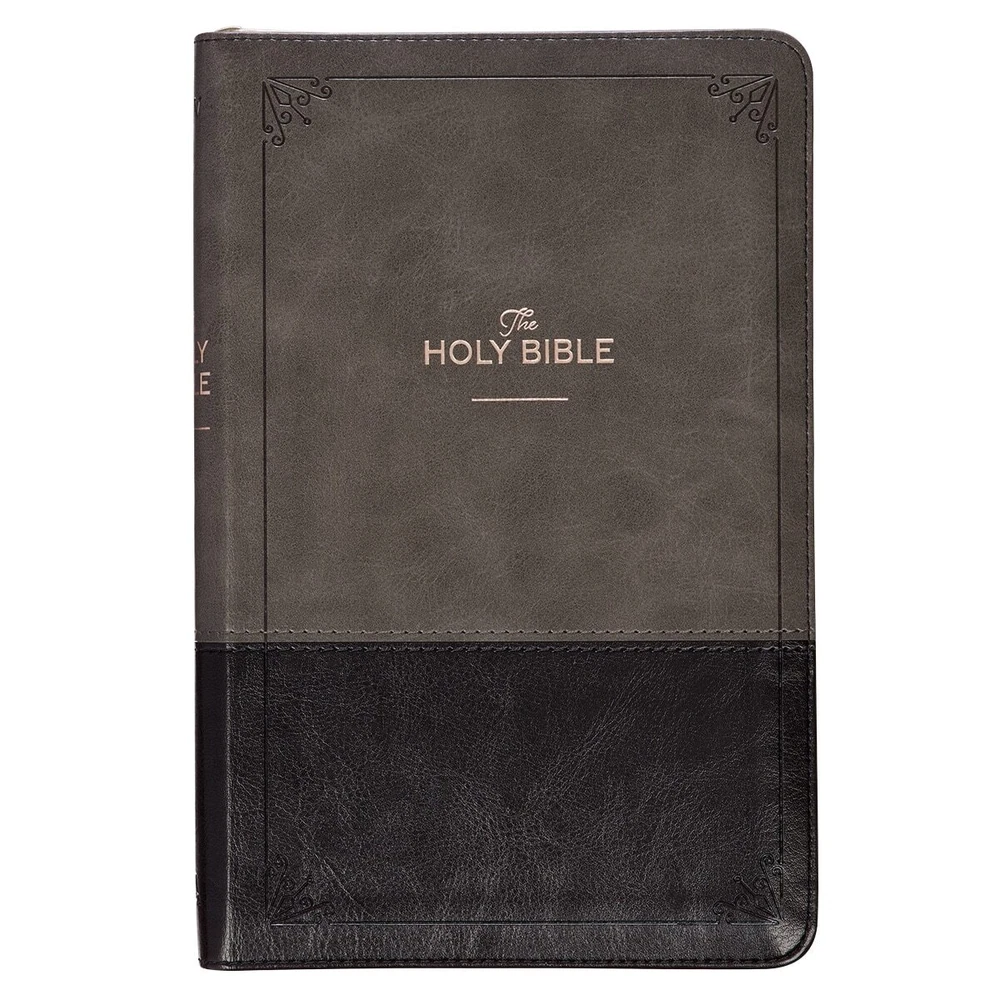 A simple but sophisticated gift, the Gray and Black Faux Leather King James Version Deluxe Gift Bible with Thumb Index and Zippered Closure will help you mark a special milestone in a loved one's faith journey. Visit Storefront Contact Us View Feedback About Our Company KJV Holy Bible Standard Size Faux Leather Red Letter Edition Thumb Index & Ribbon Marker, King James Version, Gray/Black, Zipper Closure Item Details A simple but sophisticated gift, the Gray and Black Faux Leather King James Version Deluxe Gift Bible with Thumb Index and Zippered Closure will help you mark a special milestone in a loved one's faith journey. A simple but sophisticated gift, the Gray and Black Faux Leather King James Version Deluxe Gift Bible with Thumb Index and Zippered Closure will help you mark a special milestone in a loved one's faith journey. A black faux leather panel makes up the bottom third of the Bible's cover and is joined to a gray panel covering the top two-thirds with a double row of topstitching. Four corner scroll details anchor a thin heat-debossed frame that spans the front cover. The title is printed in a simple gold-foiled font underlined in gold foil. The title is styled the same way on the front and spine, and the version reference is heat-debossed on the spine. THE HOLY BIBLE KJV You will find several additions to aid your Bible reading in this Bible: a one-year reading plan, the words of Christ in red ink, reader-friendly subheadings, 8 full-color maps, and a thematic Scripture verse finder. The standard 9-point text is printed in a double-column format. The satin ribbon marker lets you mark your place between the gilt-edged pages, and the lay-flat spine allows the Bible to open completely flat. Two luxury features include thumb indexing to locate any book of the Bible and a zippered closure to secure your loose notes and bookmarks. The Bible comes packaged in a full-color printed cardboard sleeve. The beautiful poetic language of the 1769 KJV Bible is used in this edition. The KJV text has stood the test of time and is still considered one of the most accurate translations 400 years after it was first printed. You will see this rich heritage reflected in the spelling and grammatical structure and note that it deviates from modern usage. Include a thoughtful note on the presentation page in front of this Bible to add a personal touch to your gift. The Gray and Black Faux Leather King James Version Deluxe Gift Bible with Thumb Index and Zippered Closure is the perfect present for a graduating student headed off to college or celebrating a grandchild starting his first job Gray and black faux leather blocked design Heat-debossed frame Gold-foiled title Classic King James Version text Deluxe Gift Bible Zippered closure Attached satin ribbon marker Gilt-edged pages Thumb index Flexcover Lay-flat spine Double-column format Reader-friendly subheadings Words of Christ in red ink Thematic Scripture verse finder One-year Bible reading plan 8 full-color maps Presentation page 1016 pages Text size: 9-point type Packaged in full-color printed cardboard sleeve Size: 9.1" x 6" x 1.1" (231 x 152 x 28 mm) Return Policy To ensure complete satisfaction of our customers, we offer a 30 day return policy for all orders. Please reach out to us if you have any questions and one of our friendly customer service representatives will reply within 24 hours. This excludes weekends and holidays. Shipping Information All orders are fulfilled and shipped within 1-2 business days excluding holidays and will be shipped via standard economy shipping. Please do not hesitate to reach out with any questions. Please Note: Our hours of operation are Monday-Friday, 8am-5pm (CST). All orders received before 2pm (CST) will be processed & shipped within 1-2 business days.* Average transit times are 2-7 business days to the contiguous 48 United States and the District of Columbia. (*Does not apply to holidays or special orders.) Shop Our Storefront | View Feedback | Contact Us | Add Us to Your Favorites