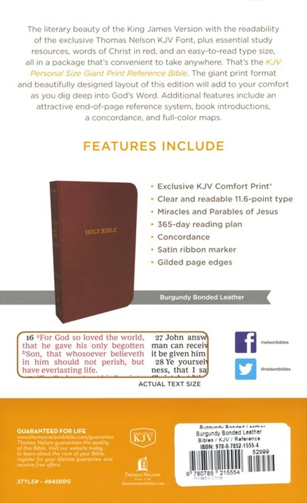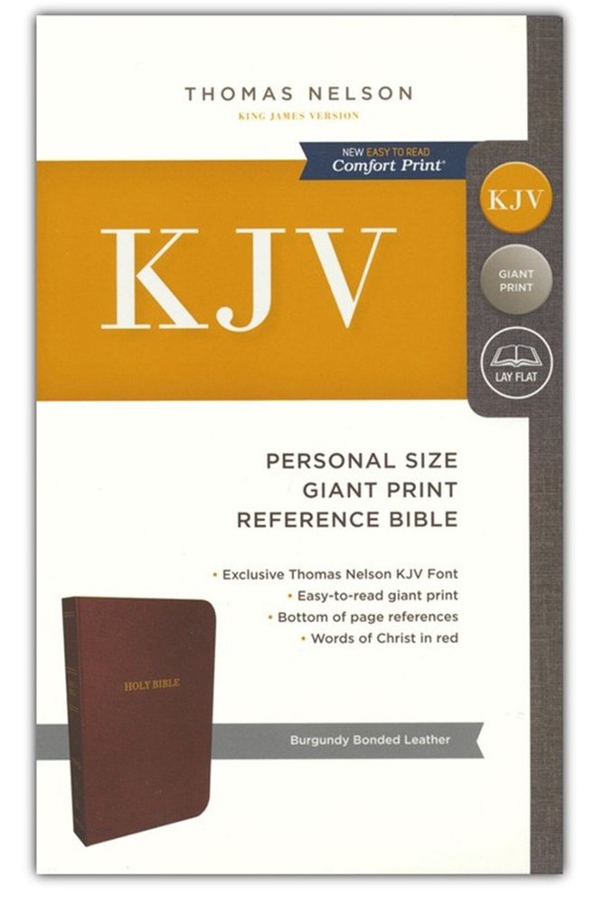 BRAND NEW IN SHRINK WRAP!!! KJV Personal Size Reference Bible Giant Print, Bonded Leather, Burgundy, Indexed Publisher's Description The literary beauty of the King James Version with the readability of Thomas Nelson's custom size 11 KJV font, plus essential study resources, words of Christ in red- that's the KJV Personal Size Reference Bible Giant Print. The giant print format and beautifully designed layout of this edition will add to your comfort as you dig deep into God's Word. Additional features include an attractive end-of-page reference system, book introductions, a concordance, and full-color maps. Features Include: Beauty and clarity of the new Thomas Nelson KJV Font End-of-page references Double Column Presentation page Bible book introductions Miracles and parables of Jesus Bible reading plan Words of Christ in red Concordance Full-color maps Ribbon marker 11 point print size Product Information Title: KJV Personal Size Reference Bible Giant Print, Bonded Leather, Burgundy, Indexed Format: Bonded Leather Number of Pages: 1728 Vendor: Thomas Nelson Publication Date: 2017 Dimensions: 8.50 X 5.40 (inches) Weight: 1 pound 15 ounces ISBN: 0785215557 ISBN-13: 9780785215554 References: End-of-Page Text Color: Red Letter Text Size: 11 Point Thumb Index: Yes Ribbon Marker: Yes Spine: Sewn