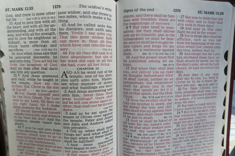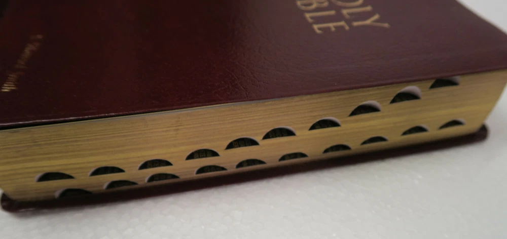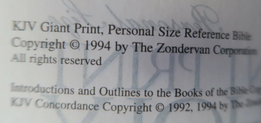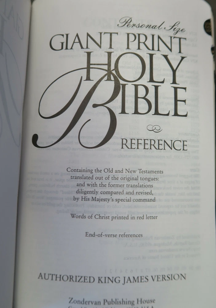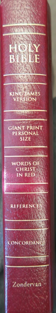KJV Reference Bible 1994 Giant Print Maps Concordance Red Letter Leather Look. Initials on cover. The KJV Reference Bible 1994 Red Leather-Look Large Type/print. References. Concordance. Maps Like-New Condition. I am the first to open the bible for photos. Gold gilt page edges, chapter tabs, & word of Christ in red letters. Published by Zondervan.