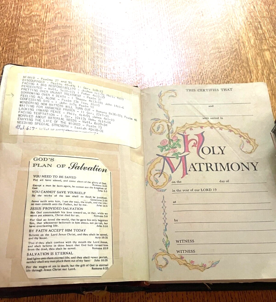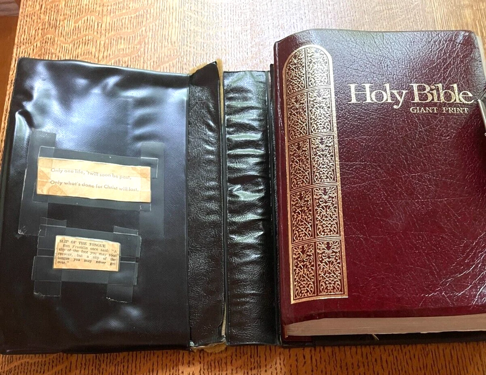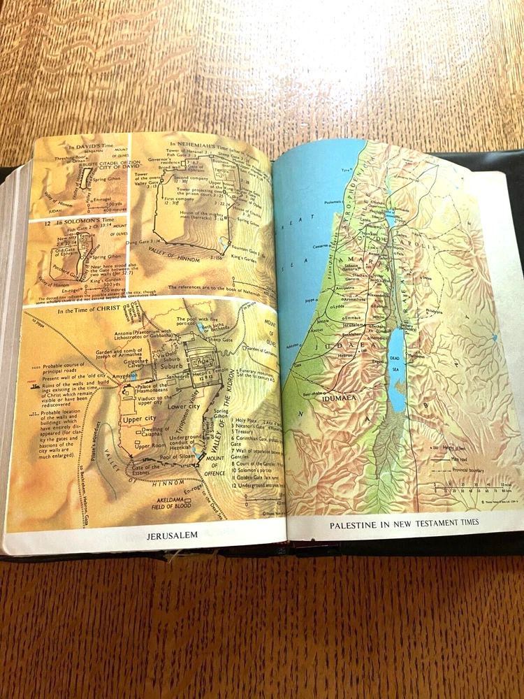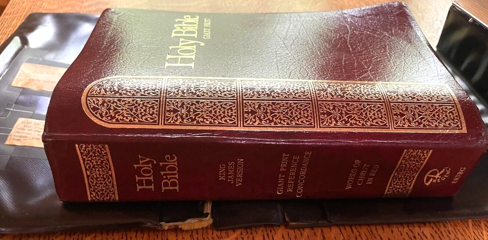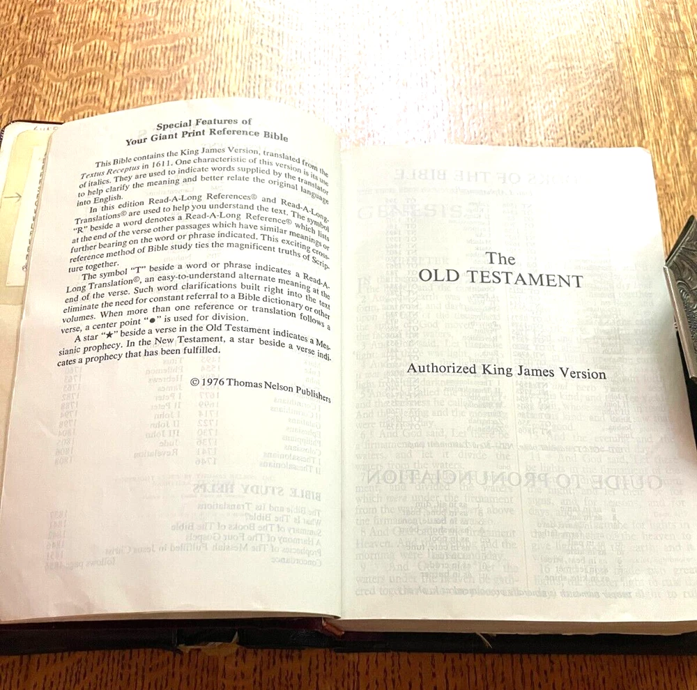 ESTATE ITEM: The estate was a minister and his wife. I believe this bible to have been hers. The leather jacket she had her bible in has a tear but does not deflect from the security of keeping the bible from damage. She did personalize this bible with some writings and other things. Selling as is. Please see pictures. Get ready to own a piece of history with this vintage Holy Bible in KJV translation. This genuine bonded leather book features Giant print, a dust jacket, and beautiful illustrations (Pictures), making it a great addition to any collection or a perfect gift for a religious friend or family member. The Reference Edition includes a concordance for easy reference and personalization options are available. This book is a must-have for anyone interested in religion, Christianity, or the Bible. Don't miss out on the chance to own this rare gem of a book. Words of Christ in Red. Maps in back of bible. About Me: I work full time plus. I do eBay as a hobby as I love to go to estate sales and sell items from my own collections. I use and buy only new and clean packing material (bubble wrap, paper, tape, peanuts, etc.) I do not use dirty or used packing material. All my items are clean and well packaged. I take a lot of time to take pictures, describe item to the best of my ability, buy and pick up items and wrap them safely and cleanly. I only ship USPS priority mail and I ship next day. Thank you for considering buying my items.