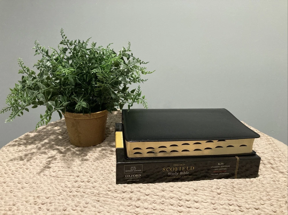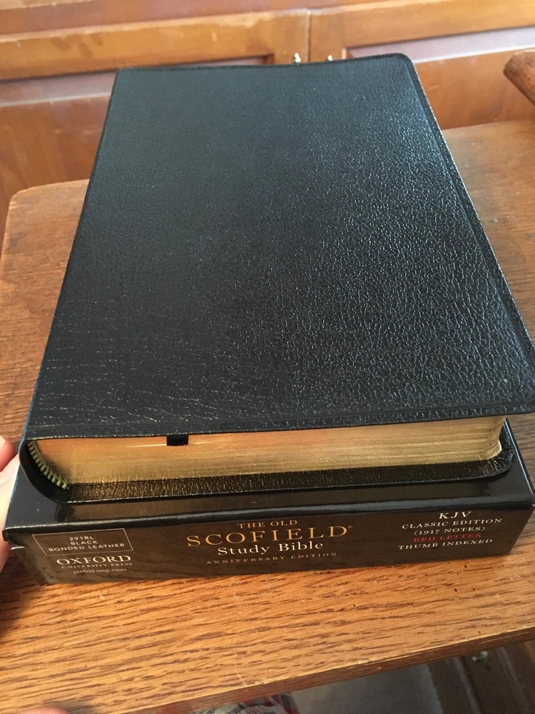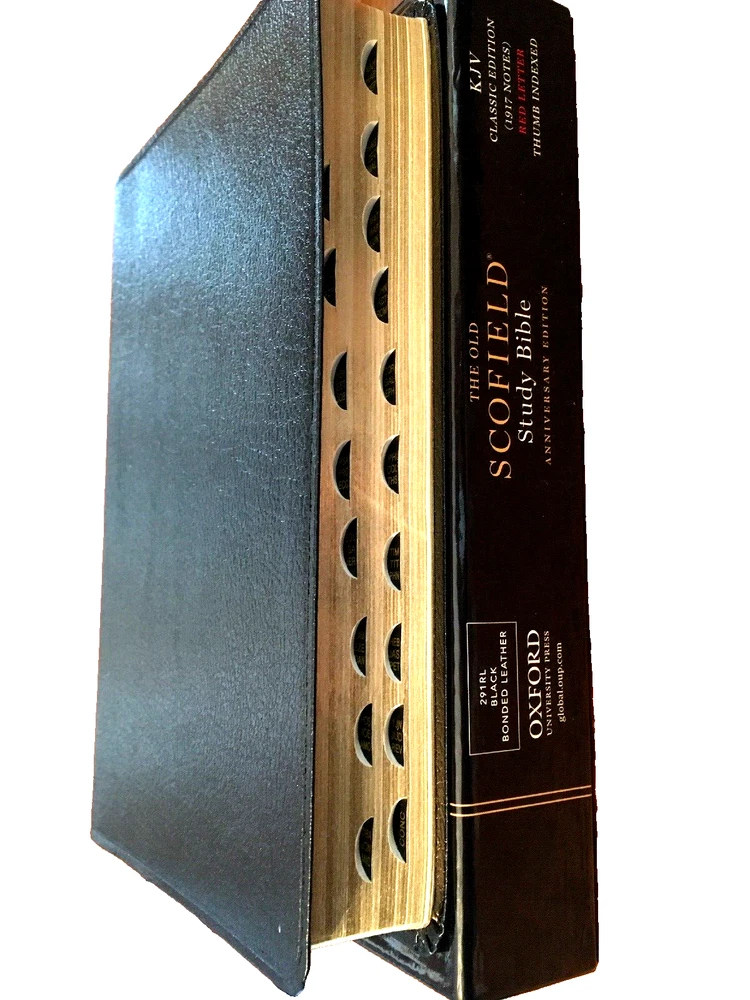King James Version Old Scofield Study bible!! *Smyth Sewn (Quality Binding) *Black bonded Leather *Red Letter Bible (Words of Christ are in RED) *8 point font size (Medium) *Measures: 8.75 x 6 x 1.25 inches *Thumb-Indexed Dear Valued Customer! Feel free to ask any questions you have. I try to answer questions within 24 hours. (Often within 1 hour). Explanation of shipping methods: Standard - media mail. Usually takes 2-4 weeks. (if you live in Hawaii or Alaska, expect 4-6 weeks) Expedited - (about $5-$10 more) - priority mail. Usually takes 2-3 days...4 at the most. If you have questions about shipping, please ask. I will be glad to explain it. International customers - If you would like to combine shipping and save lots of money when purchasing several items - message me BEFORE you purchase the items. I cannot combine shipping after the purchase has been made. I offer hassle free returns. If for any reason you are not satisfied with your purchase, you may return the item for a refund. If the item is not as described or was damaged in shipping, I will pay all shipping costs. If you have changed your mind about the purchase, (you just didn't like it/changed your mind about the purchase) I will still issue a refund, but I can not pay for the return shipping or the cost of shipping it initially. Please buy responsibly :) And of course, if you have any concerns with your purchase, please reach out to me and I will try to do my best to help. I strive for 100% positive feedback.