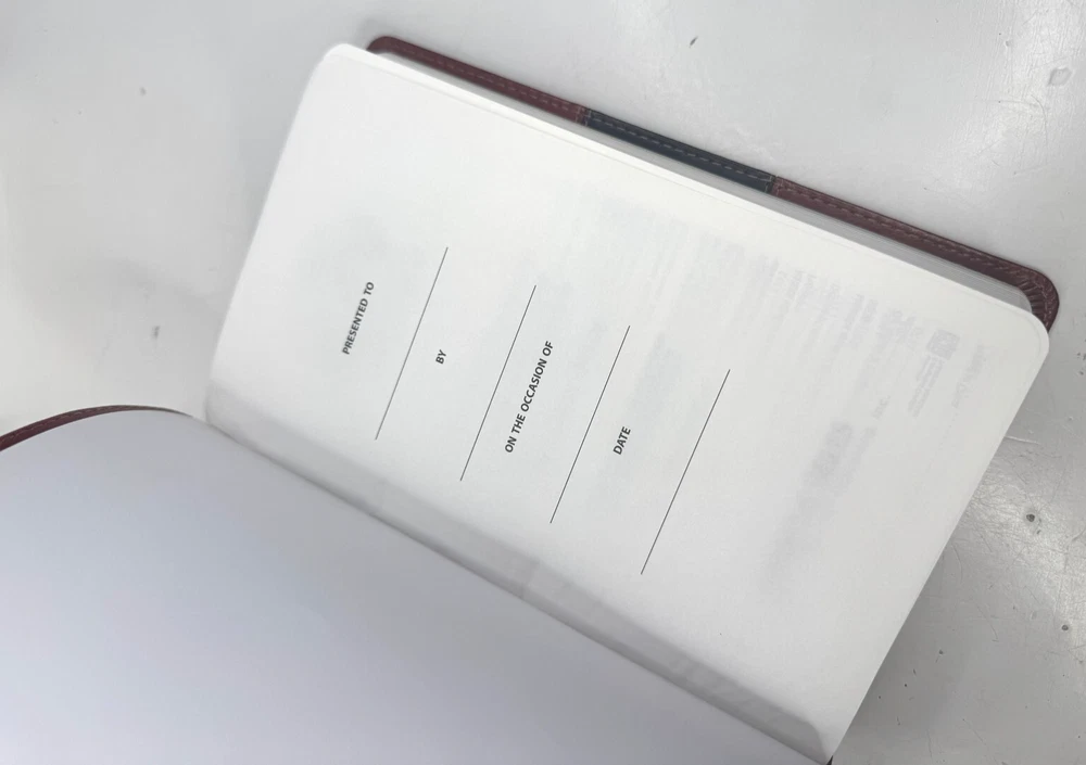 The Bible is an excellent solid clean tight condition. The best I can see pages have not been written on. The three minor issues I can see are: Top left corner cover jacket small tear. Back couple pages bottom corners wrinkled / small tears. Bottom side pages slight dusting. See pictures for further description.