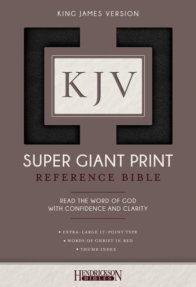 FAST SHIPPING HASSLEFREE RETURNS SECURE PAYMENT EXCELLENT SERVICE Description Read the Word of God with confidence and clarity! The brand-new King James Version Super Giant Print ReferenceBible , with generous 17-point type, is a readable choice for thosewho need a larger font. Competitive pricing and many excellentfeatures set this beautiful Bible apart, and make it a welcomeedition to Hendrickson s KJV Bibles line. Features: 17-point type larger than most Bibles on the market Thumb indexed editions Words of Christ in red Family Tree page End-of-verse cross-references Dictionary and concordance of key words, people, places, and ideas Full-color maps Daily Bible Reading Plan Key Bible Promises Personal presentation page Miracles and parables of the Old and New Testaments Let the magnificent language of the King James Version which has stood the test of time for over 400 years stand firm in your heart. " Publisher : Hendrickson Publishers Language : English Leather Bound : 2000 pages ISBN-10 : 1683070208 ISBN-13 : 978-1683070207 Item Weight : 3.35 pounds Dimensions : 6.9 x 2 x 10.8 inches SHIPPING Shipping All items fast! The majority of orders are shipped using USPS Priority Mail and UPS Ground if requested. There is an option at checkout to add a Signature of Delivery for extra security & peace of mind. This means you need to sign for your parcel. If you are not home, the courier will take it to your local post office for collection. We also offer expedited shipments upon request, we will quote the shipment and let you know of the estimated cost. If agreed we will process the order and add the shipping charge to your invoice. All items ordered by 3 PM EST will be shipped same day. We also are partnered with Ebay using the Global Shipping Program. We will ship internationally to any country that is a part of the program. "International buyers – please note: Import duties, taxes, and charges aren't included in the item price or postage cost. These charges are the buyer's responsibility. "Please check with your country's customs office to determine what these additional costs will be, prior to bidding or buying." Alaska/Hawaii/Puerto Rico charge extra : $30.00 Canada $50.00 *Additional taxes may apply Every item we ship is fully insured. You will receive a shipment confirmation and tracking number as soon as your item leaves our facility. We offer same day shipment for orders submitted before 2:00 pm EST. Should an item arrive with damaged packaging, or if the item was damaged during shipment, you must contact us within 24 hours of receiving your item. You can email us during our business hours at (email address). In the case of return due to a manufacturer defect, the cost of return shipping will be free. All items must be returned within 30 days of the purchase ship date. Please note that we do not refund the cost of shipping for returns and exchanges. If you received free shipping, the cost that we paid to ship the item to you will not be refunded. PAYMENT We accepts the following methods of online payment: Visa, Mastercard, Discover, American Express, PayPal, and store credit. We also accept wire transfers on orders above $2,000.00 as well as certified checks. Please cantact us for this type of payment. Security RETURNS If you are not 100% satisfied with your purchase you may return your item within 30 days from the ship date. A full refund will be issued only if: The item is never worn. The item's plastic protectors and stickers are all intact and have not been removed. There have been no sizing changes. Please note that we do not refund the cost of shipping. The price to ship your return will be deducted from the total refund amount based on the original shipping method. If you received free shipping, the cost that we paid to ship the watch to you will not be refunded. Any items being returned to us must be clearly labeled with the authorization number given to you by our customer service team. Please include the reason for your return within the return package. Packages that are shipped collect or improperly labeled will be refused. Your item(s) must be return shipped through a courier that can be tracked such as UPS, FedEx or USPS with insurance and delivery prepaid. The customer is liable for any damages or lost packages during transit to us. Any items returned to us may be subject to a 20% restocking fee. The refund price (after restocking and shipping fees are deducted) will be issued to you via the original method of payment for your purchase. FEEDBACK Our all customers are 100% satisfied. If you have any issues with your orders, please contact us to resolve it. We are happy to help you EXCHANGE CANCELLATION You need to send us an order cancellation request through eBay before the shipment made. once we have the request, we will approve it from our end and grant your full refund back to your account. CONTACT US Please send us an email via ebay. We will reply within 24 hours. Copyright © | All Rights Reserved