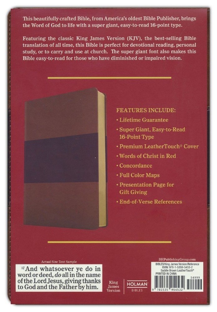 BRAND NEW IN SHRINK WRAP!!! KJV Super Giant Print Bible Saddle Brown LeatherTouch BRAND NEW in Shrink Wrap!! Publisher's Description The KJV Super Giant Print Reference Bible is an excellent Bible for those who are challenged by impaired vision. The super giant print, in an easy-to-read 16-point type, will enable those with any challenges to their eyesight to enjoy reading God's Word with minimal interruption or frustration. Ideal suited for personal study or for use at church, Scripture is now accessible for anyone, anywhere; in the KJV Super Giant Print Reference Bible . Features: Easy-to-read typeface Smyth-sewn binding Presentation page Two-column text End-of-paragraph cross-references Topical subheadings Concordance Full-color maps Words of Christ in red 16-point type Product Information Title: KJV Super Giant-Print Reference Bible--soft leather-look, charcoal Format: Imitation Leather Number of Pages: 2208 Vendor: Holman Bible Publishers Publication Date: 2020 Dimensions: 10.25 X 7.0625 X 1.97 (inches) Weight: 3 pounds 11 ounces ISBN: 1535954531 ISBN-13: 9781535954532 References: Cross References Text Layout: Double Column Text Color: Red Letter Text Size: 16 Point Thumb Index: No Ribbon Marker: Yes Spine: Sewn Page Gilding: Gold