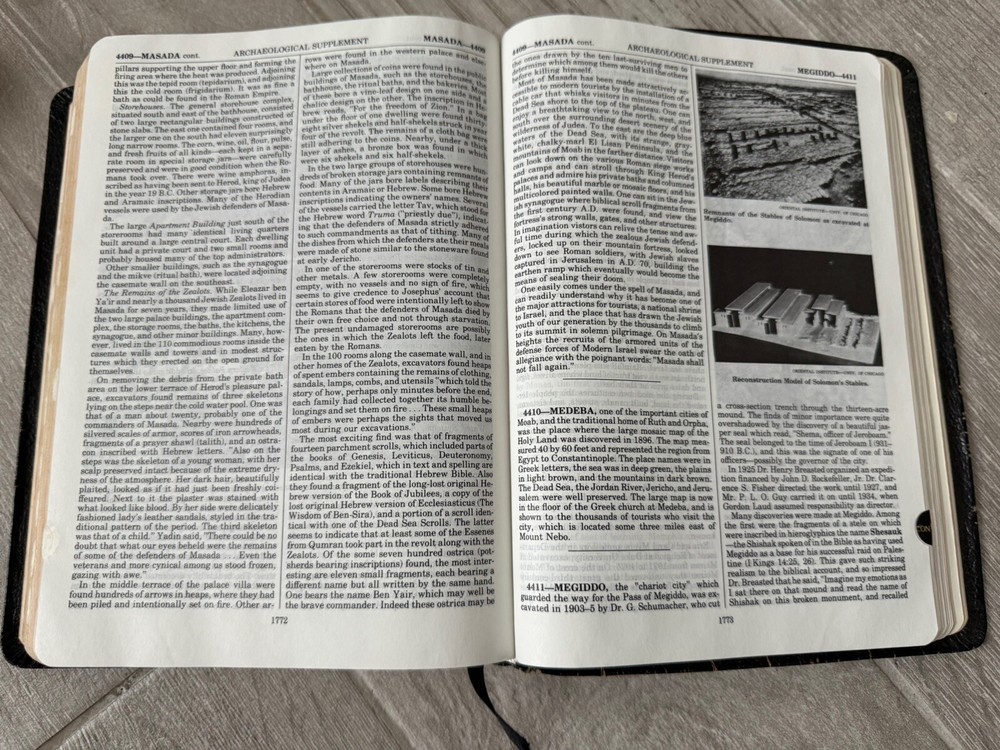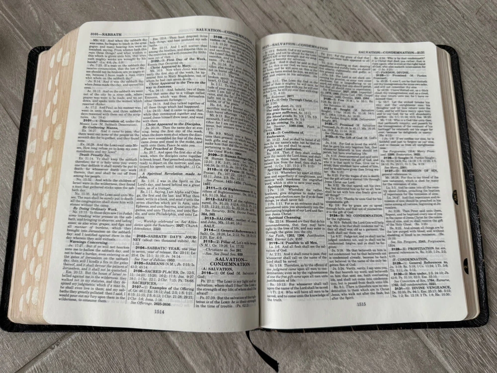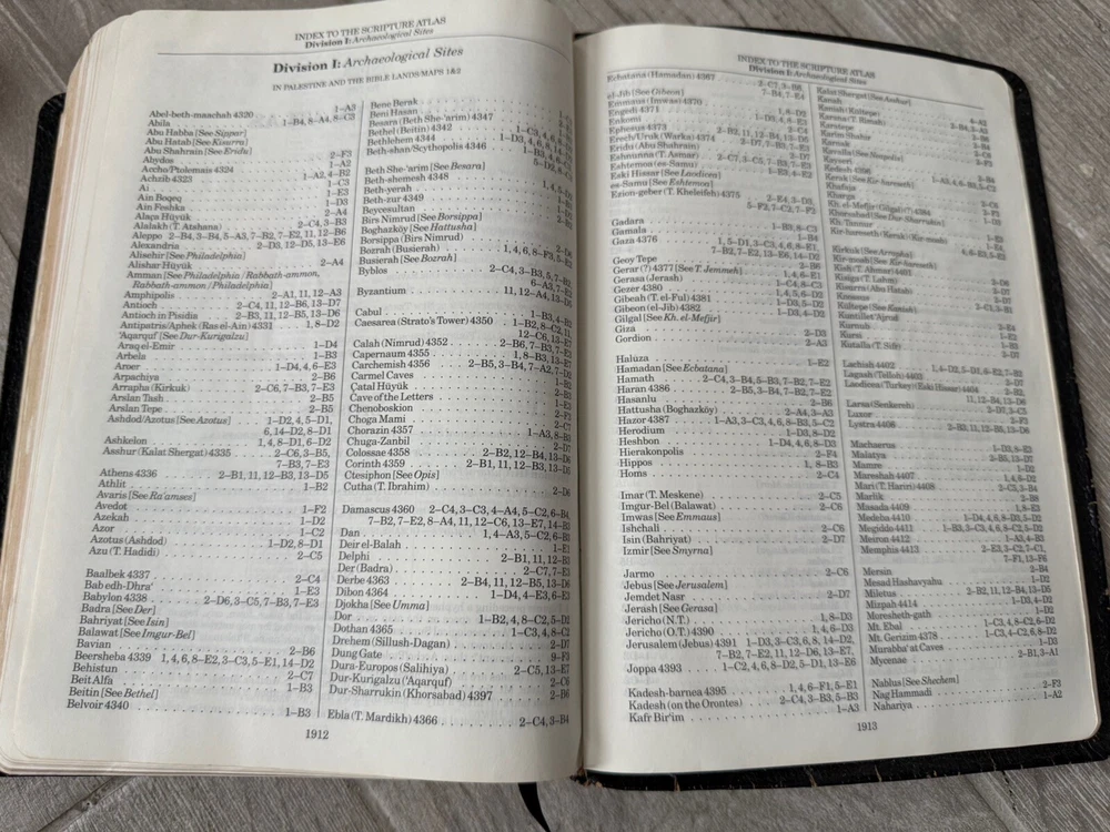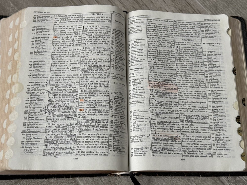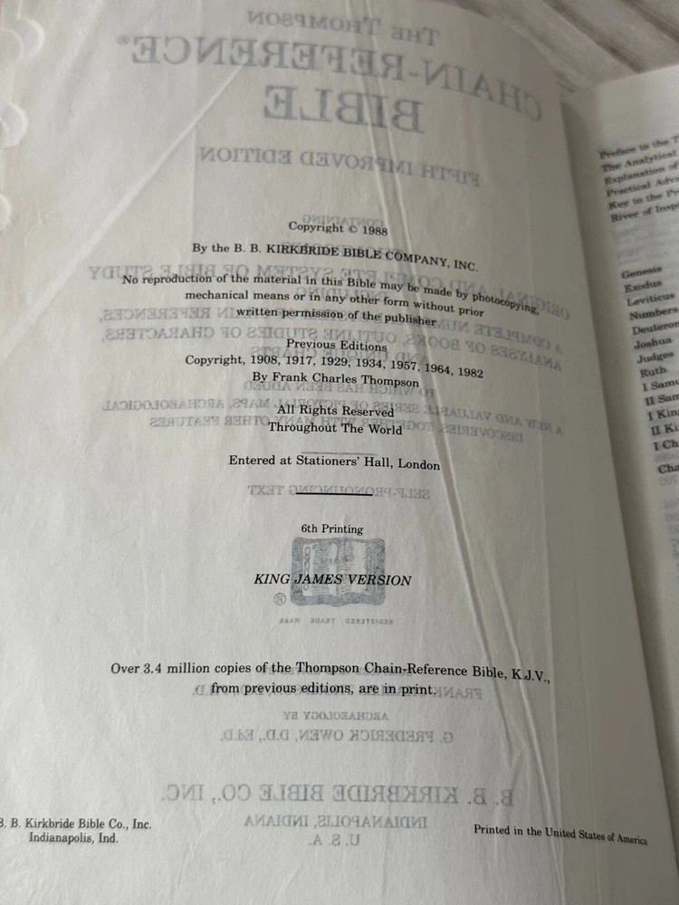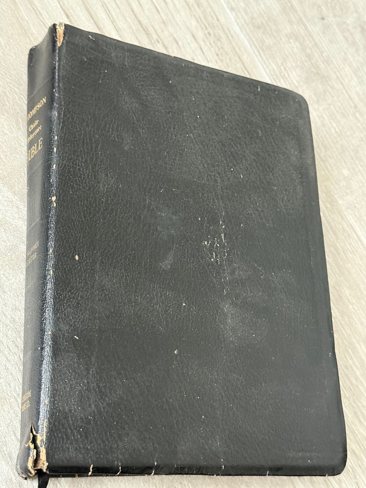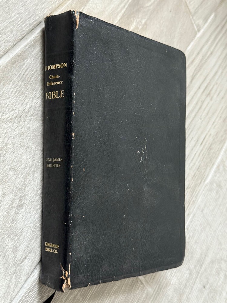 (250106) This in depth and popular study Bible is going to be a perfect addition to your collection! The cover has a nice shine with some wear and a few small tears from typical handling. The back cover has a name inscribed on it. The pages appear to be clean (no writing no highlighting). The spine and binding are in good shape. This vintage KJV Thompson Chain Reference Bible, Fifth Improved Edition from 1988 is a genuine leather-bound study Bible. It features a narrative type of nonfiction with the original languages of Hebrew and Greek. The book was published by B.B. Kirkbride Bible Co. in the United States and edited by Frank Charles Thompson. With its leather binding and comprehensive reference system, this Bible is a valuable resource for those interested in Christianity and biblical study.