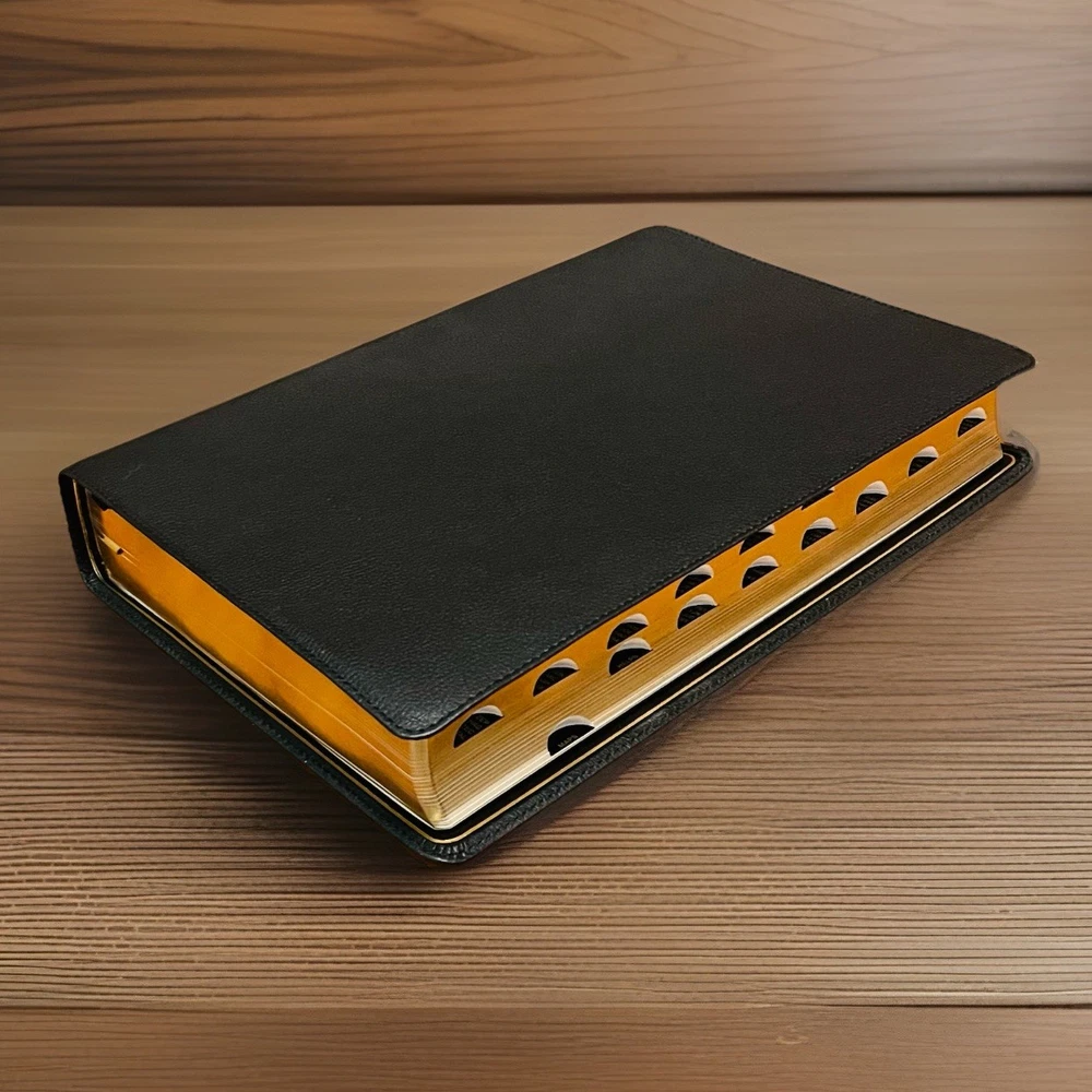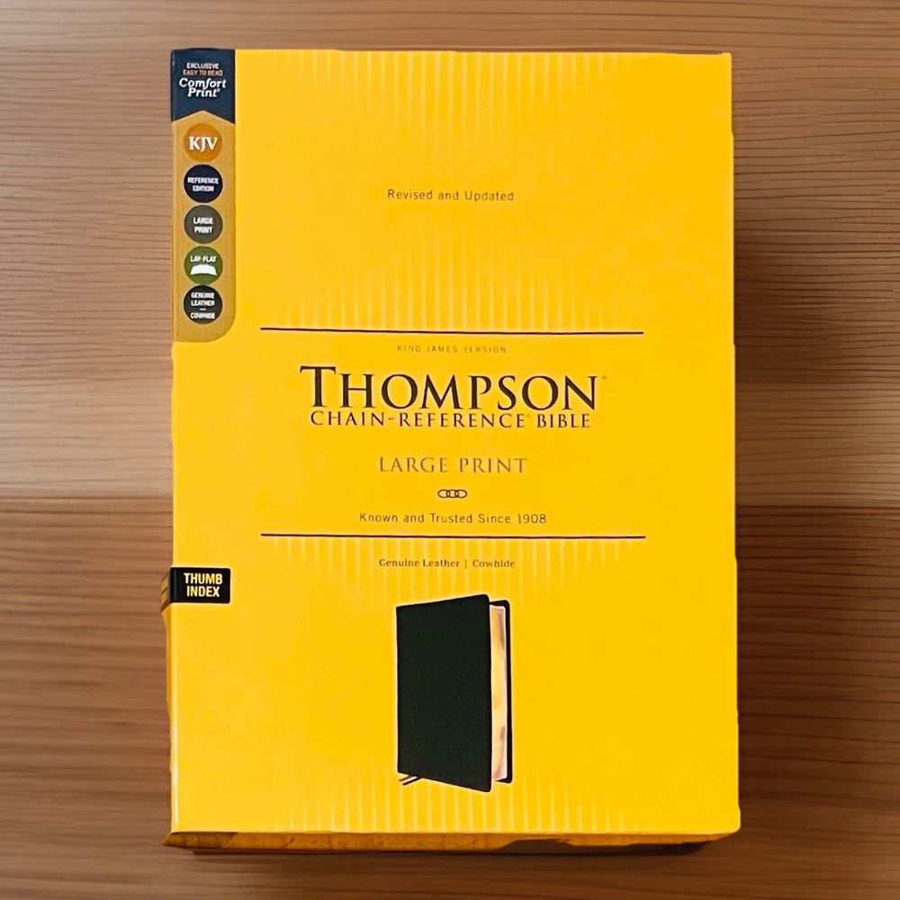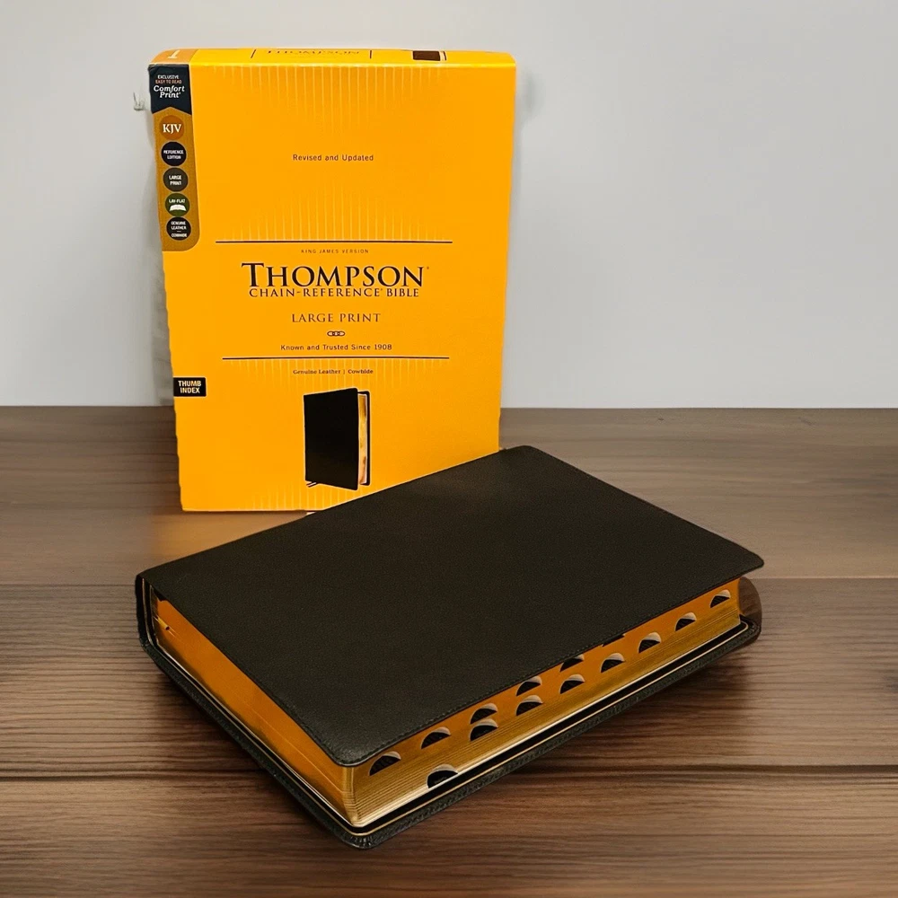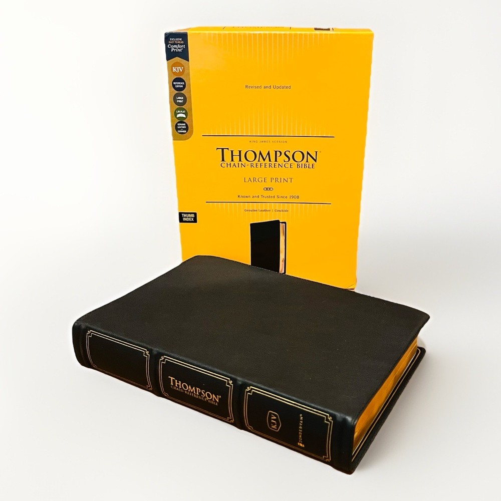 The KJV Thompson Chain-Reference Bible's highly structured and organized cross-reference system has been refined and updated through the years to deliver a reading and study experience. Features: • Complete text of the King James Version (KJV) • Easy-to-understand chain-reference system with over 100,000 references • Alphabetical and numerical indexes highlight study materials for over 8,000 topics, each with its own topic number, for exhaustive topical study • An extensive study resource section includes biographical sketches, illustrated studies of the Bible, a concordance, Bible harmonies, and many other helpful study tools • Fresh, two-color page design • 66 book introductions • 16-page full-color map section with map index • Line-matched text for enhanced readability • Words of Jesus in red • Presentation page for gift-giving • Art gilded page edges • Raised spine hubs • Two double-sided satin ribbon markers, each 3/8-inch wide • Genuine leather cover lies flat when open • Thumb indexed to make finding the books of the Bible easier • Exclusive KJV Comfort Print typeface • Print size: 10.5