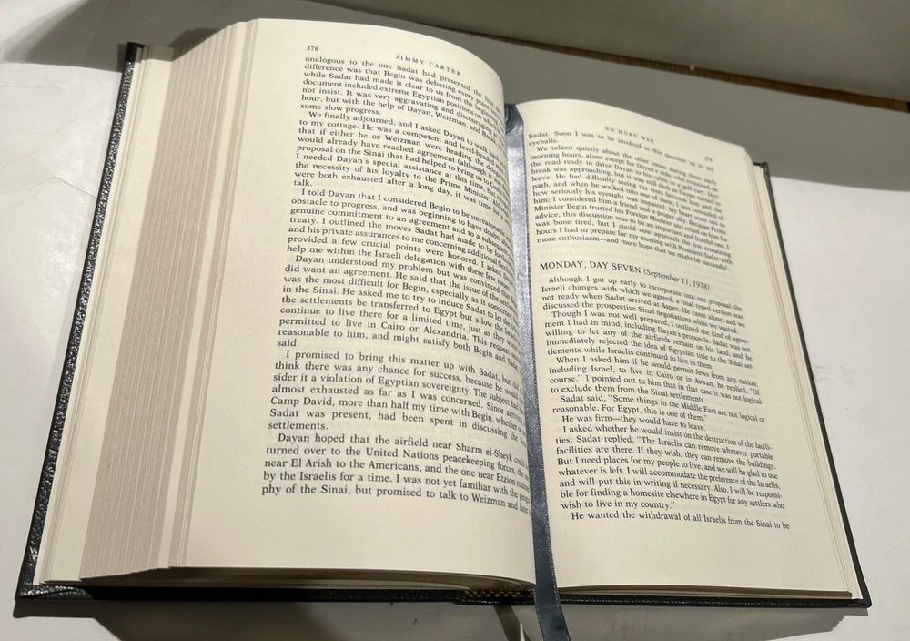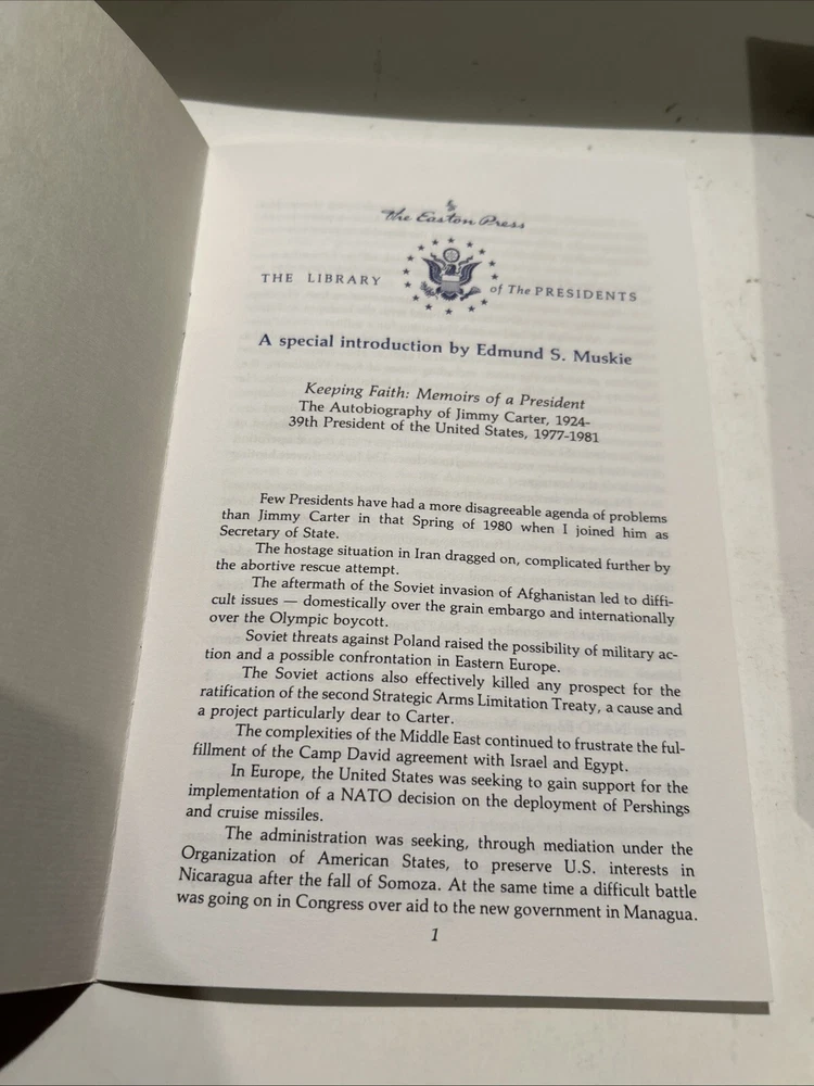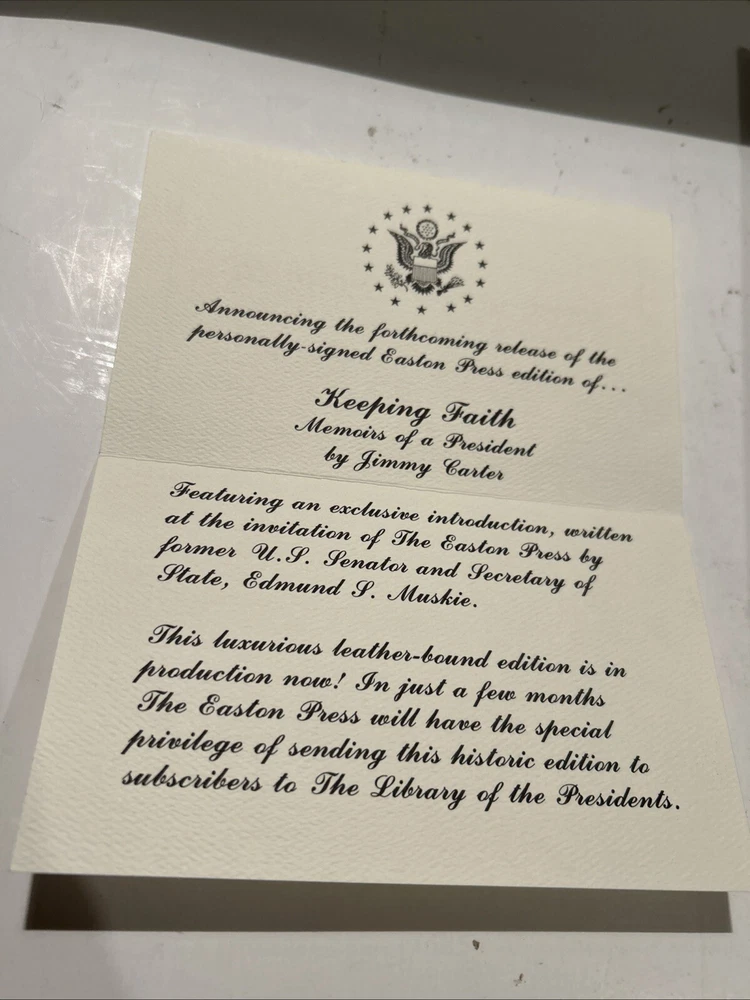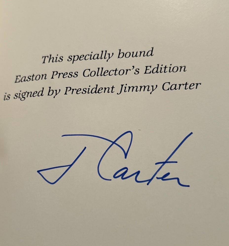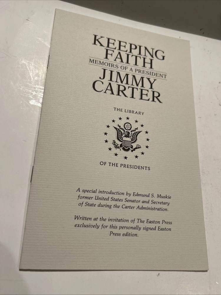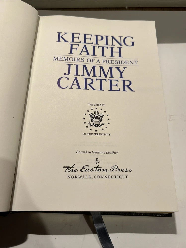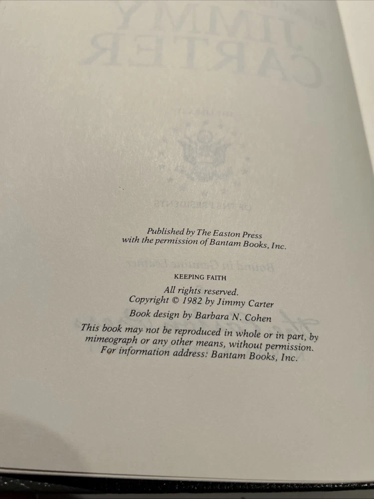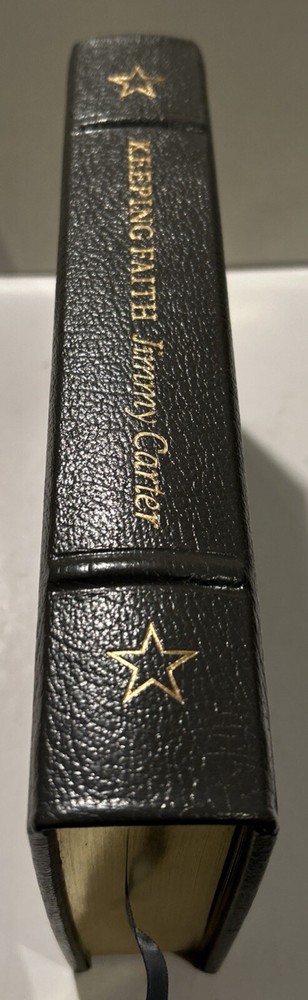 Keeping Faith by Jimmy Carter. 1982 Signed Genuine Full Leather copy published by Easton Press as part of their Library of the Presidents. Includes original inserts and book plates. Easton Press books are printed on archival quality acid-neutral paper and bound with premium genuine leather in the U.S.A. This book has gilt design and 22k gold accents on the hubbed spines. Check out my store for my other of Easton Press Presidential Library listings. ITEM CONDITION NOTES: Excellent like new condition. PLEASE SEE ALL PHOTOS BEFORE BUYING. Calculated Shipping via USPS Media Mail or Carrier of Buyer's Choice (UPS Ground, FEDEX Ground or Home Delivery, USPS Priority Mail).